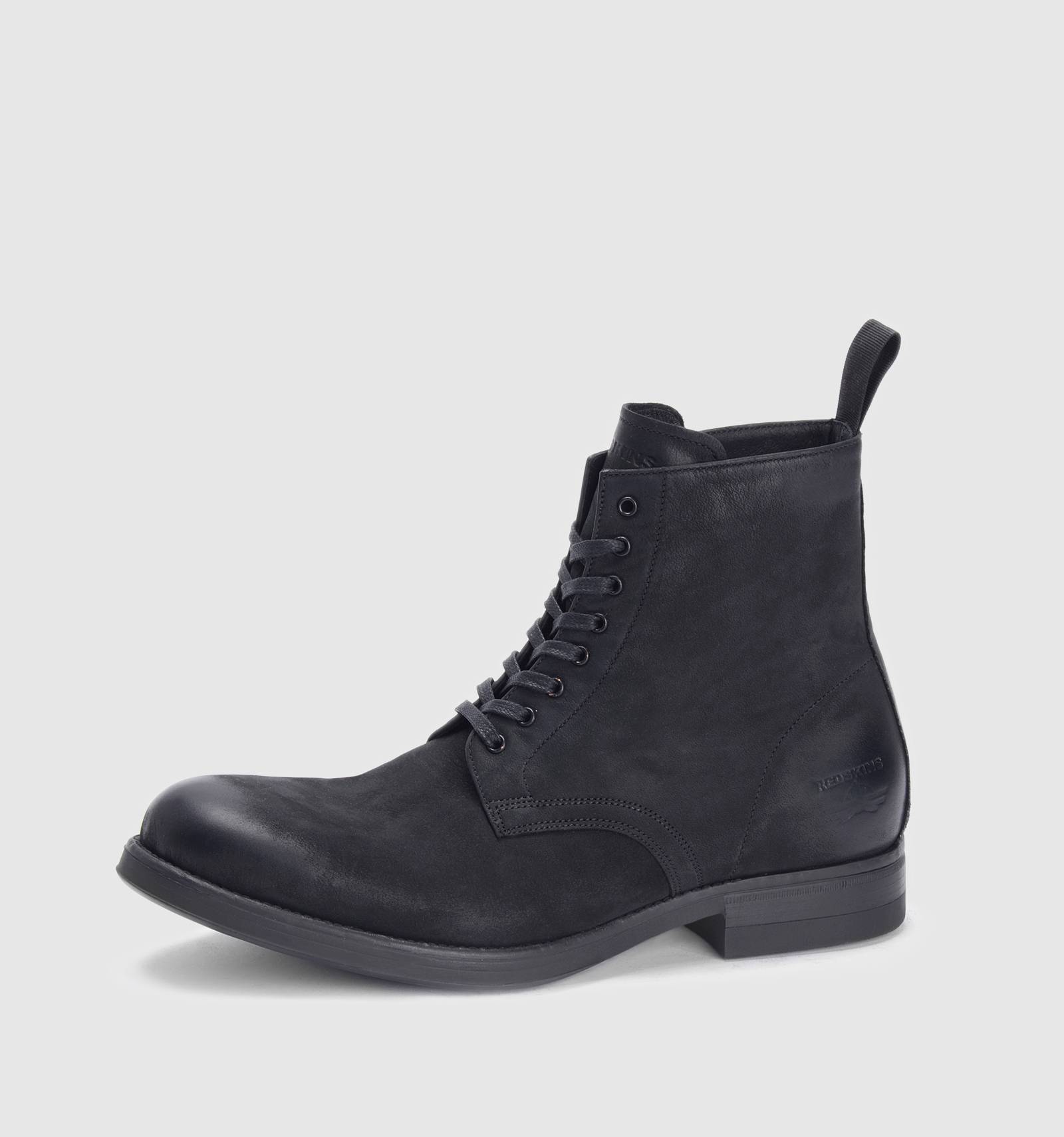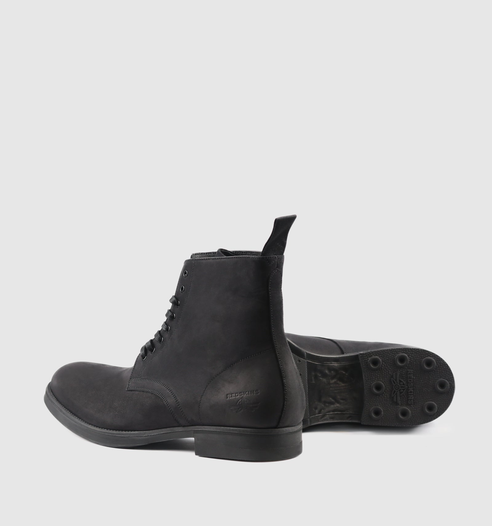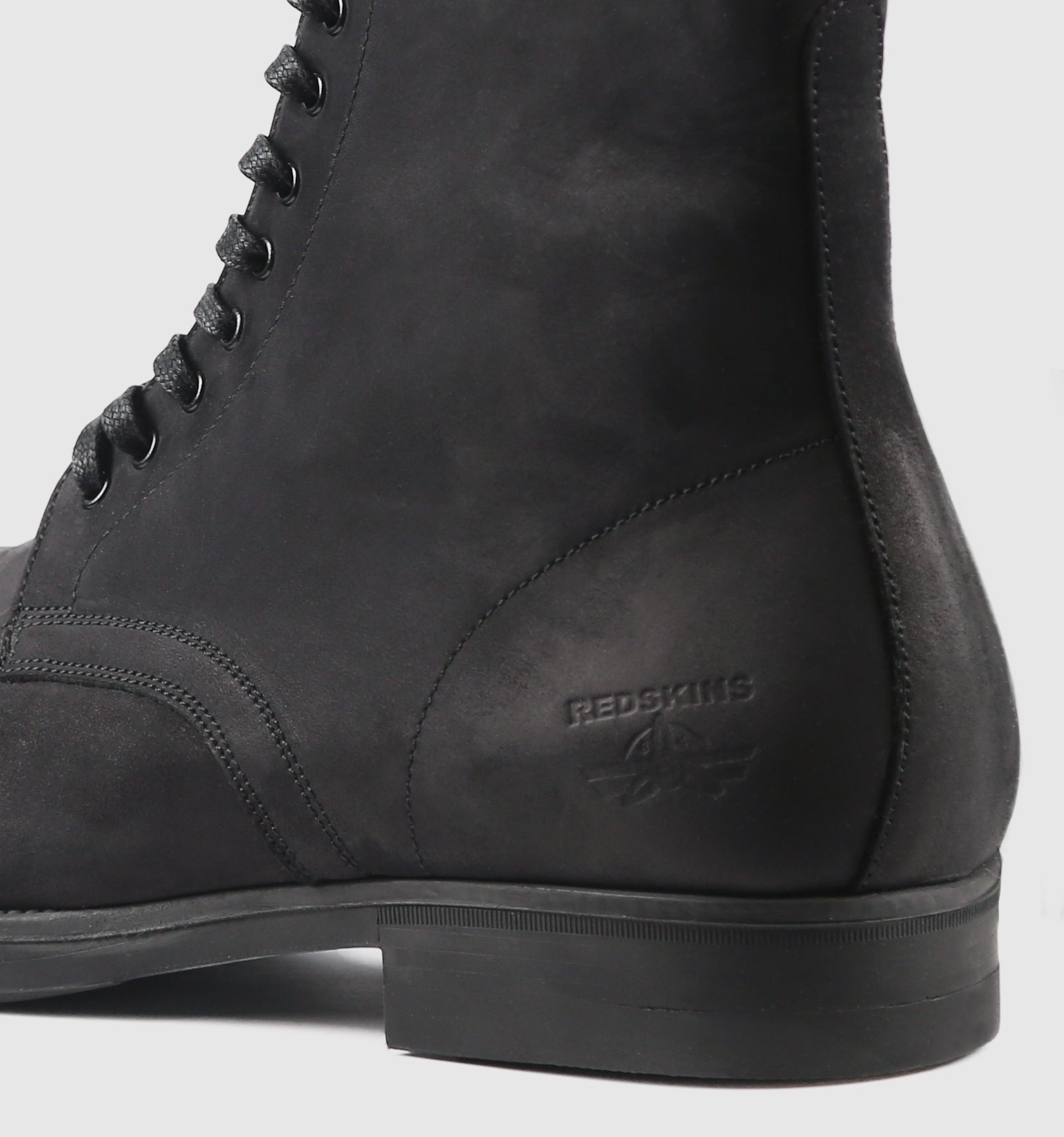 Pièce incontournable de l’hiver, la bottine SERVOL associe une coupe type rangers à un nubuck noir patiné. A lacets et disposant d’une langue à l’arrière de la cheville, sa touche finale est apportée par l’écusson REDSKINS, poinçonné au bas du talon