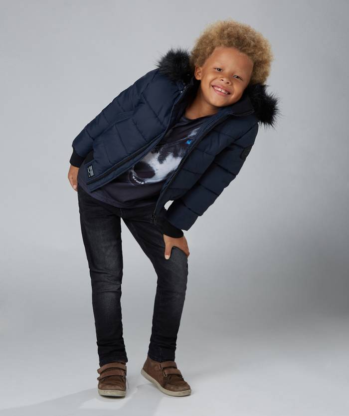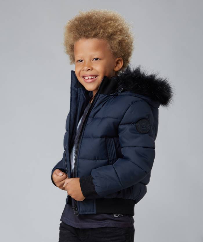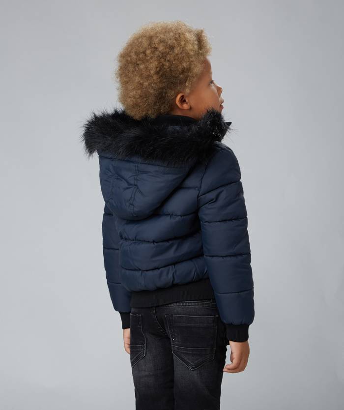 Blouson court en polyamide, poches devant zip injectées, capuche amovible & fausse fourrure autour de la capuche. Doublure & ouatinage : 100 % polyester