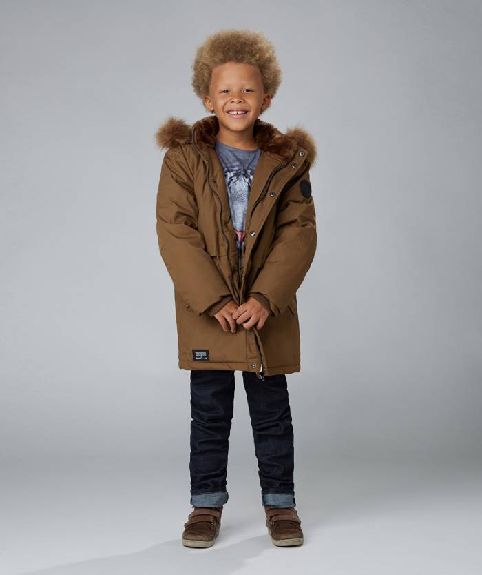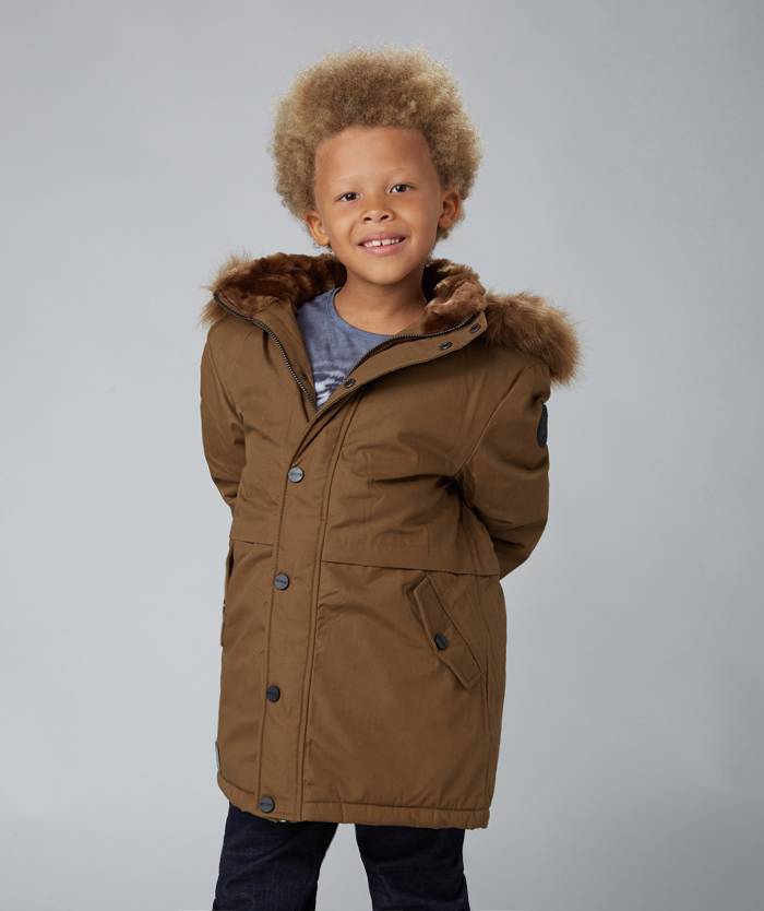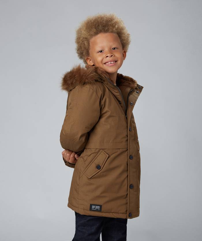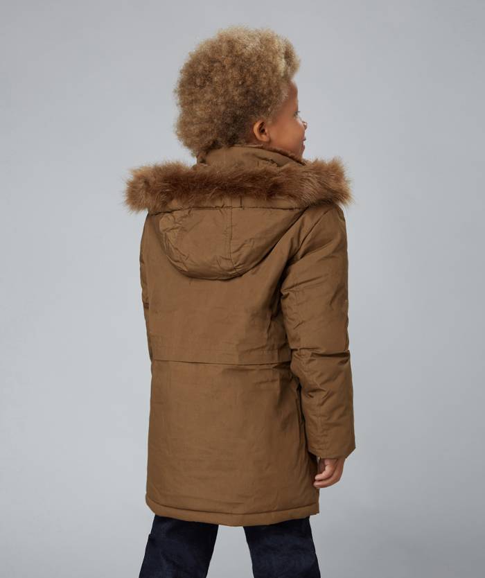 Blouson long en coton & polyester, avec capuche et fausse fourrure. Patte de boutonnage devant avec zip. 2 poches plaquées en biais. Fausse fourrure / doublure/ ouatinage :100% polyester