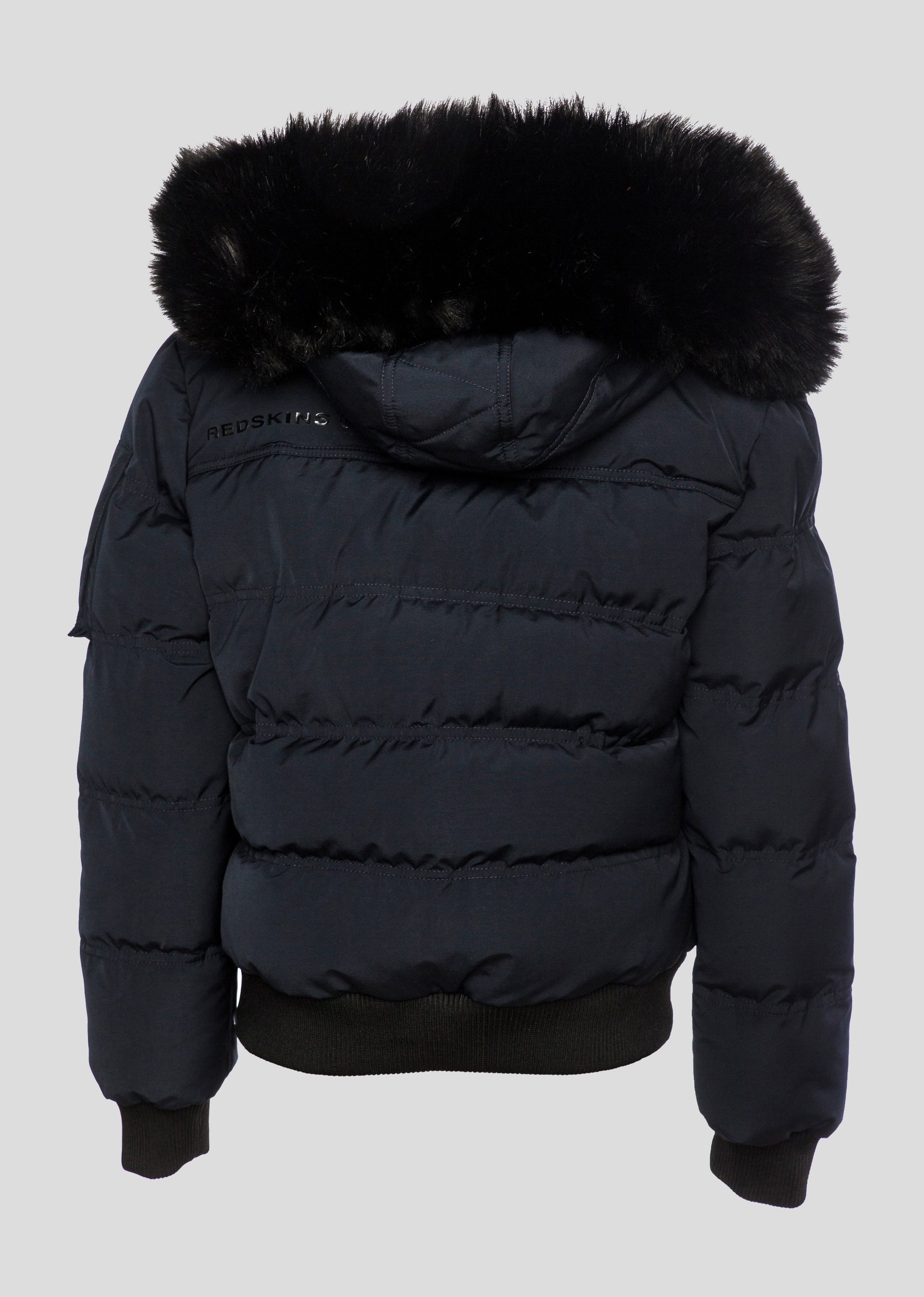 Blouson court Mars avec capuche à fausse fourrure, avec 2 poches diagonales sur le devant. Bords-côte sur les manches et la taille, petite inscription REDSKINS ton sur ton dans le dos, poche zippé sur la manche gauche avec patch REDSKINS et poche zippé avec tirette jacquard nylon.
