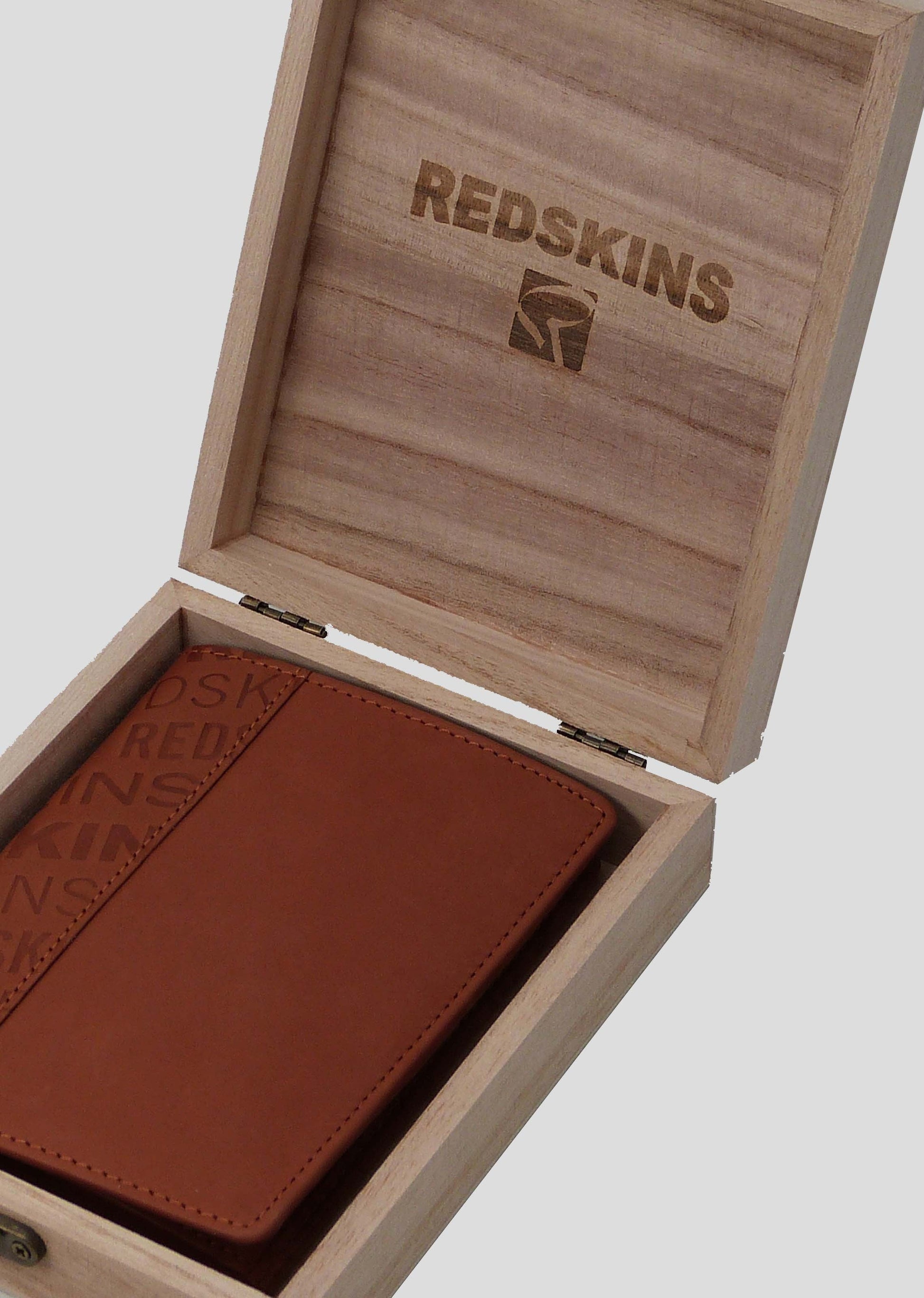 Le portefeuille JANSEN, exclusivement en cuir de vachette, possède des emplacements pour cartes ainsi qu’un rangement zippé. Le logo REDSKINS est visible sur la face avant ainsi qu’à l’intérieur.