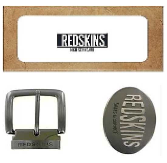Coffret 40 mm, 1 lanière réversible, 1 Boucle plaque à pince gravée "Redskins Sales & Service" en relief, Zamack canon de fusil mat et laqué gris, 1 boucle ardillon à pince gravée Redskins, Zamack aspect canon de fusil mat.