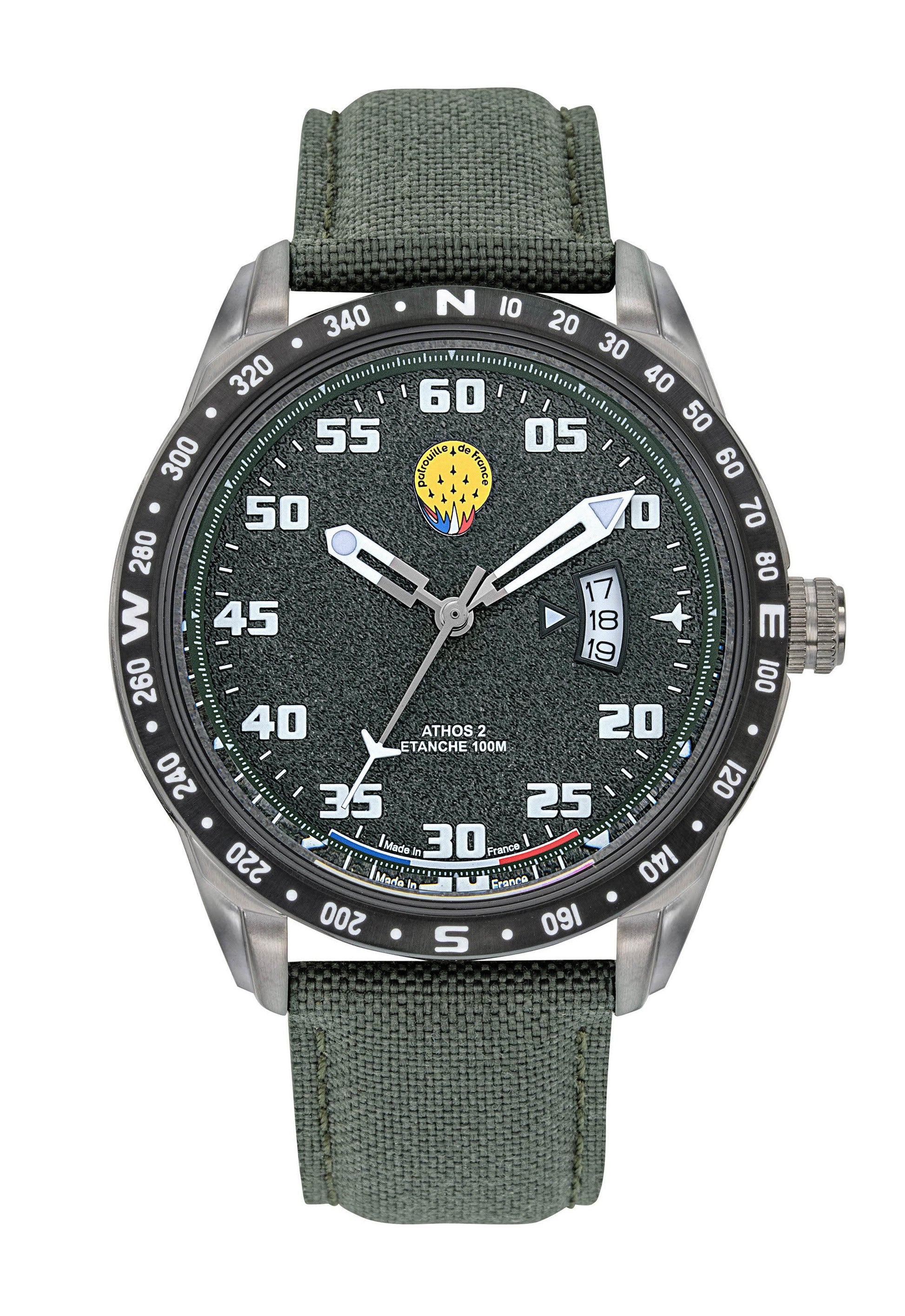 Montre Quartz 3 aiguilles et date, étanche 100 mètres.Carrure et lunette en acier inoxydableFinition de la carrure IP GunFinition de la lunette en PVD NoirCouronne protégéeBracelet TisséConception et fabrication : ateliers LIP à BesançonNotre Montre Cadran Kaki Bracelet Tissé Kaki A2-100ID-668126 offre une lisibilité optimale et s’ajuste à la précision des vols de la Grande Dame.Dans sa version avec bracelet en cuir surpiqué notre modèle ATHOS 2 rappelle les BLOUSONs des aviateurs. Son bracelet tissé vert kaki s’inspire quant à lui des Nato de l’Armée.Simples évocations d’unité et de cohésion.