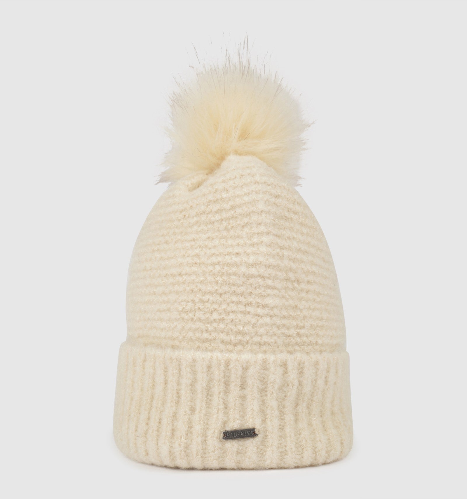 Le bonnet GWYNETH tricot, écru, est ornée d'un pompon tout doux pour une touche ultra féminine.