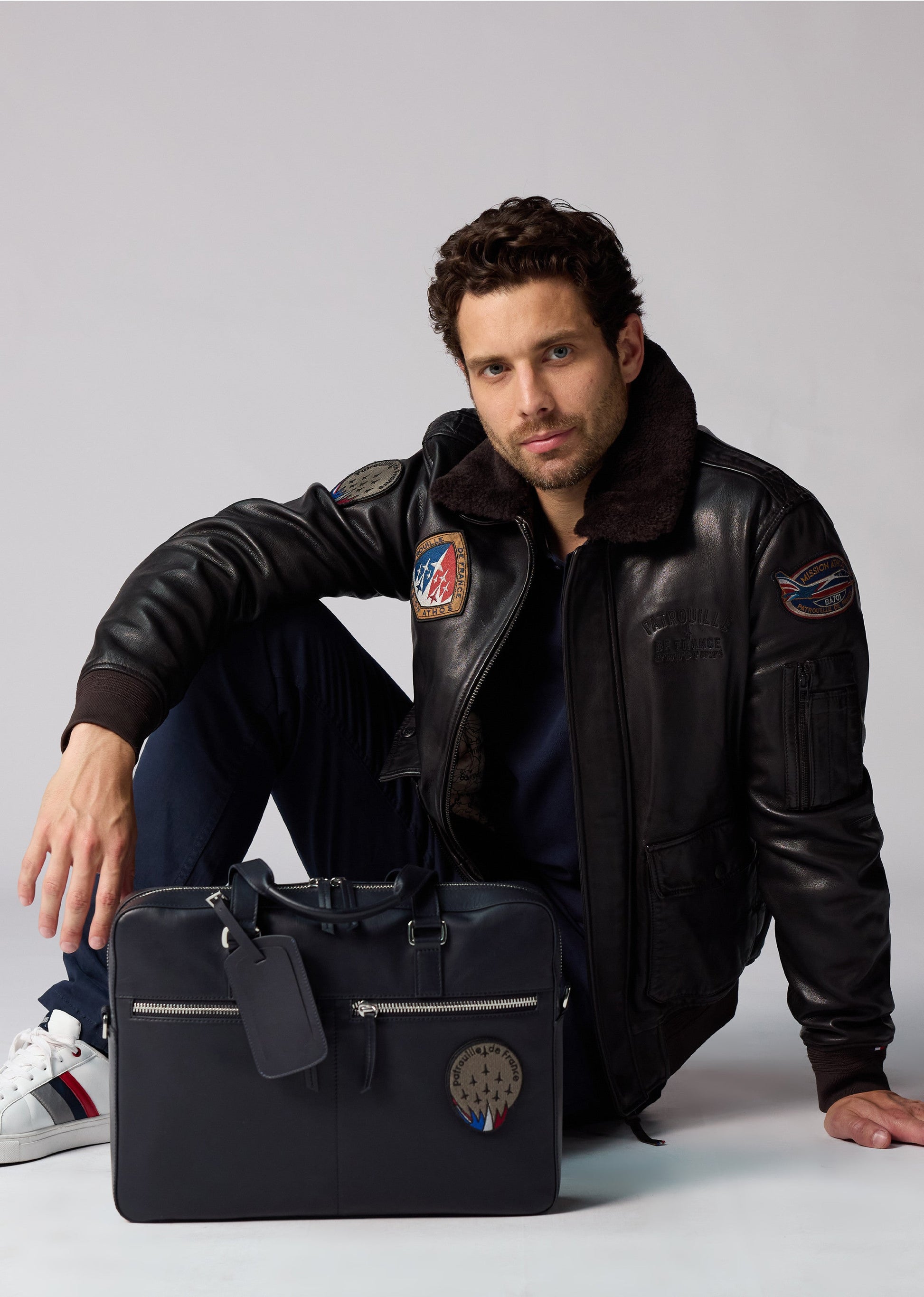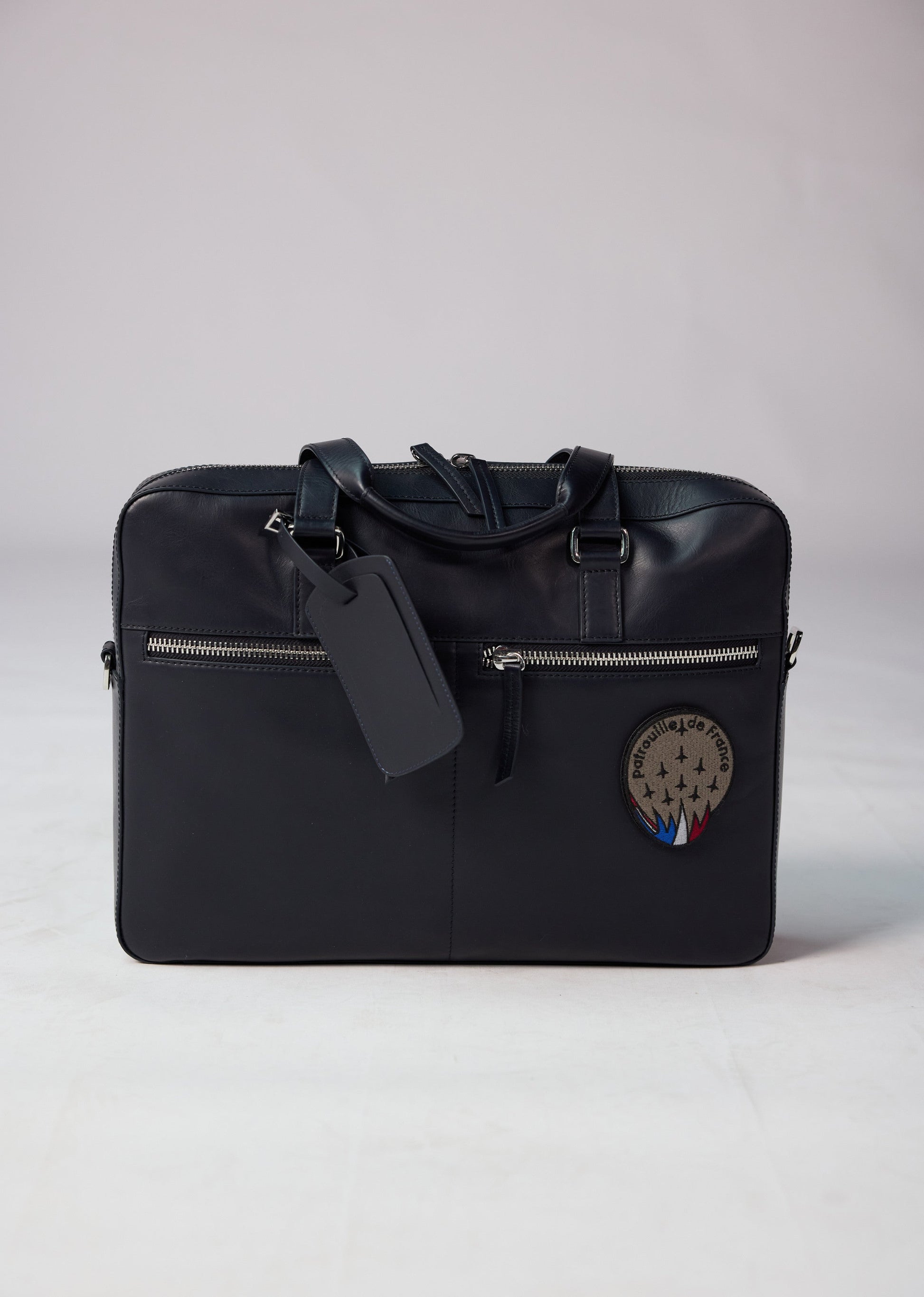 Sac weekend MESSENGER SPIDER personnalisé Patrouille de France, conçu en cuir de vachette. 55 x 35 x 25 ( Longueur x Hauteur x Largeur). Bandoulière amovible ajustable. 2 Poches latérales avec fermetures zippées et une grande poche à fermeture pression personnalisée. Doublure du sac personnalisée. La célèbre patate Patrouille de France sur le côté gauche.