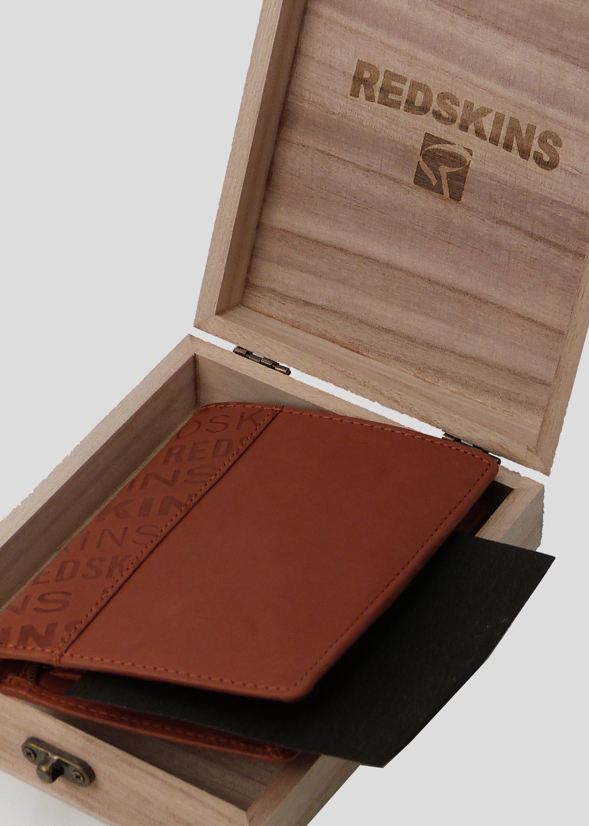 Le portefeuille JANSEN, exclusivement en cuir de vachette, possède des emplacements pour cartes ainsi qu’un rangement zippé. Le logo REDSKINS est visible sur la face avant ainsi qu’à l’intérieur.