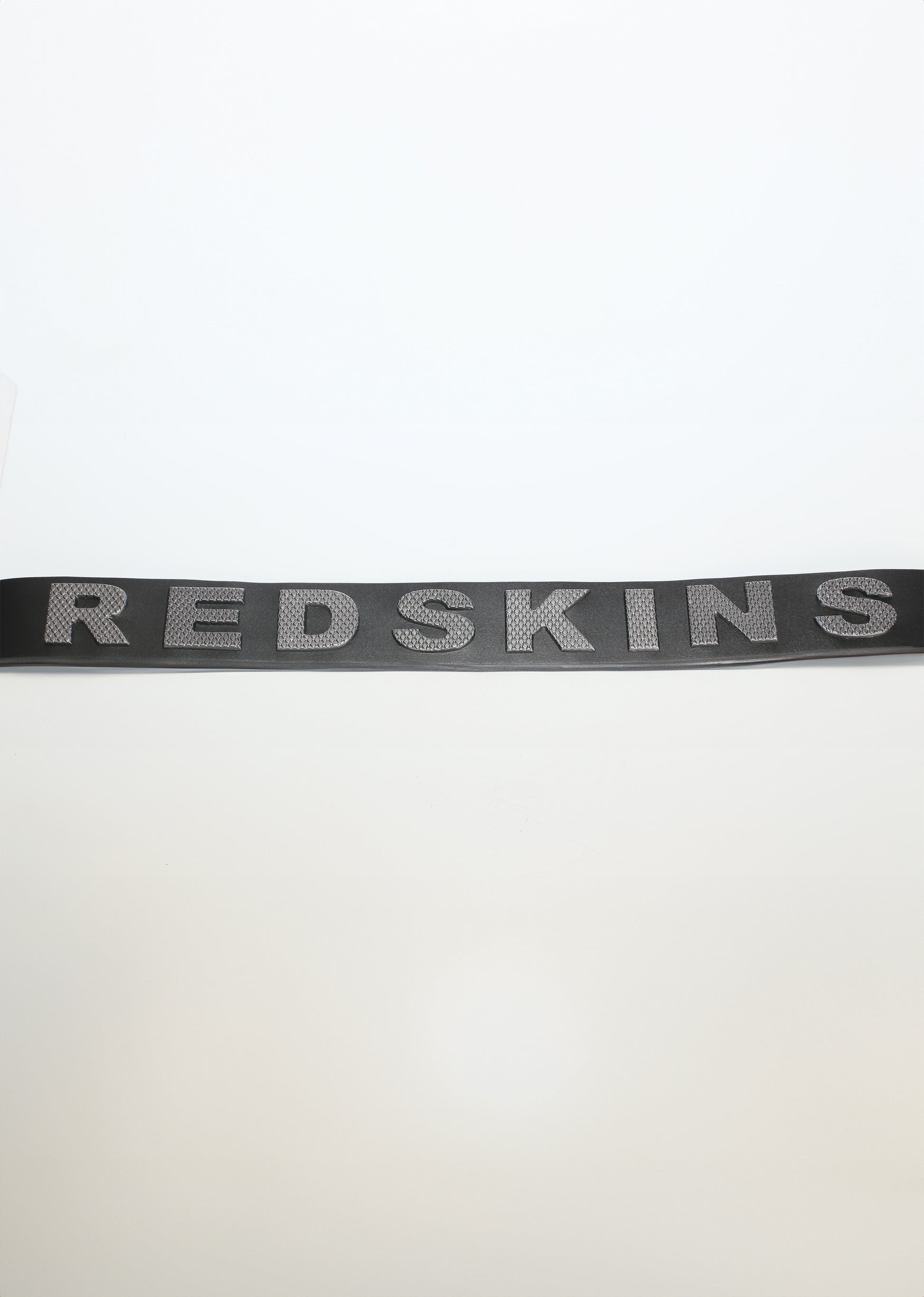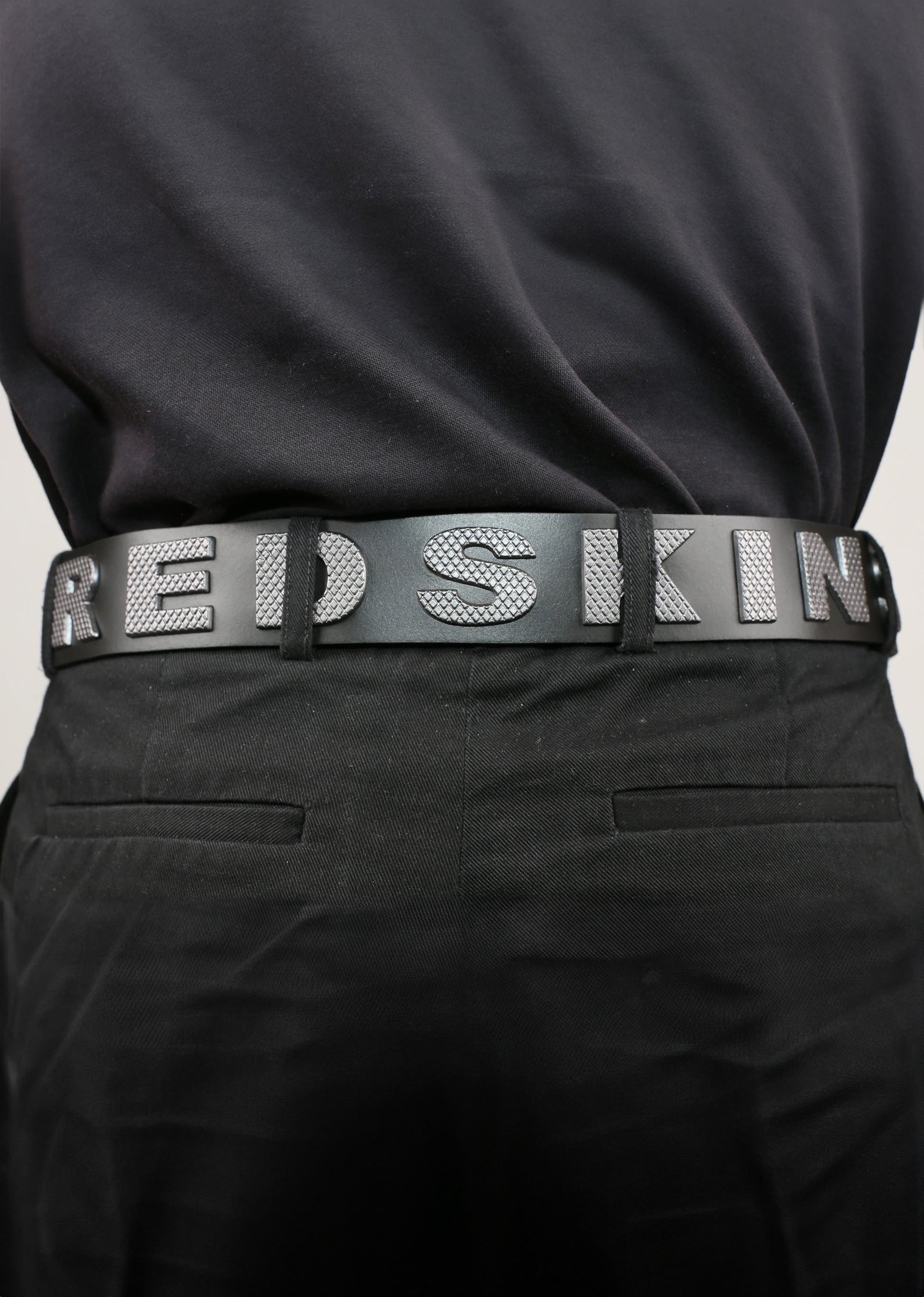 La ceinture DATA noire, en cuir de vachette, est ornée des lettres REDSKINS en métal sur le pourtour de la ceinture et d'une boucle argentée à ardillon. Largeur de la ceinture : 4 cm