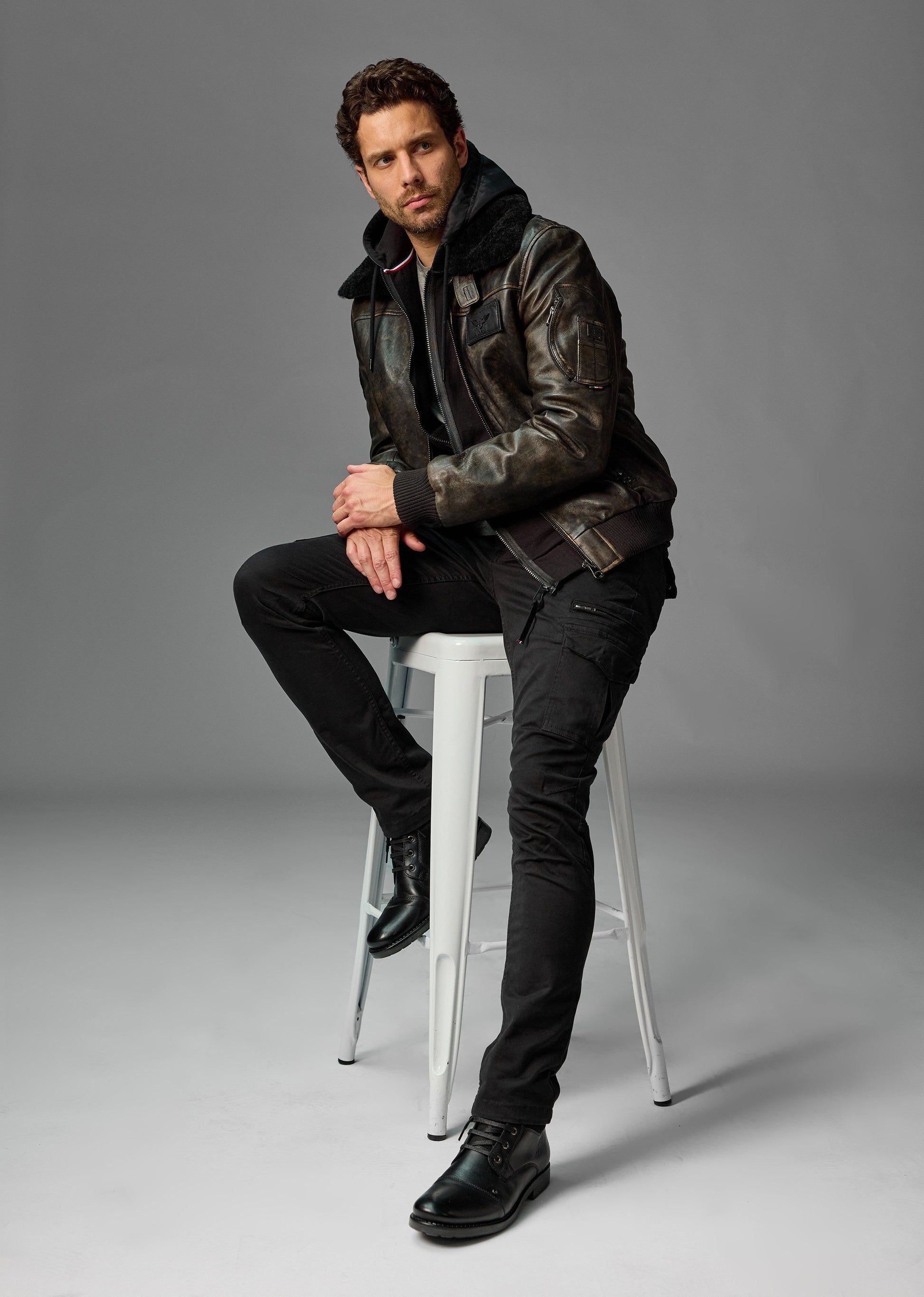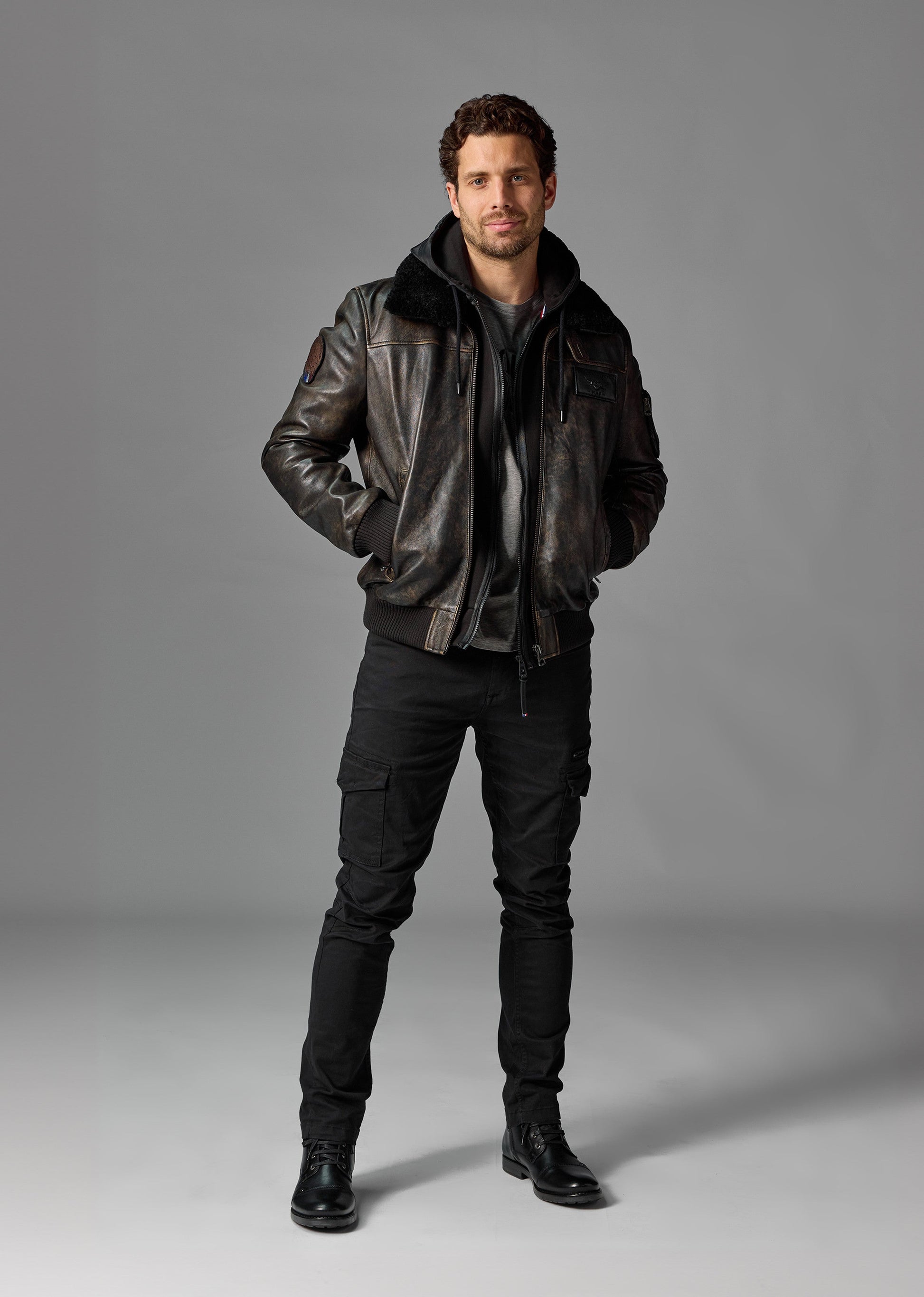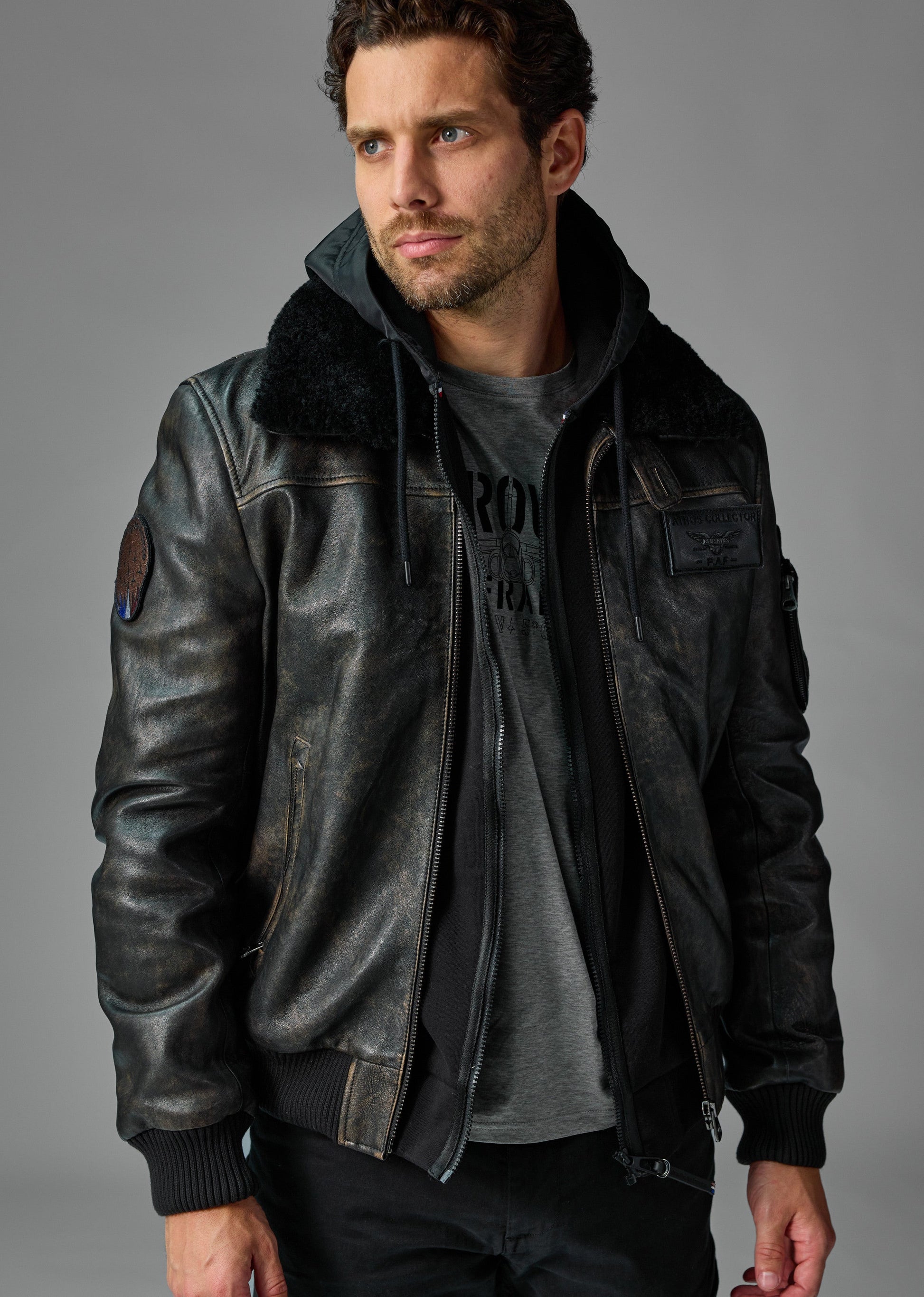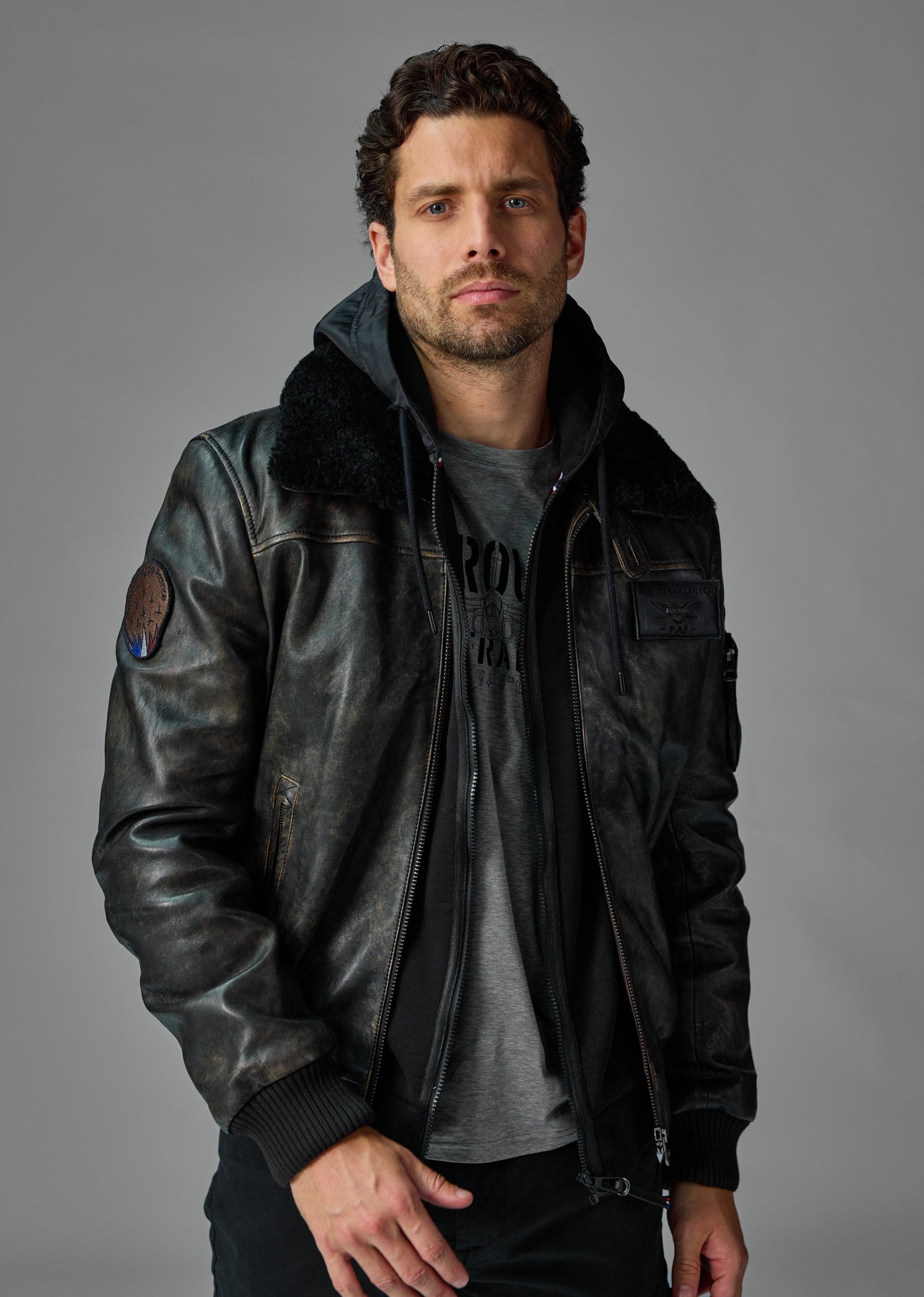 En cuir patiné, le blouson RAFAL YCON est inspiré des uniformes d’aviateur avec une coupe cintrée, du bord-côte aux poignets et à la ceinture ainsi qu’une fermeture à zip et plusieurs poches. Le blouson comprend un gilet amovible fermeture zippée, non présent sur les photos et la vidéo comme tous les autres coloris du RAFAL YCON. Son col chemise en fourrure ton sur ton apporte une touche raffinée et élégante. Composition : Cuir d'agneau