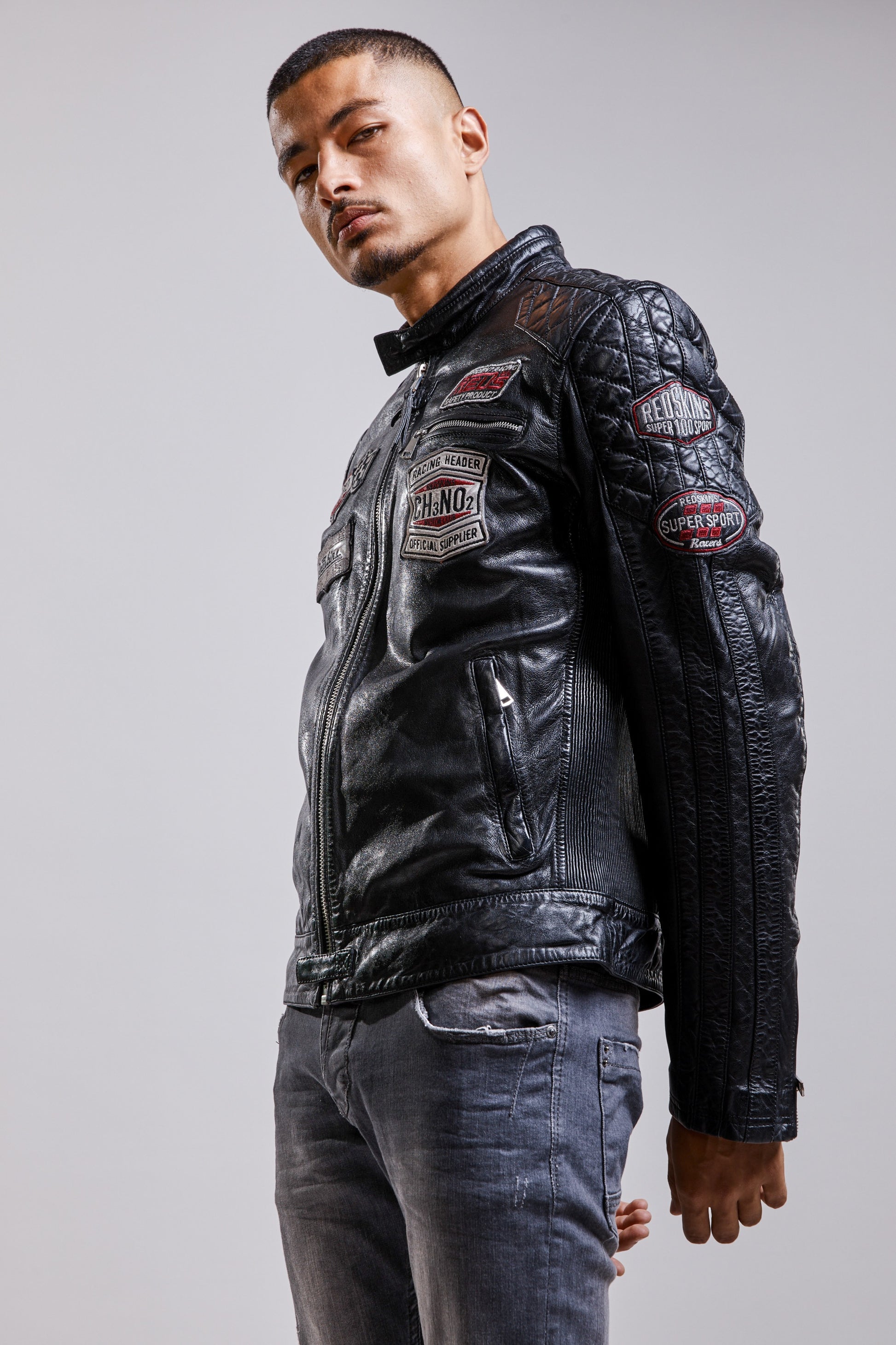 Le blouson en cuir RIPPER CALISTA est né sur les circuits de course. Sa carrure est soulignée par des empiècements matelassés en cuir, des patchs cousus et des bandes contrastantes qui longent les manches. Des zips métalliques complètent le style singulier et des broderies REDSKINS à la poitrine rappelle l'identité de cette pièce pleine de caractère. Composition : Cuir de Mouton