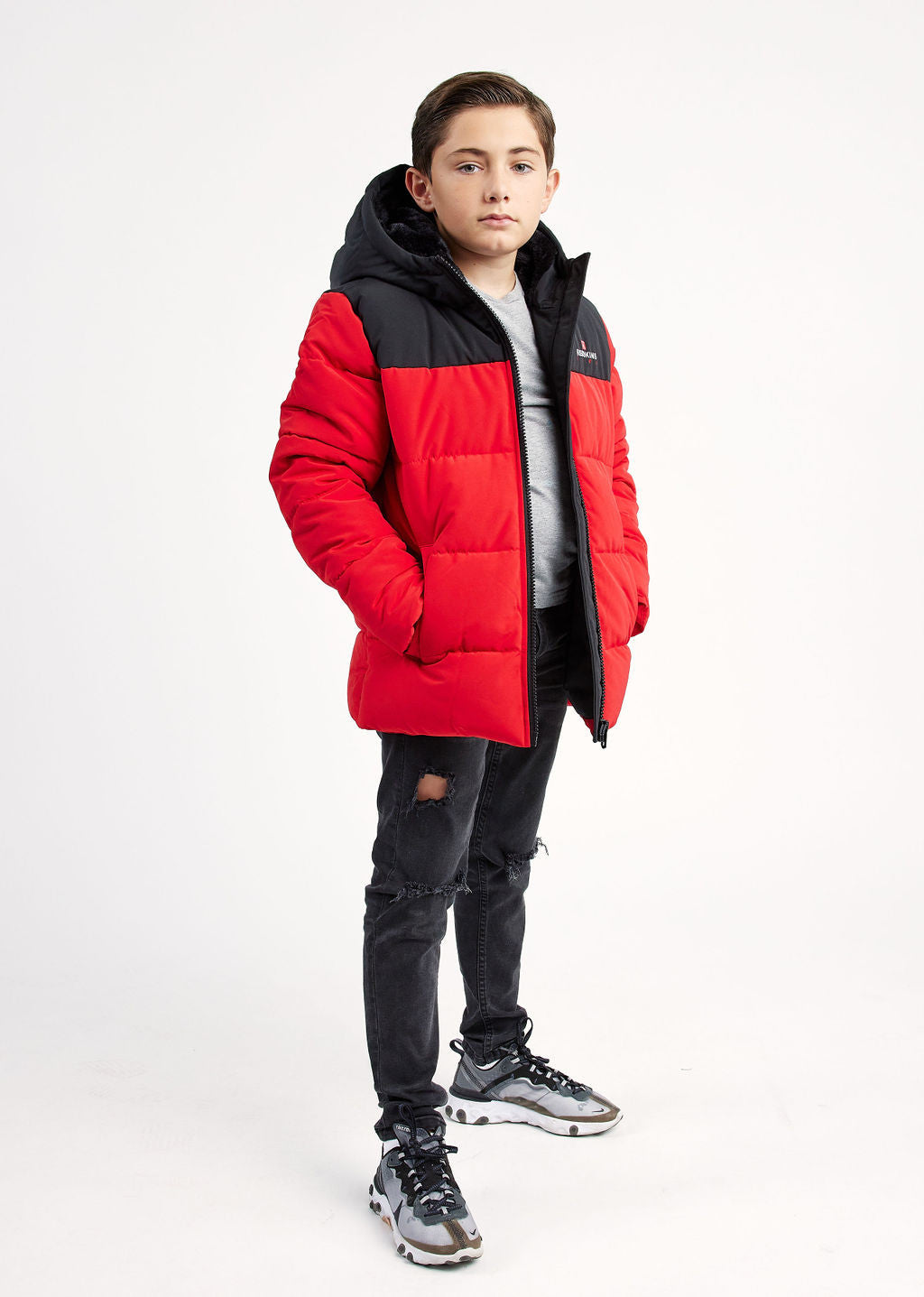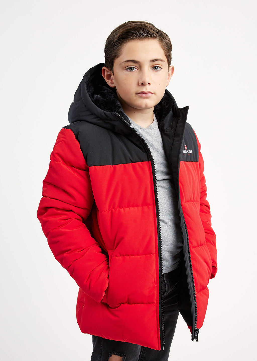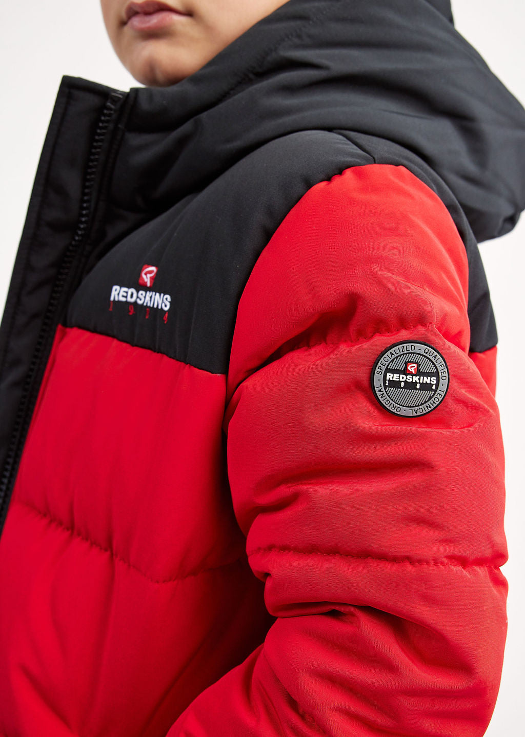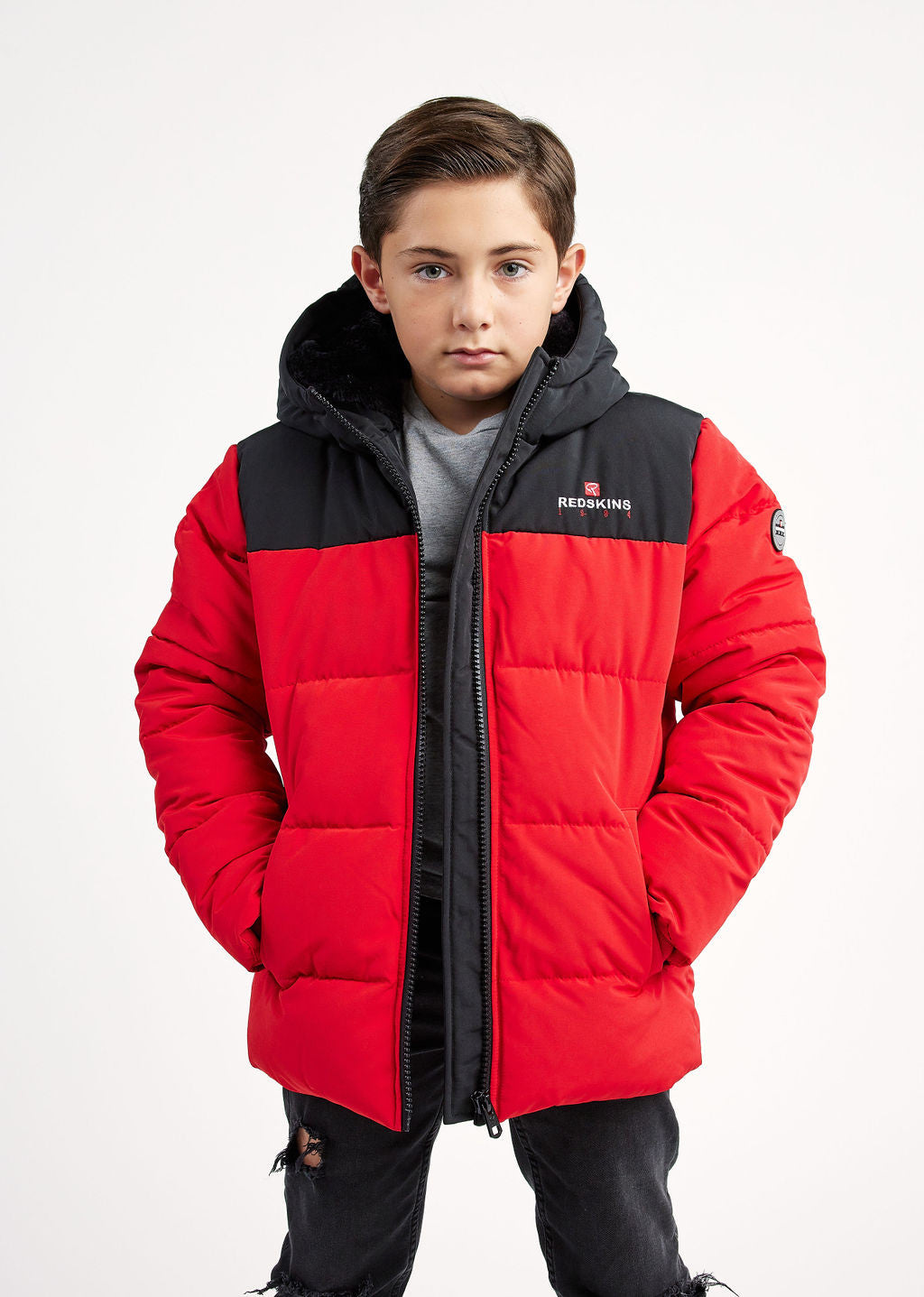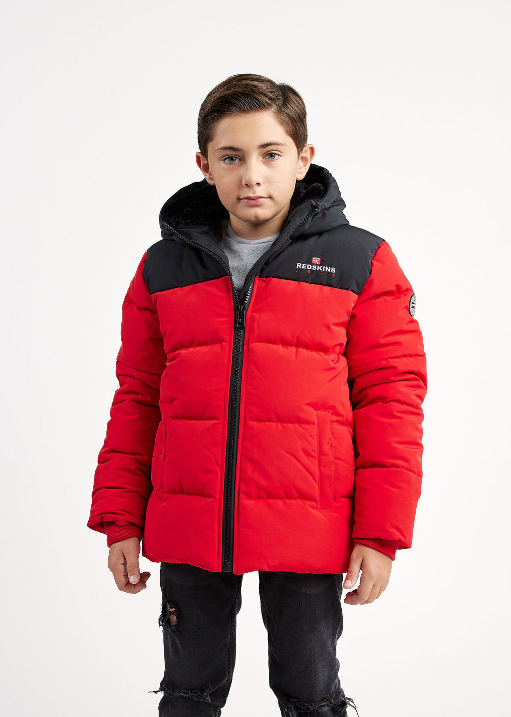 Doudoune REDSKINS enfant, 2 poches à rabats à l'avant, 1 badge manche gauche avec badge. Impression REDSKINS sur la poitrine côté coeur.