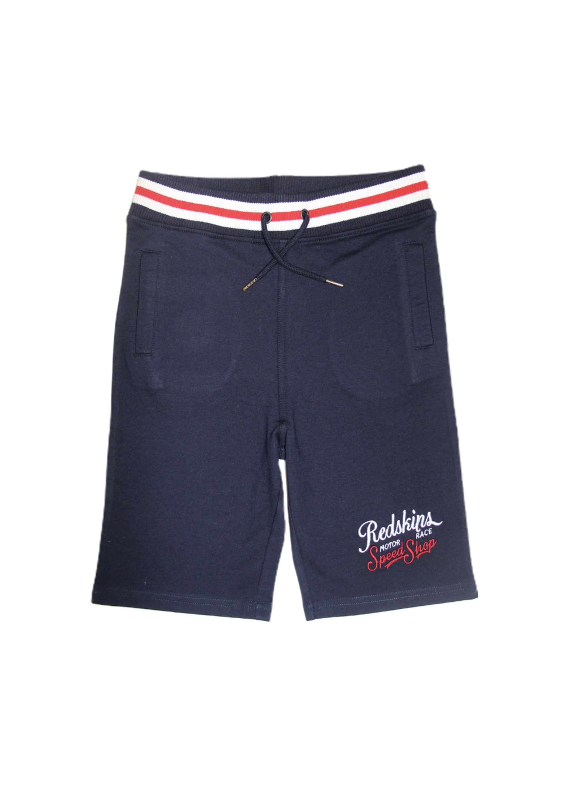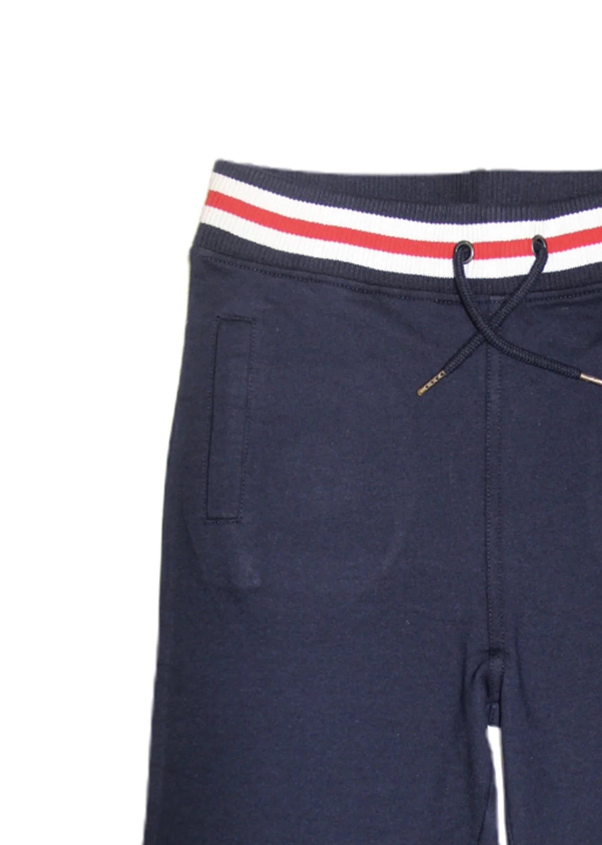 Le SHORT JOGGING BER180128 possède des liens de serrage à la taille avec une bande tricolore et un marquage au niveau du genou gauche.