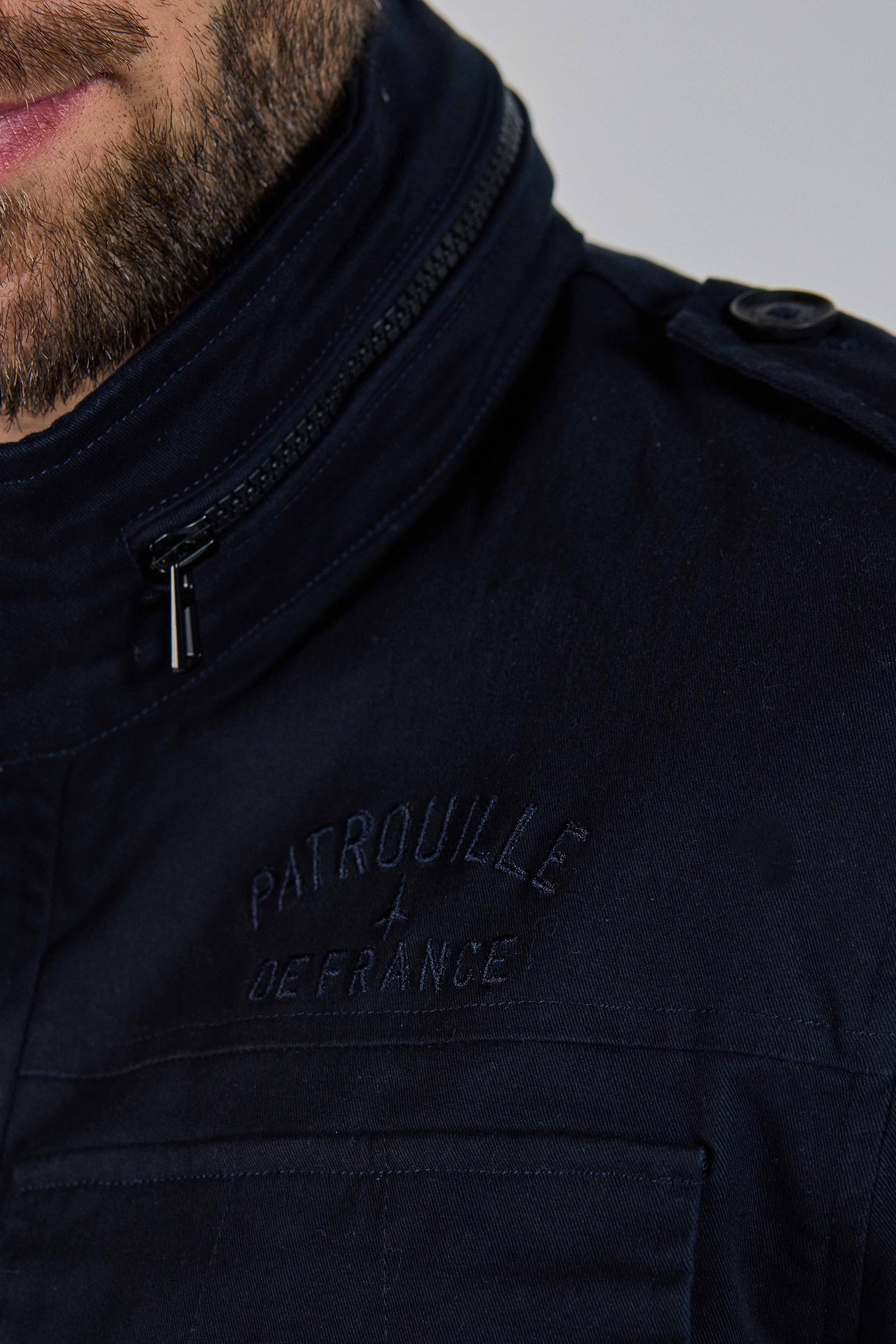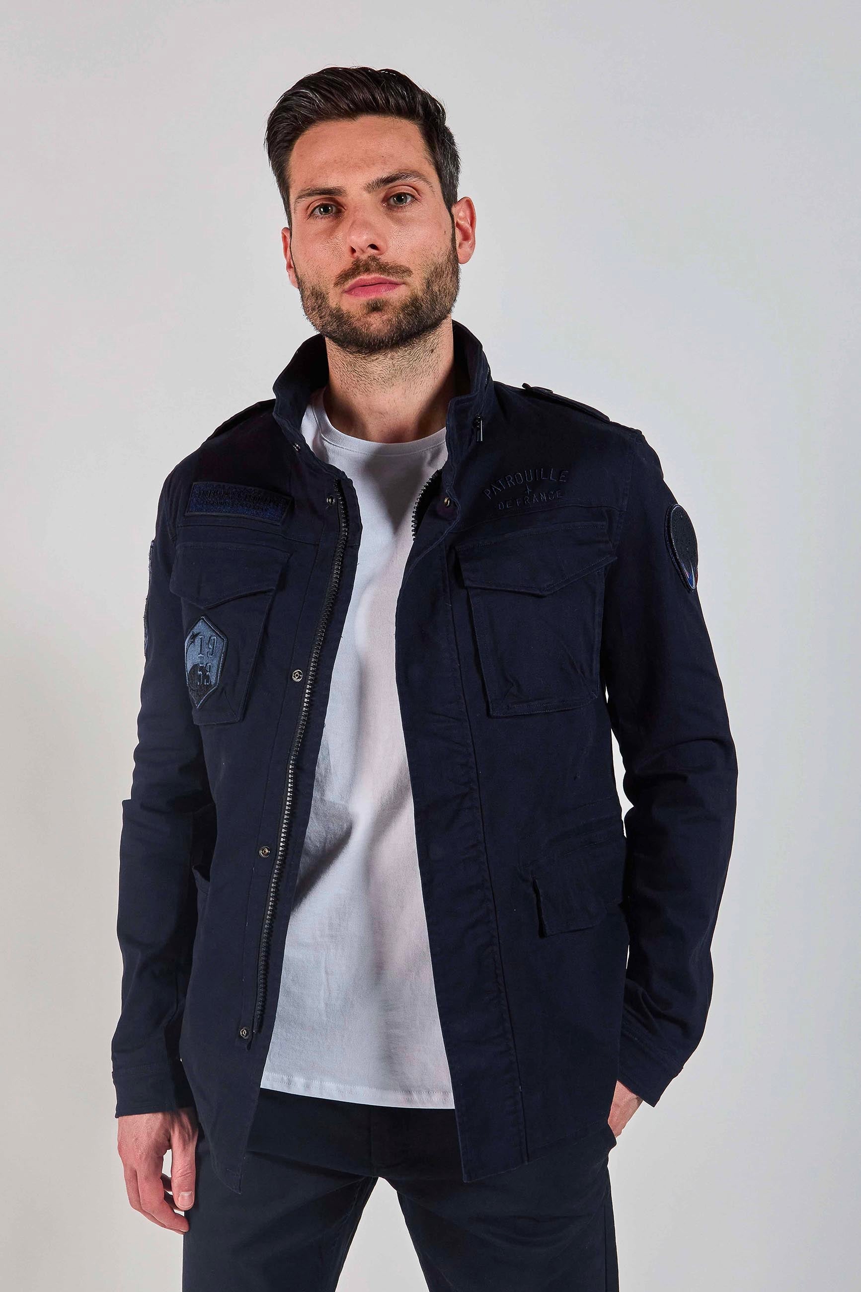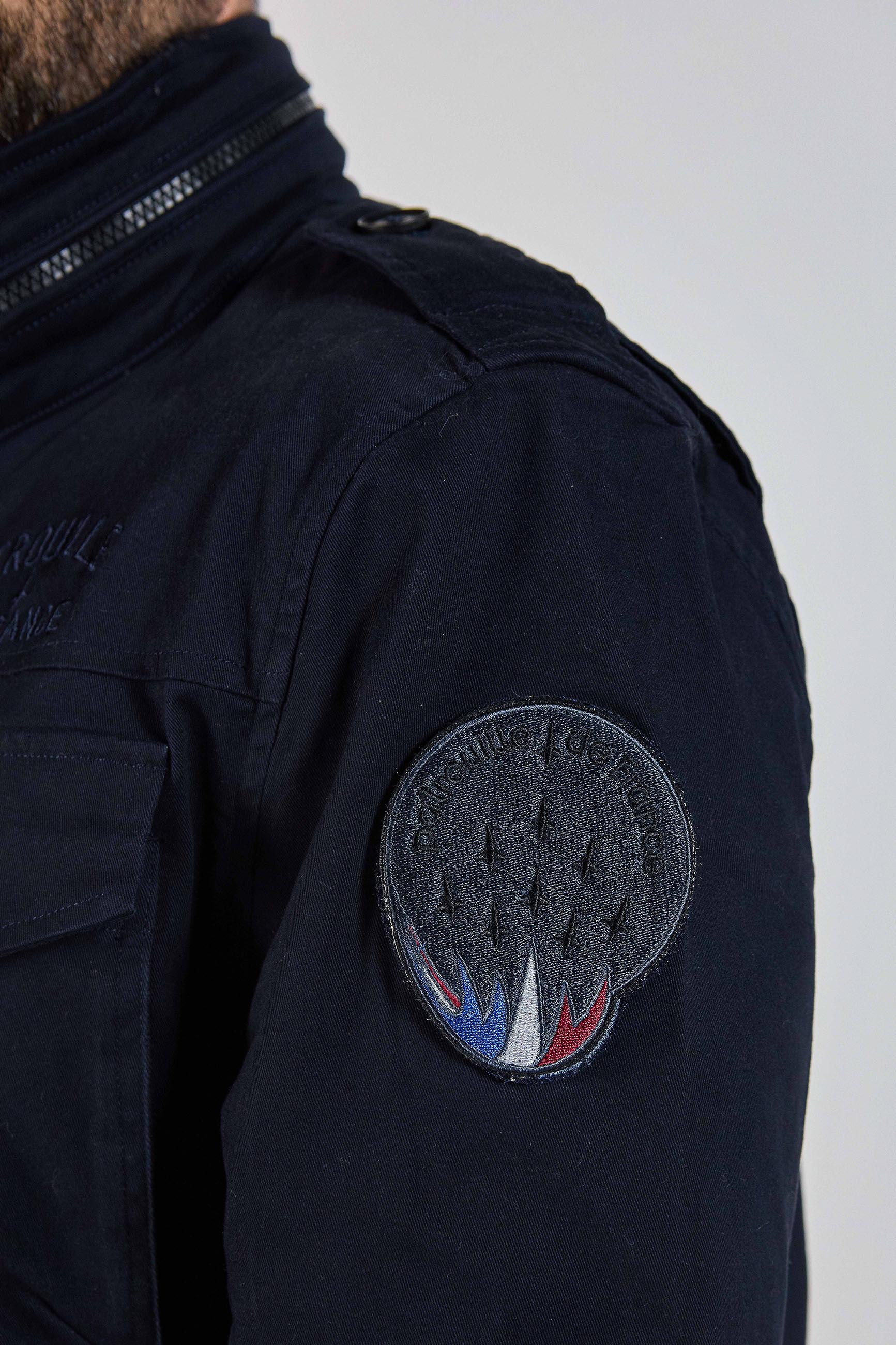 Pièce à manche BATTLE AERO en coton, col montant avec attache, 2 poches à rabats latérales au niveau du torse, 2 poches à rabats latérales basses, 2 cordons d'attaches en bas de la pièce, 2 logos brodés PATROUILLE DE FRANCE au niveau de chaque épaules, 1 scratch au dessous de la poche à rabat droite au niveau du torse, 1 patte à épaule avec un bouton d'attache sur chaque épaules, composition : 98% COTON - 2% ELASTHANNE. Collection Patrouille De France by Redskins.