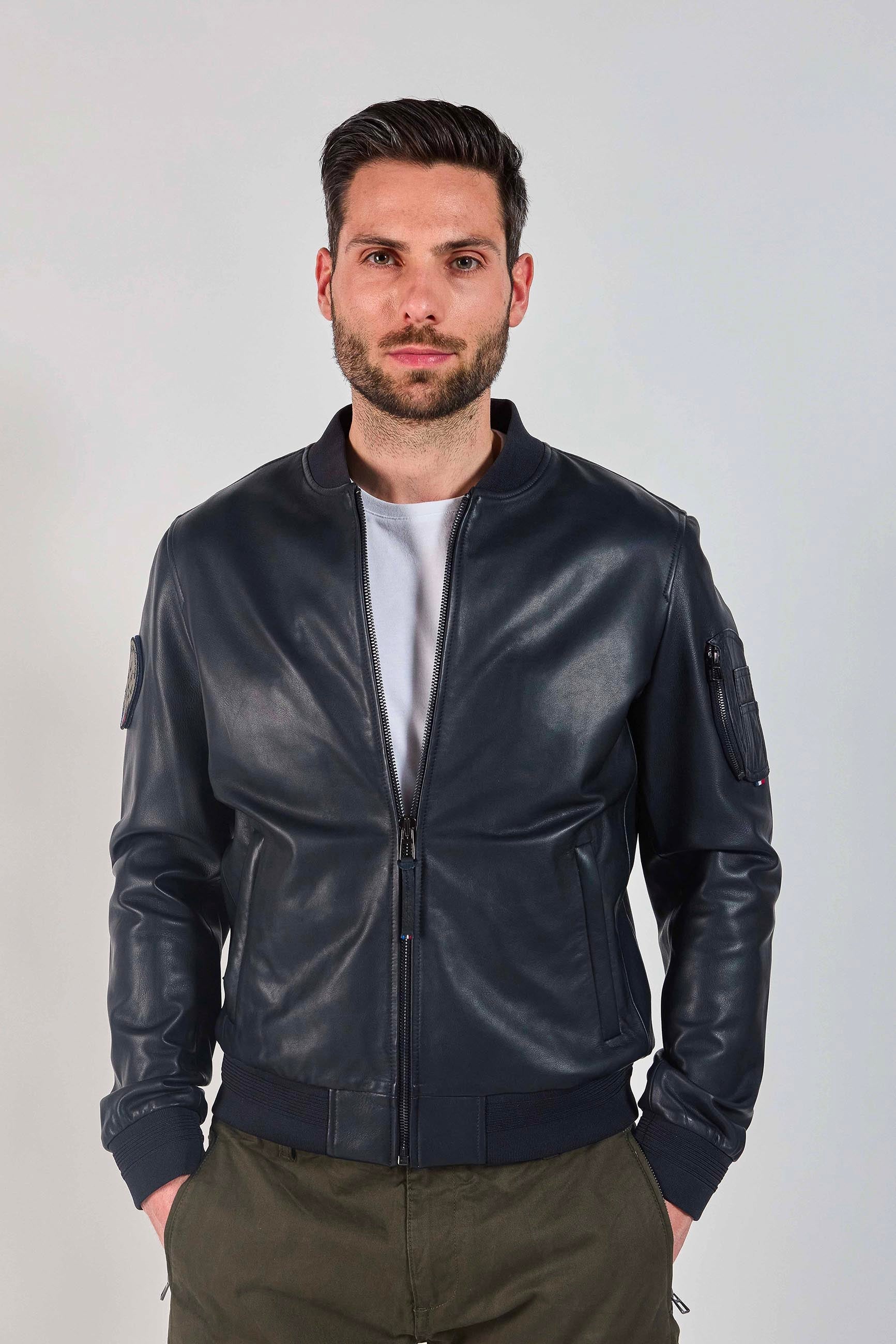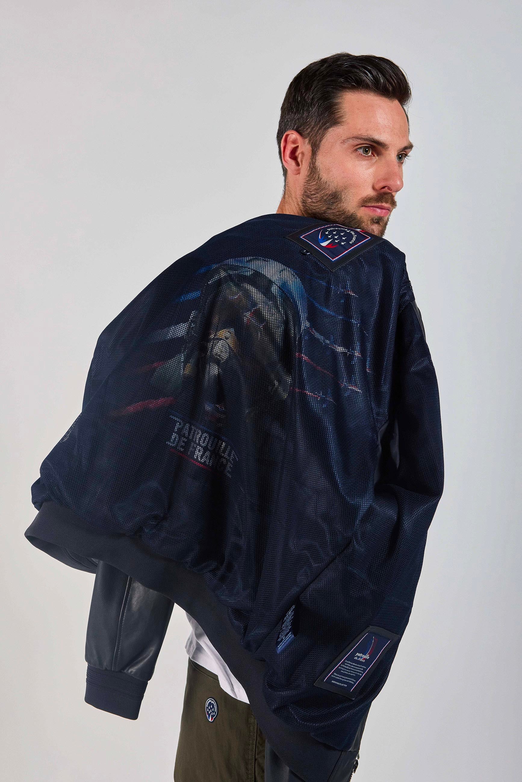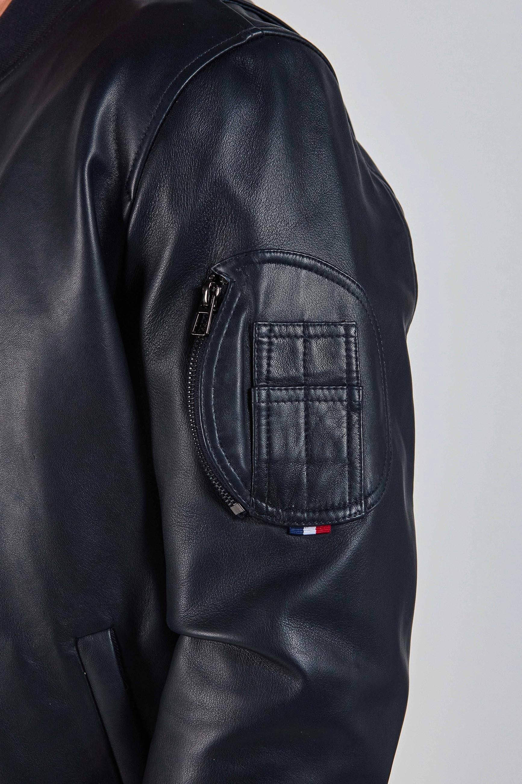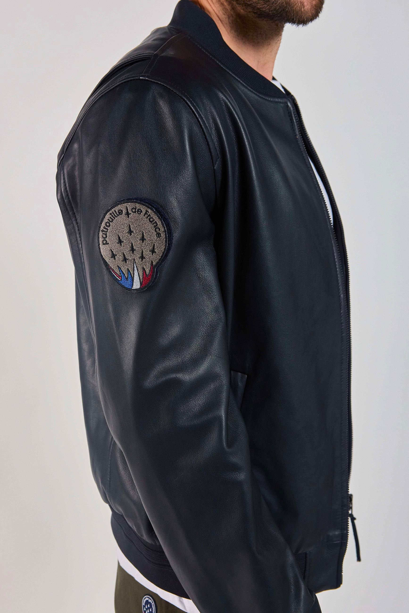 Veste FAUCON PALOMA en cuir d'agneau, col Teddy, 1 zip central, 2 poches raglans latérales, 1 poche raglan au niveau du torse le long du zip central, 1 poche zipée arrondie au niveau de l'épaule gauche, petit drapeau français brodé sous la poche de l'épaule gauche. Collection Patrouille De France by Redskins.