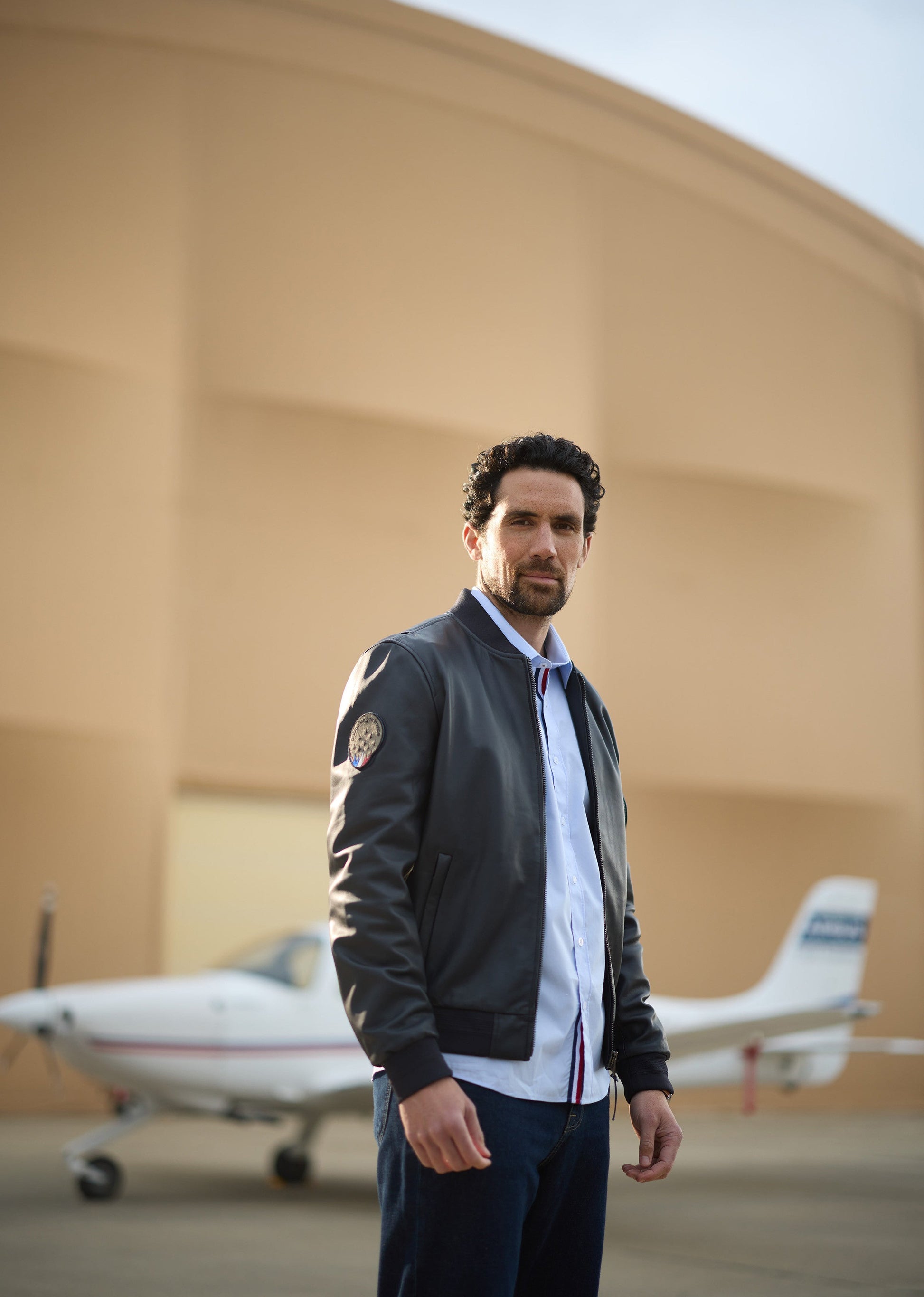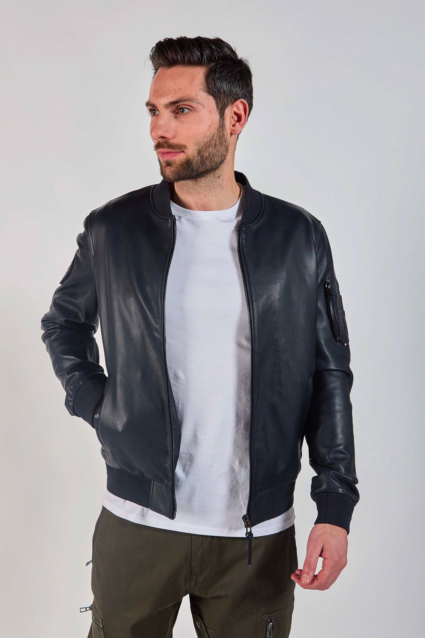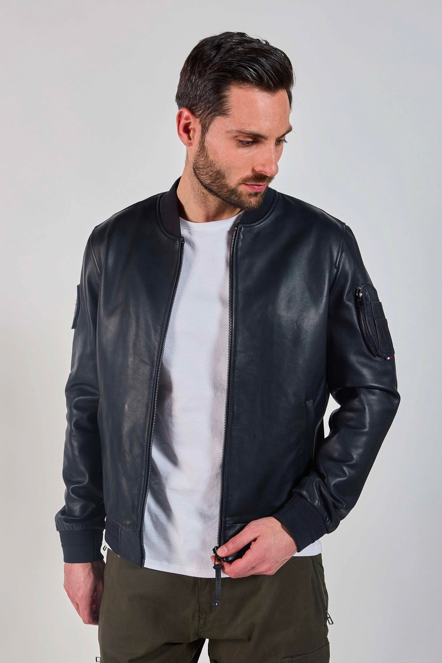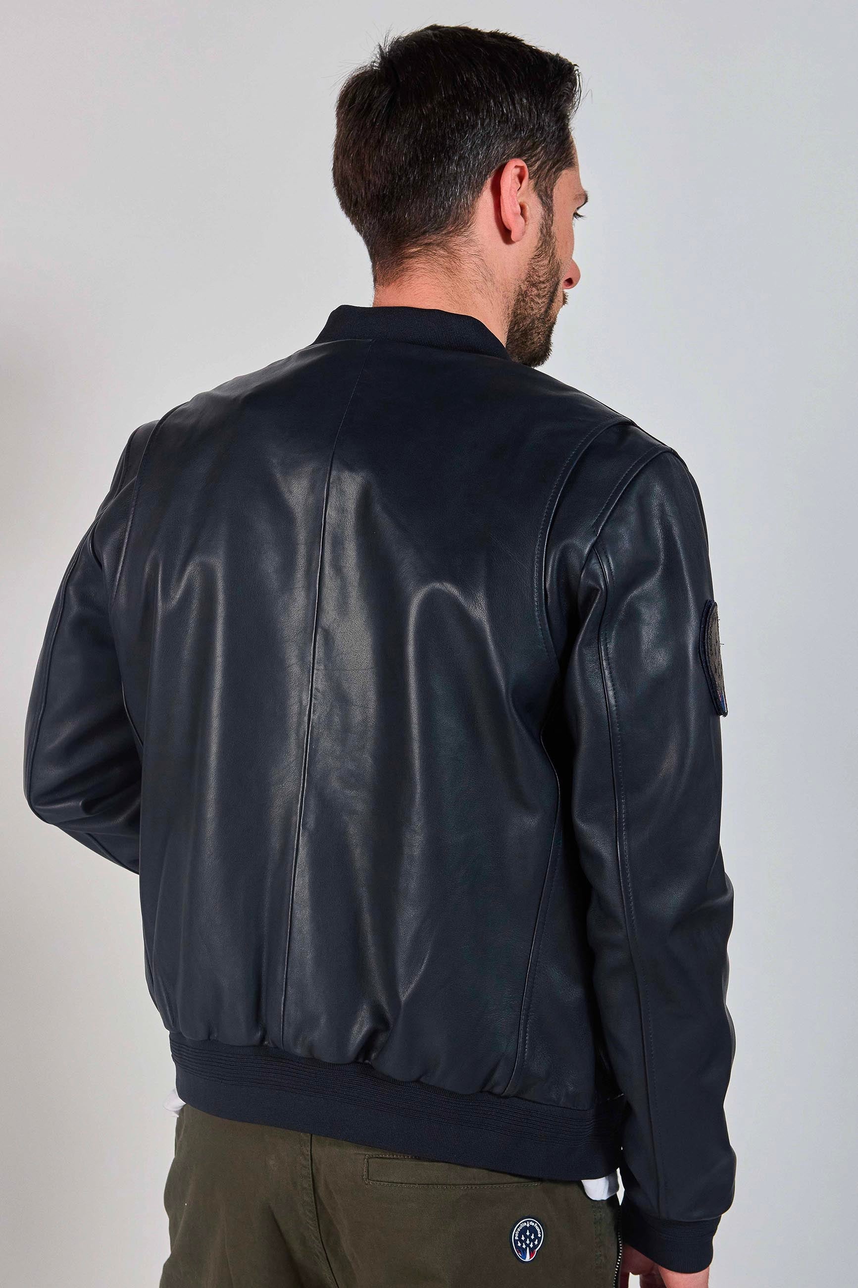 Veste FAUCON PALOMA en cuir d'agneau, col Teddy, 1 zip central, 2 poches raglans latérales, 1 poche raglan au niveau du torse le long du zip central, 1 poche zipée arrondie au niveau de l'épaule gauche, petit drapeau français brodé sous la poche de l'épaule gauche. Collection Patrouille De France by Redskins.