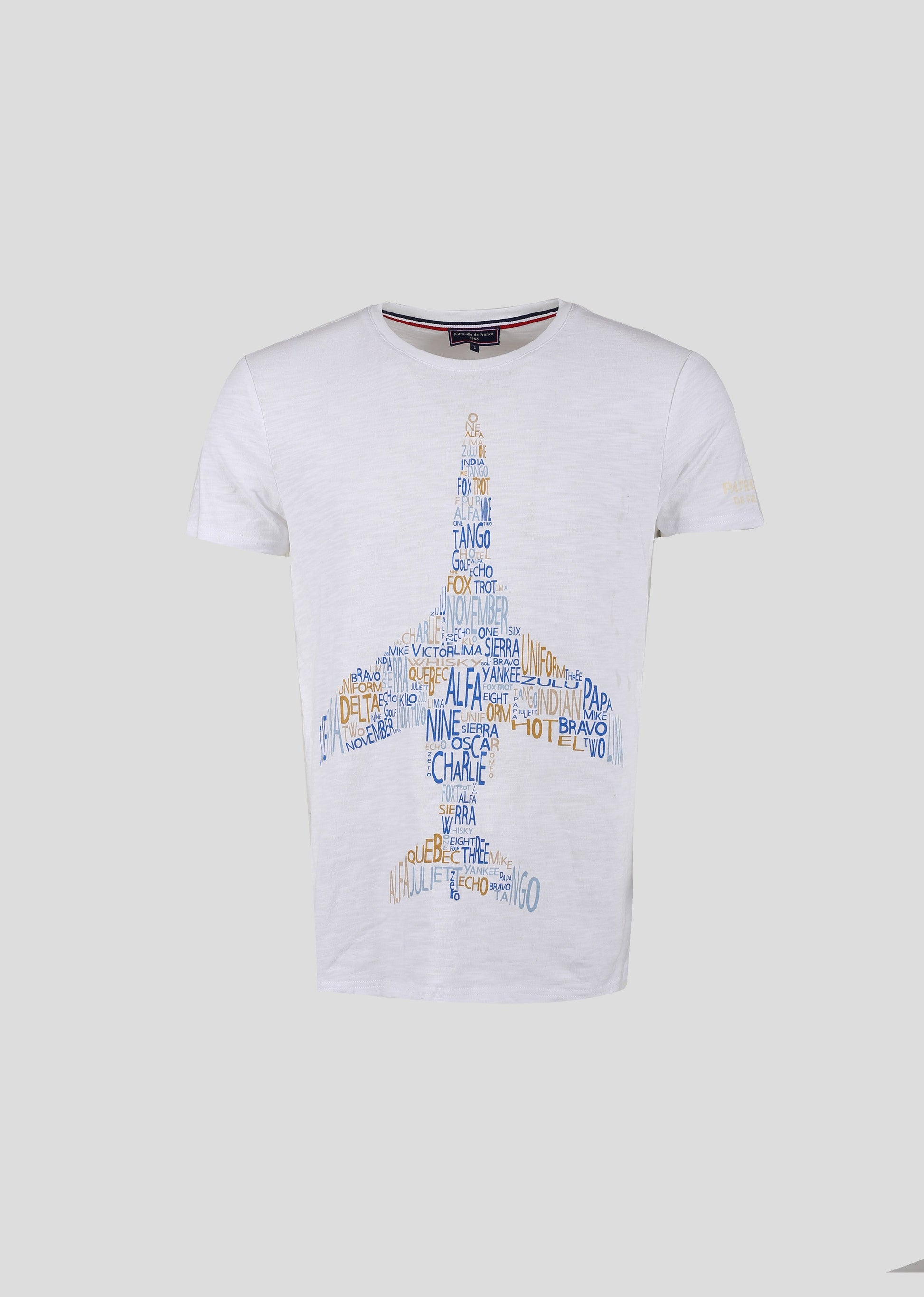 Le T-shirt FEATHER SLUBB est composé d’un col rond et de manches courtes. Simple et original, il se porte facilement au quotidien. Le devant est orné d’un motif d’avion composé de plusieurs mots. La manche gauche est orné du logo PATROUILLE DE FRANCE. 100 % Coton