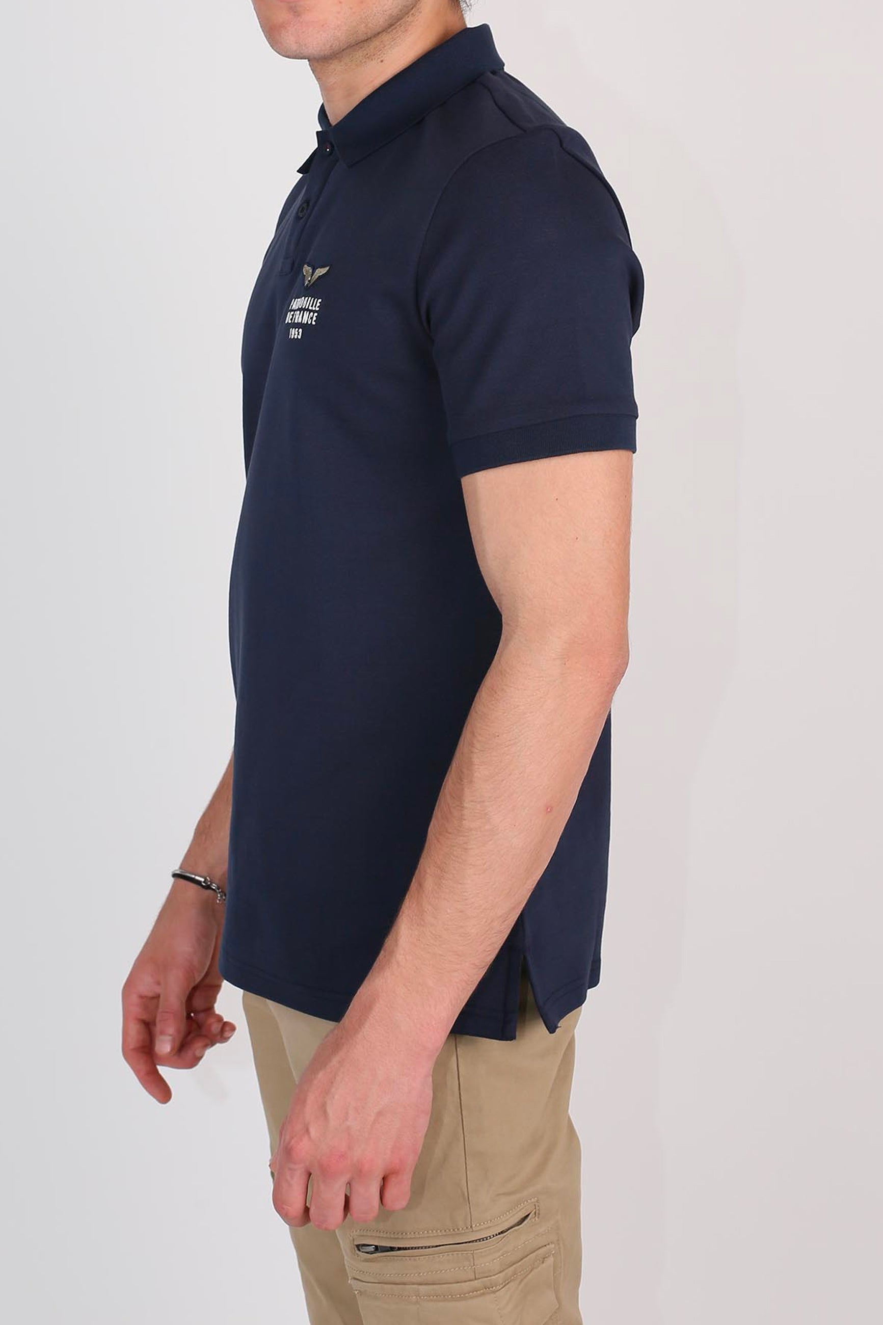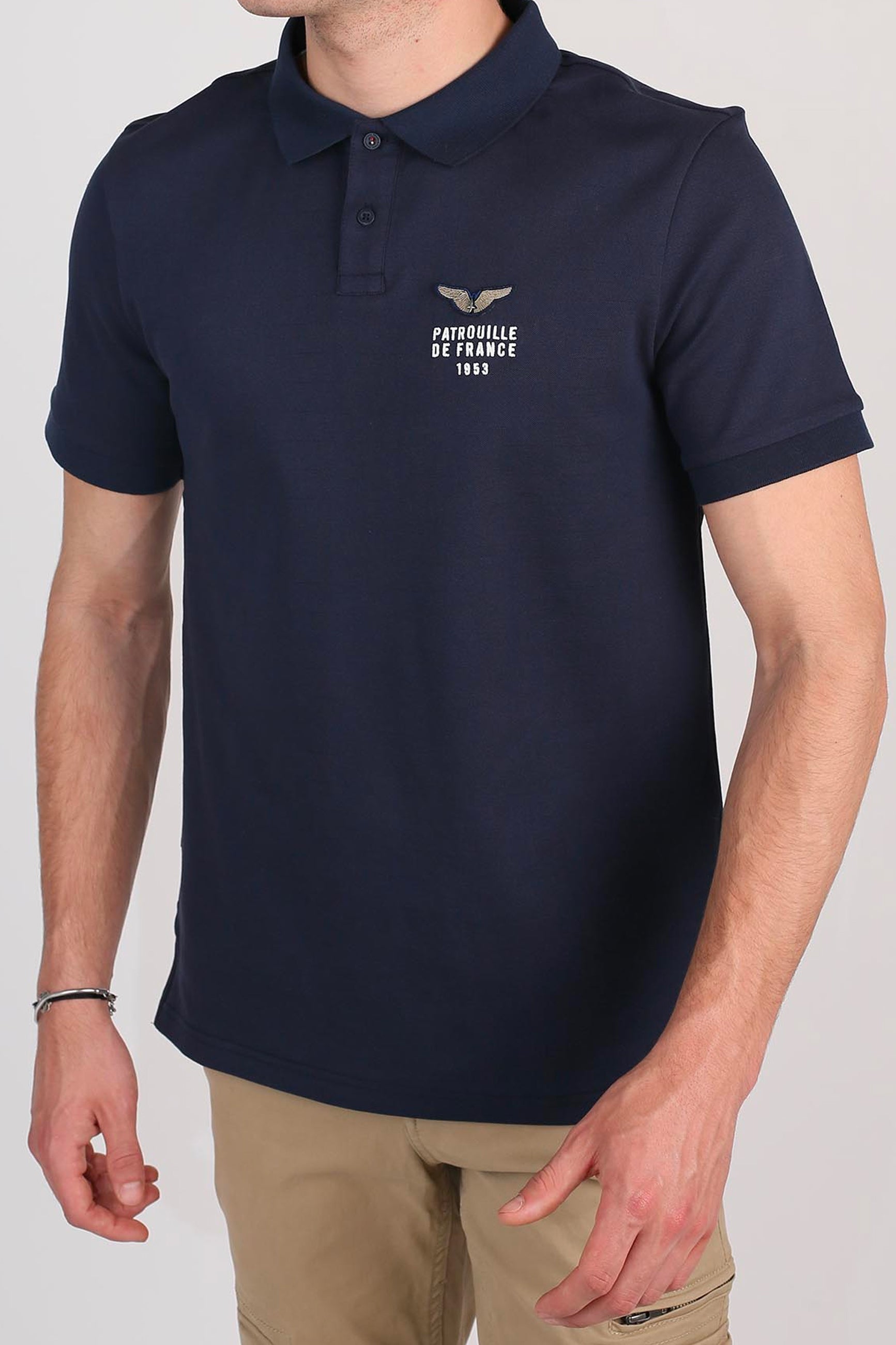 Polo FIRST CLUB coton et polyester, col à revers, 2 boutons d'attaches, logo PATROUILLE DE FRANCE brodé côté coeur, 2 fentes cotés en bas du polos, petit drapeau français attaché au polo en bas à droite, compostion : 72% COTON 28% POLYESTER. Collection Patrouille De France by Redskins.