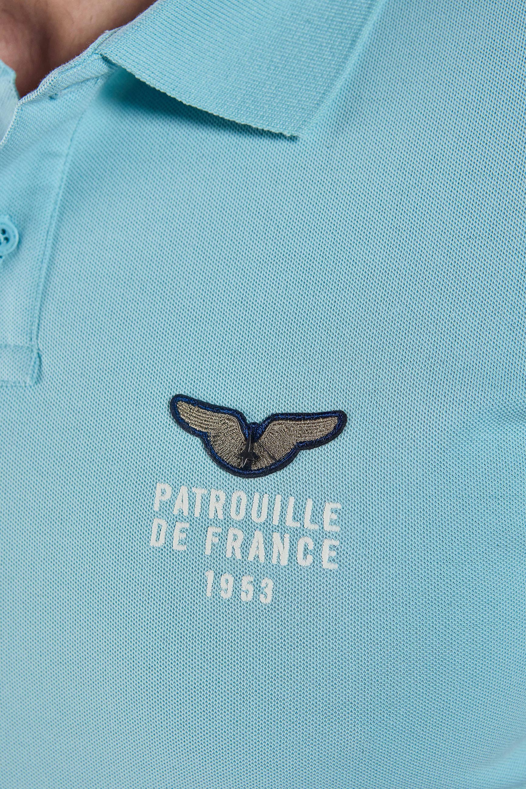Polo FIRST CLUB coton et polyester, col à revers, 2 boutons d'attaches, logo PATROUILLE DE FRANCE brodé côté coeur, 2 fentes cotés en bas du polos, petit drapeau français attaché au polo en bas à droite, compostion : 72% COTON 28% POLYESTER. Collection Patrouille De France by Redskins.