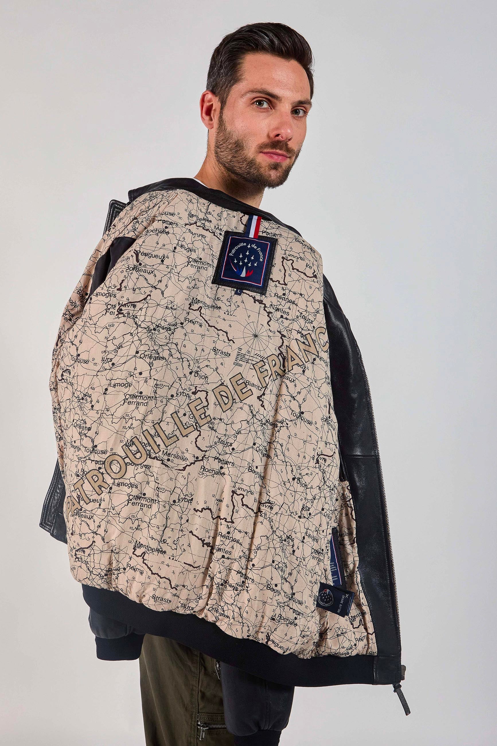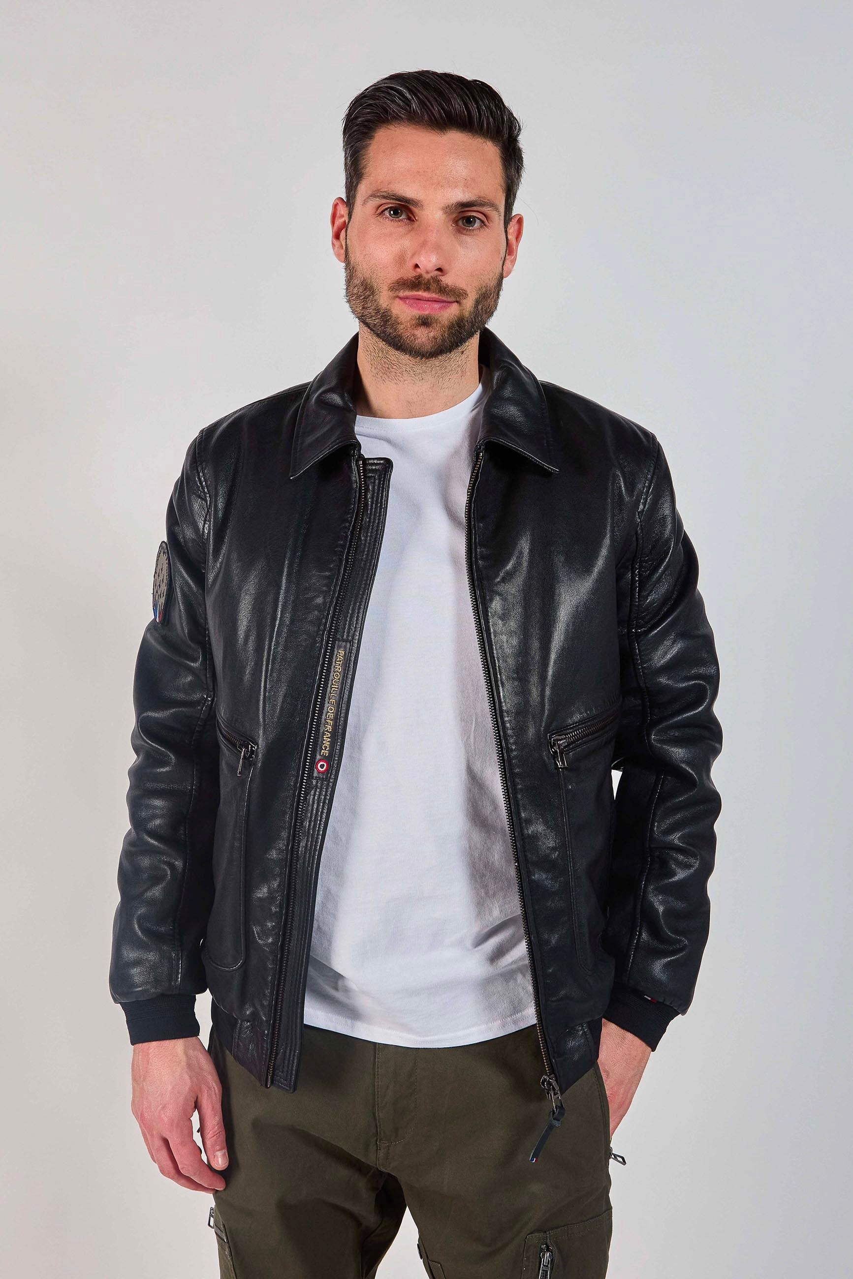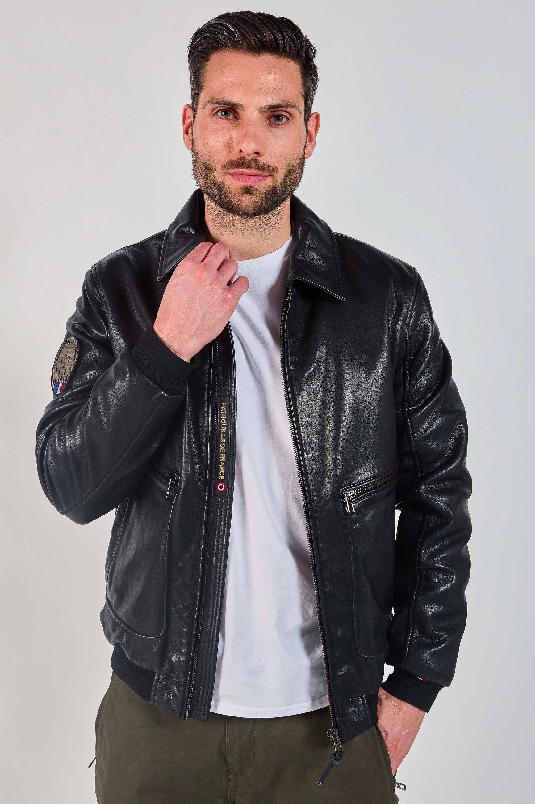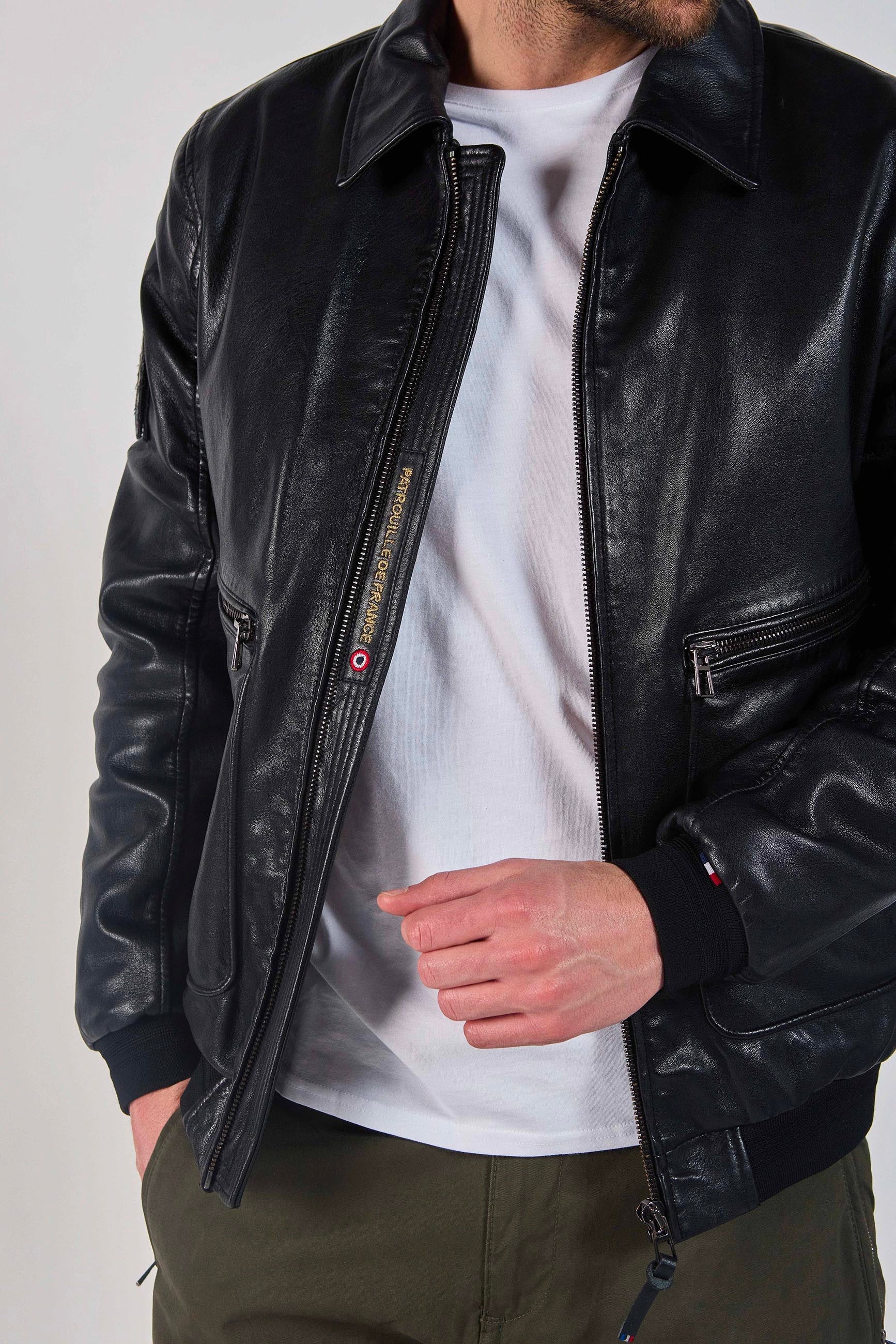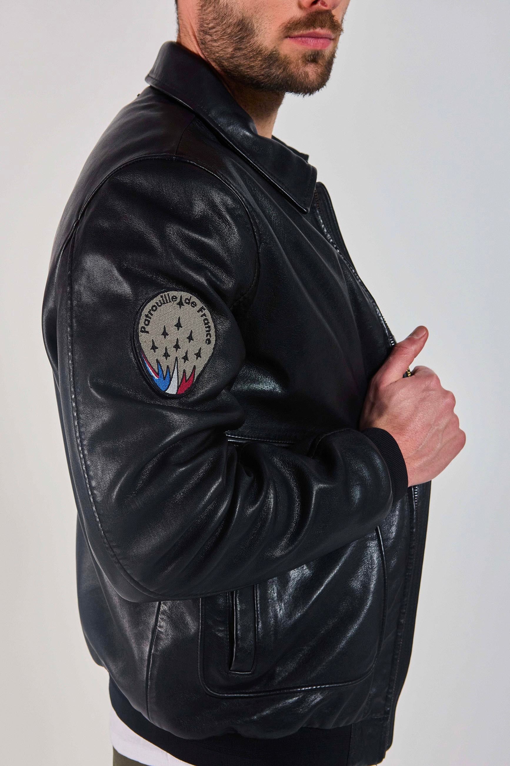 Veste FIREFLY EARTH en cuir d'agneau, col à revers, 2 poches zippées latéales, 2 poches raglans en latérales, zip central, logo scratché PATROUILLE DE France au niveau de l'épaule droite, petit drapeau français brodé sur la manche gauche. Collection Patrouille De France by Redskins.
