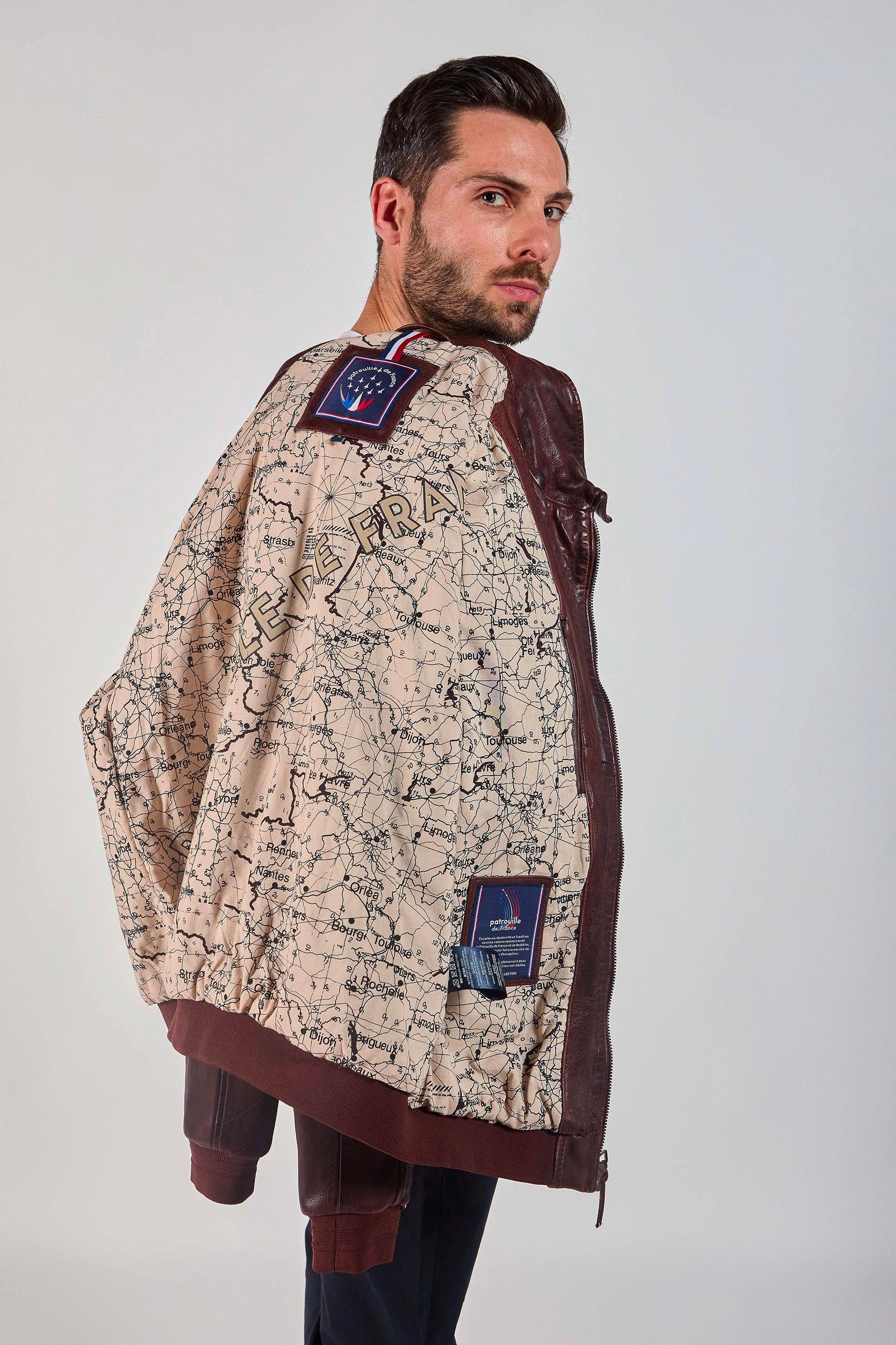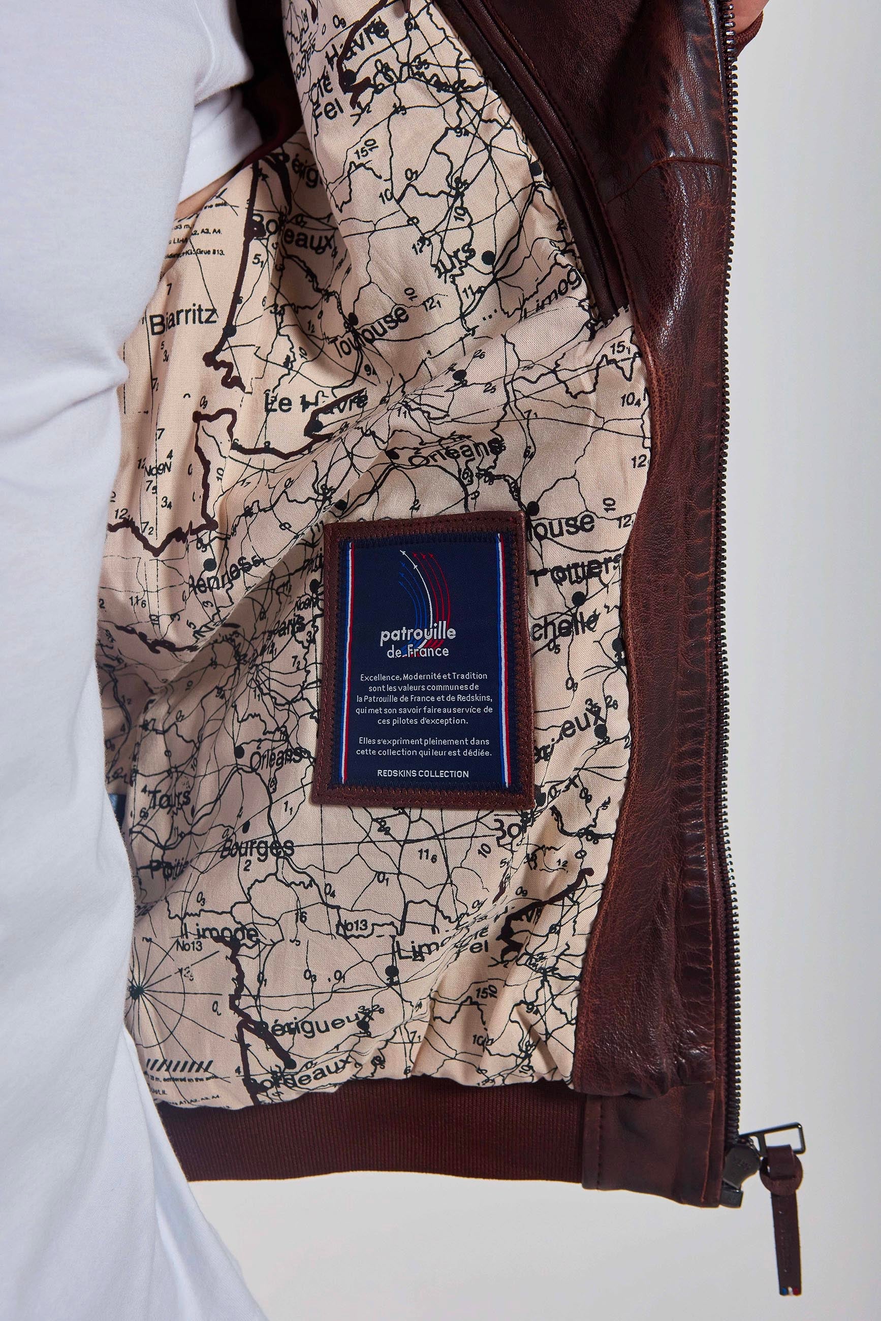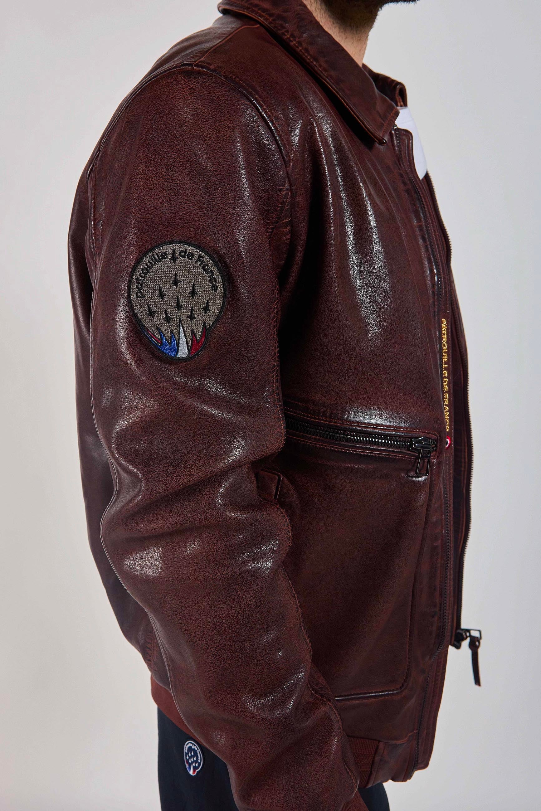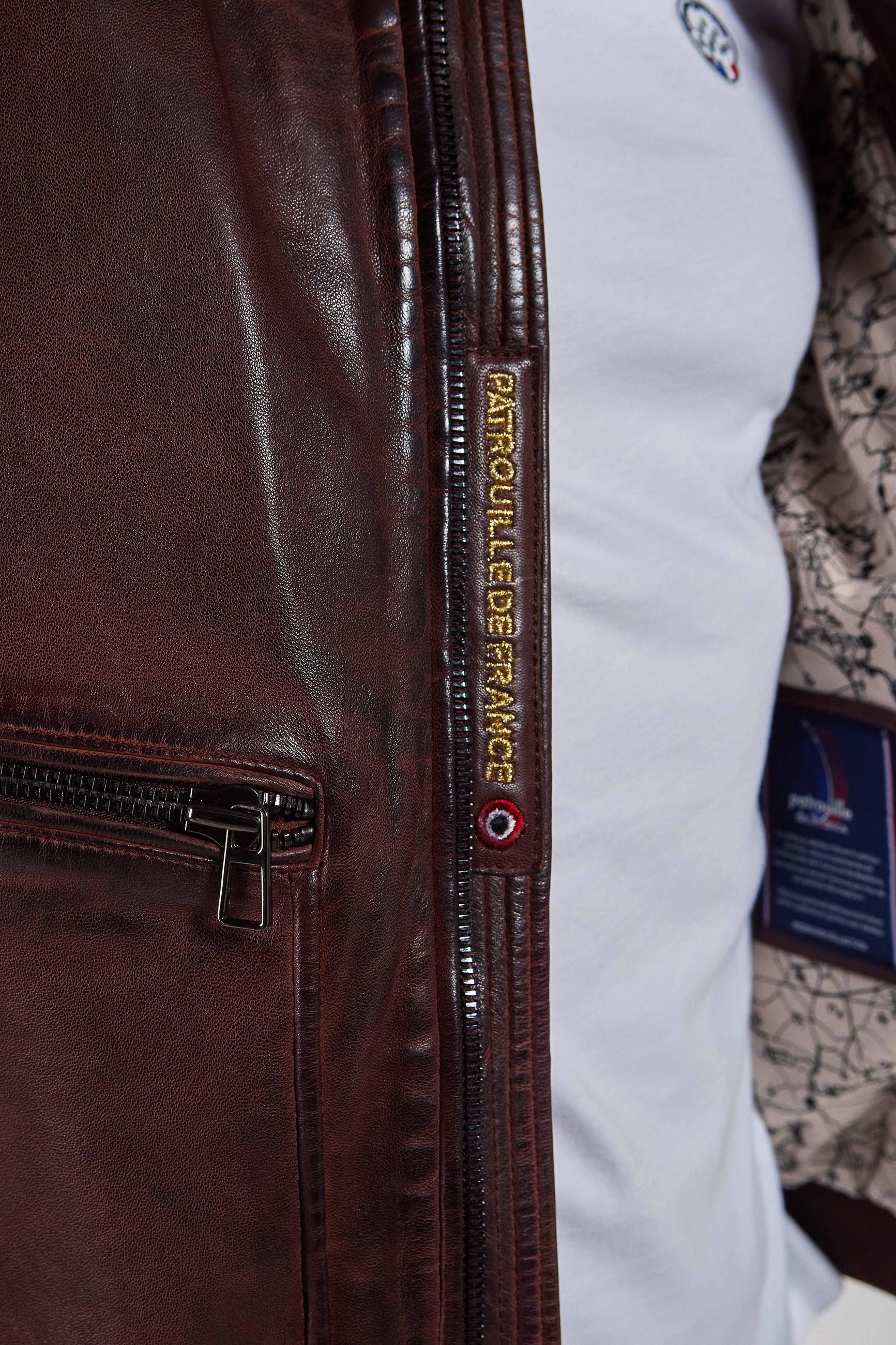 Veste FIREFLY EARTH en cuir d'agneau, col à revers, 2 poches zippées latéales, 2 poches raglans en latérales, zip central, logo scratché PATROUILLE DE France au niveau de l'épaule droite, petit drapeau français brodé sur la manche gauche. Collection Patrouille De France by Redskins.