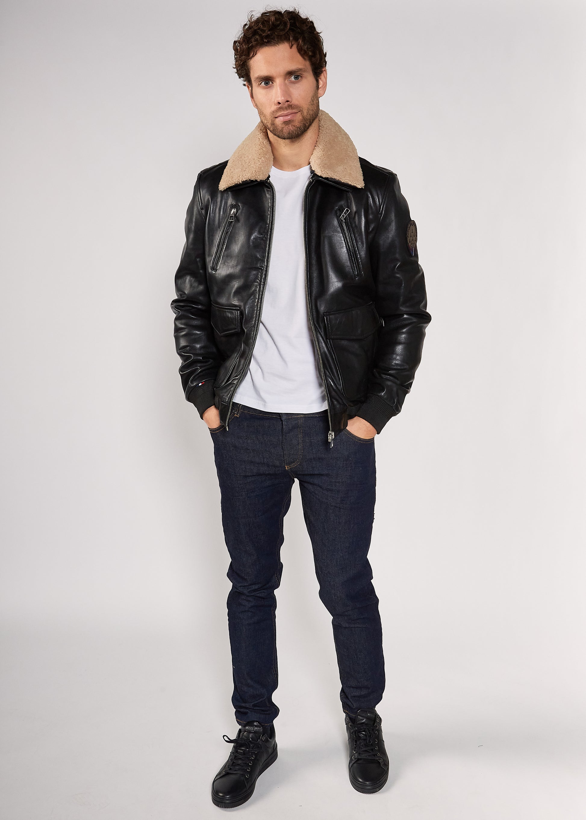 Le blouson FLIGHT SIERRA est inspiré des uniformes d'aviateurs avec une coupe cintrée, du bord-côte aux poignets et à la ceinture ainsi qu'une fermeture à zip et plusieurs poches à l'avant. 2 poches diagonales zippées sur la poitrine, 2 poches à rabats avec des pressions. Le blouson est ornée d'un col fourrure amovible au ton clair et d'un badge de la PAF sur le côté droit.