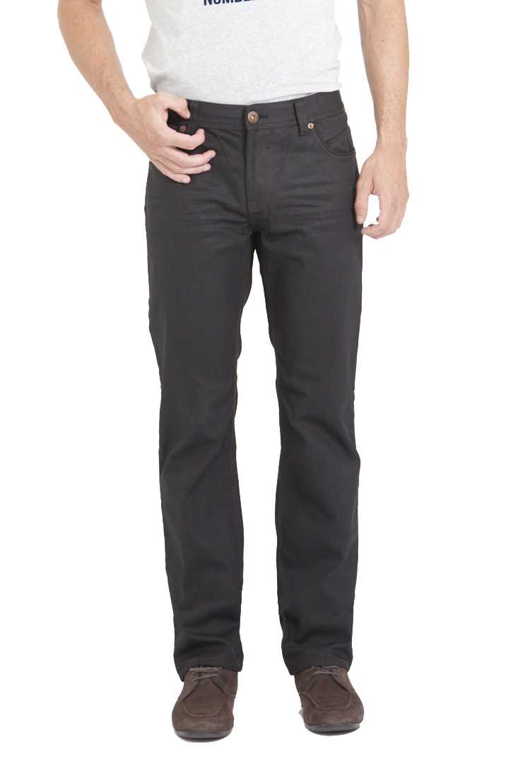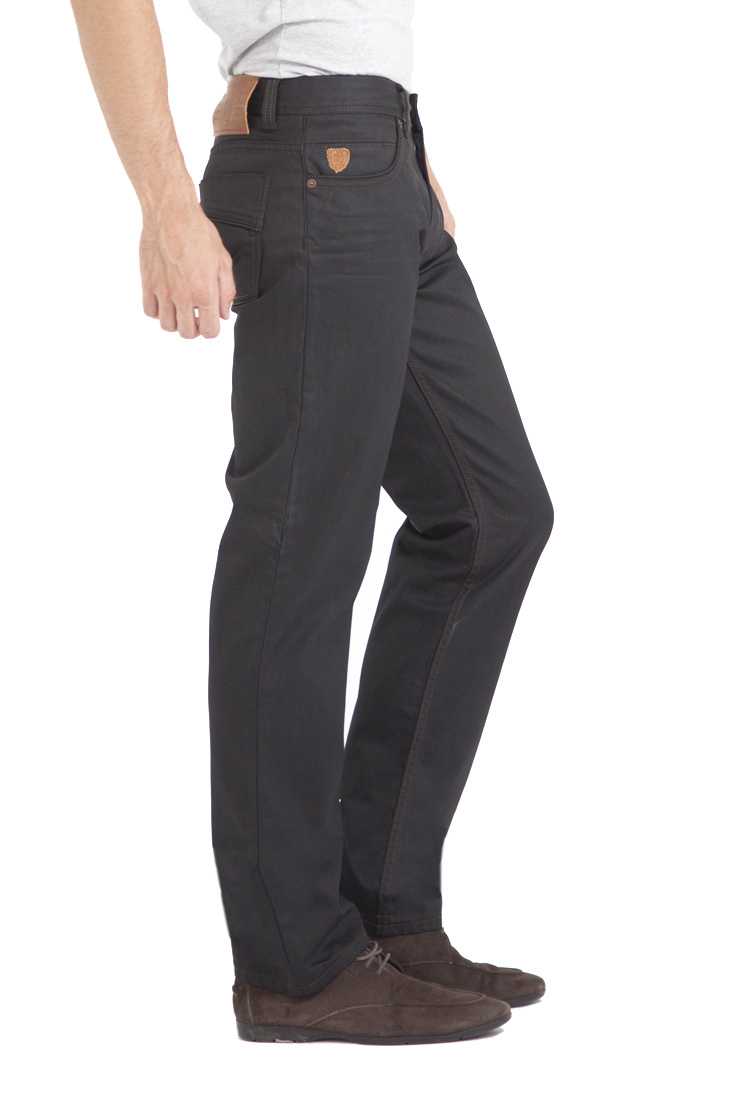 Jeans Noir enduit - coupe Regular - 5 poches (2 devant + 1 ticket et 2 poches fantaisies plaquées au dos) - Braguette zippée - 5 passants - Petite plaque métal accrochée à la poche ticket - Les surpiqûres sont de coloris marron - Léger effet Froissé en haut des cuisses