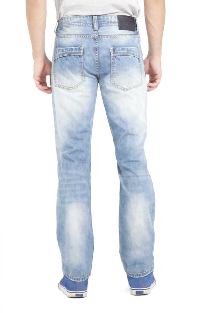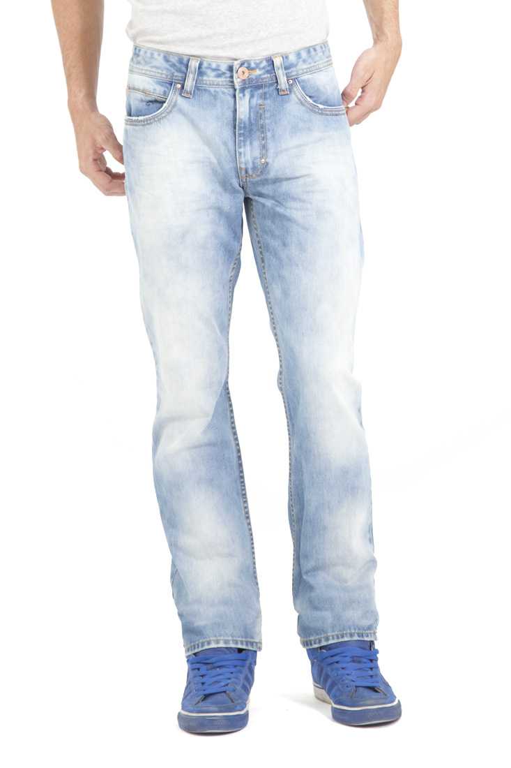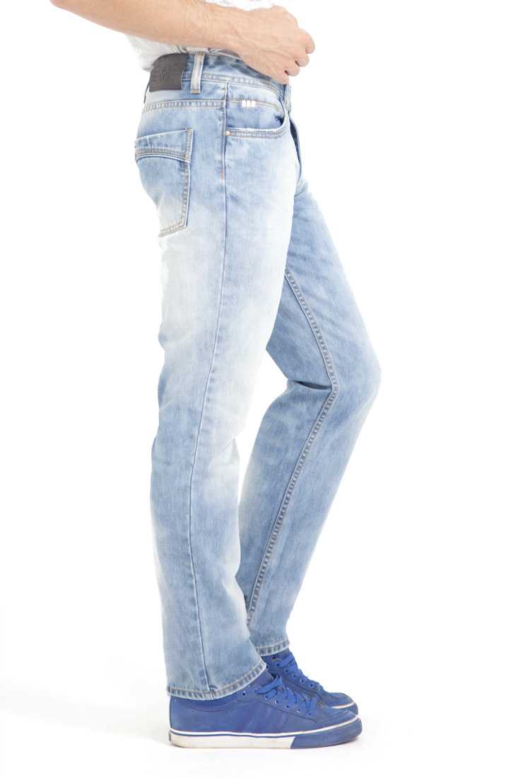 Jeans délavé - coupe Regular - 5 poches (2 devant + 1 ticket et 2 poches fantaisies plaquées au dos) - Braguette zippée - 5 passants - Petite plaque métal accrochée à la poche ticket - Les surpiqûres sont bicolores (marine et gris clair) – Léger effet Froissé en haut des cuisses