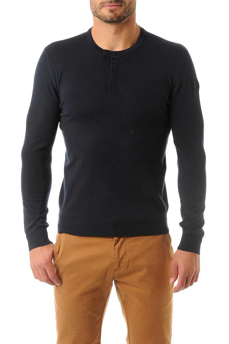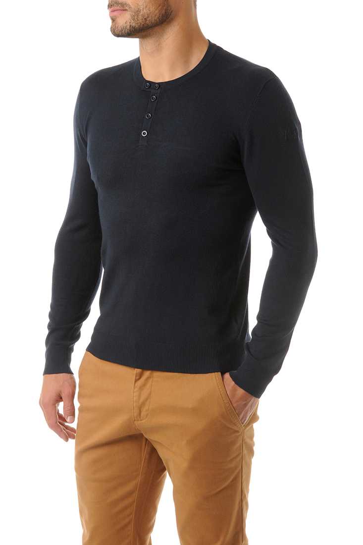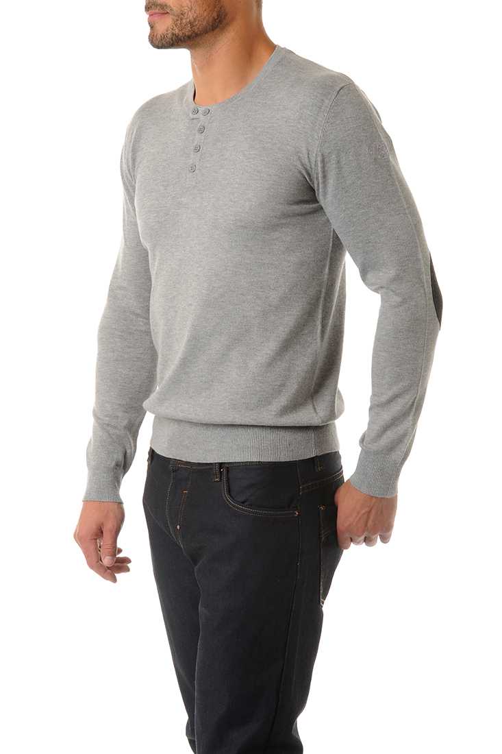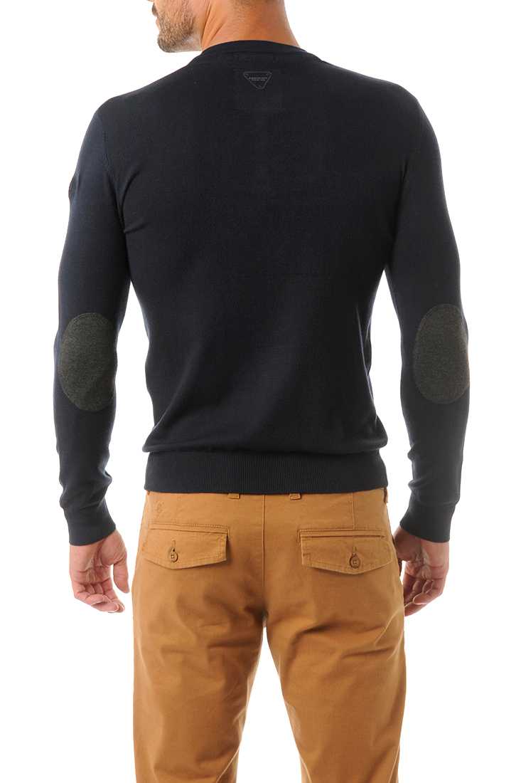 Pull fin en Viscose & Nylon, Col rond boutonné - Coudières contrastées anthracite - Broderie ton sur ton en haut de la manche et petit print en forme triangulaire sous l'encolure dos.