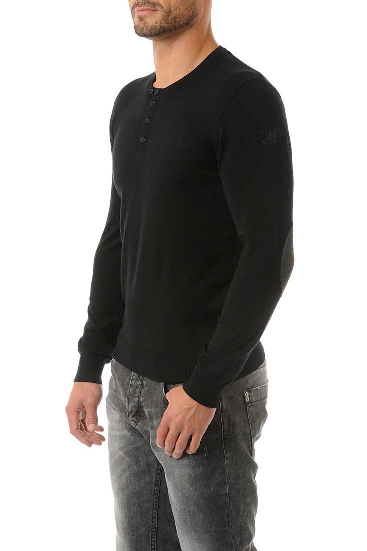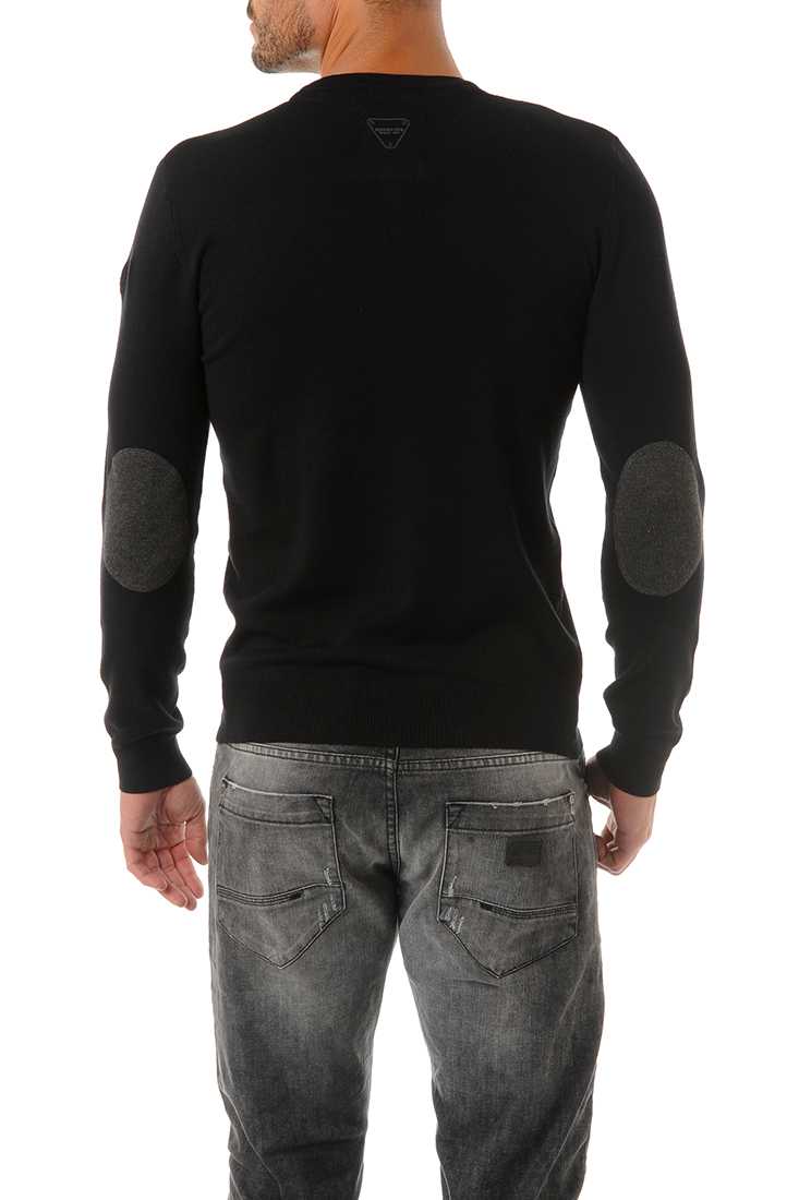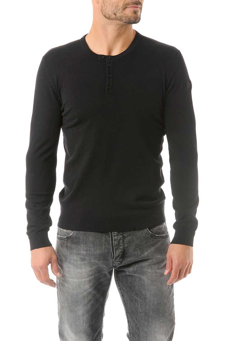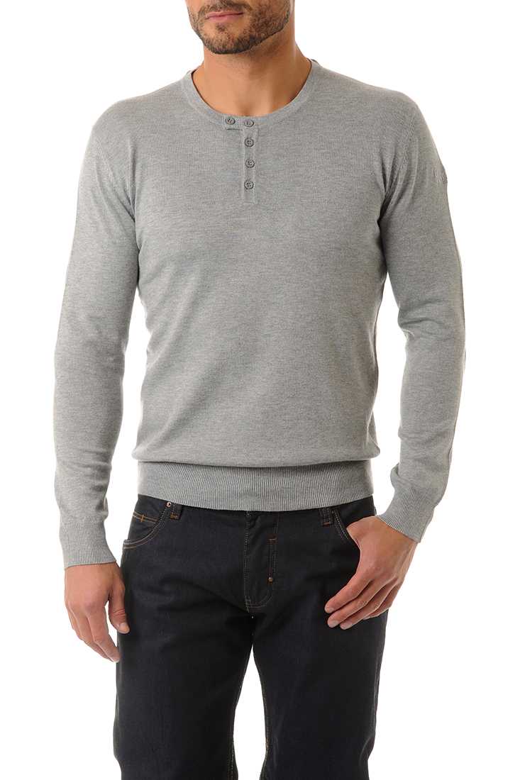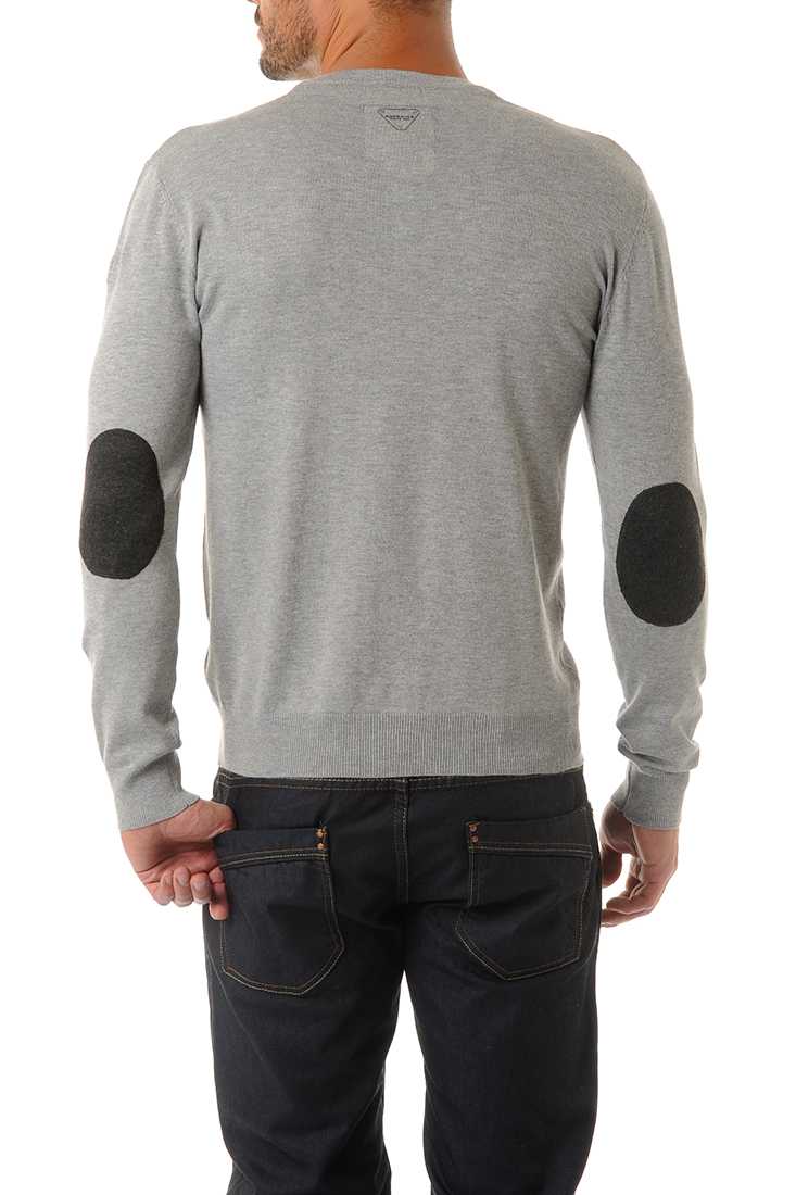 Pull fin en Viscose & Nylon, Col rond boutonné - Coudières contrastées anthracite - Broderie ton sur ton en haut de la manche et petit print en forme triangulaire sous l'encolure dos.