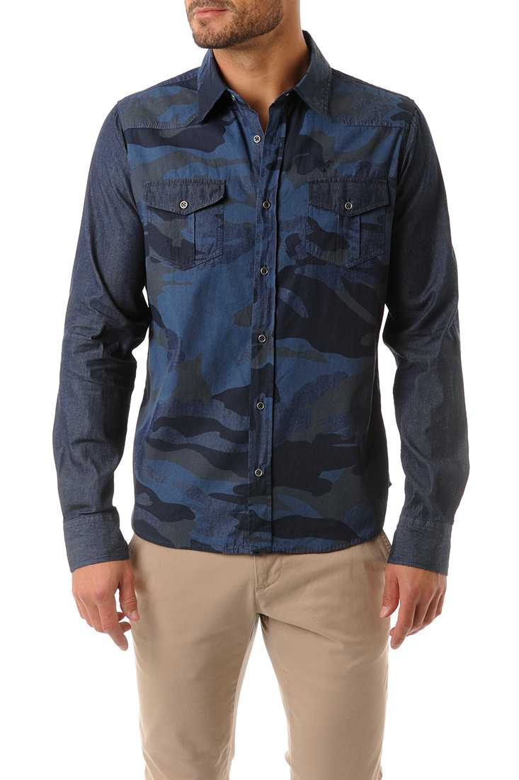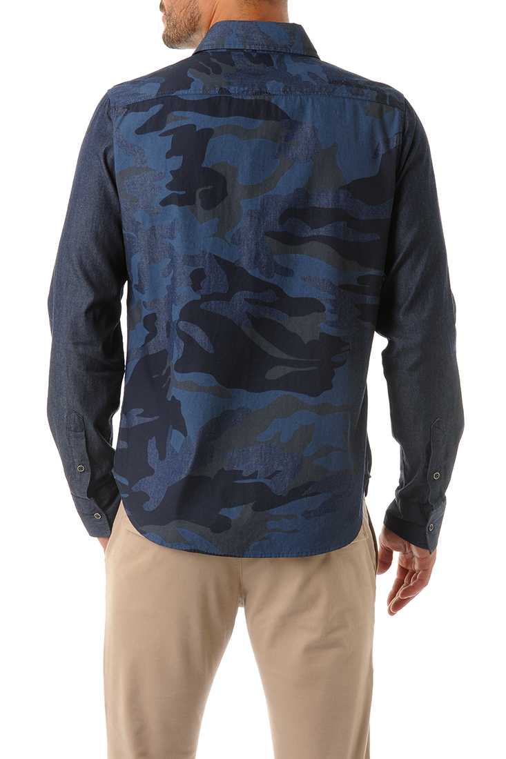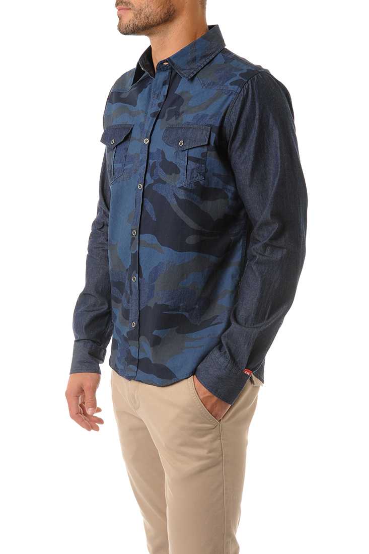 Chemise en Coton, Jeans : devant et dos à motifs camouflage marine - Manches longues - Empiècement Western sur le devant des épaules - 2 poches plaquées à rabat boutonné sur la poitrine - Boutons en métal argent vieilli - Sérigraphie blanche à l'intérieur d'un seul poignet et petit label rouge cousu à l'extérieur du poignet opposé - « Redskins Since 1984 » ton sur ton brodé sur l'épaule droite au dos et broderie Phoenix sur la poitrine.