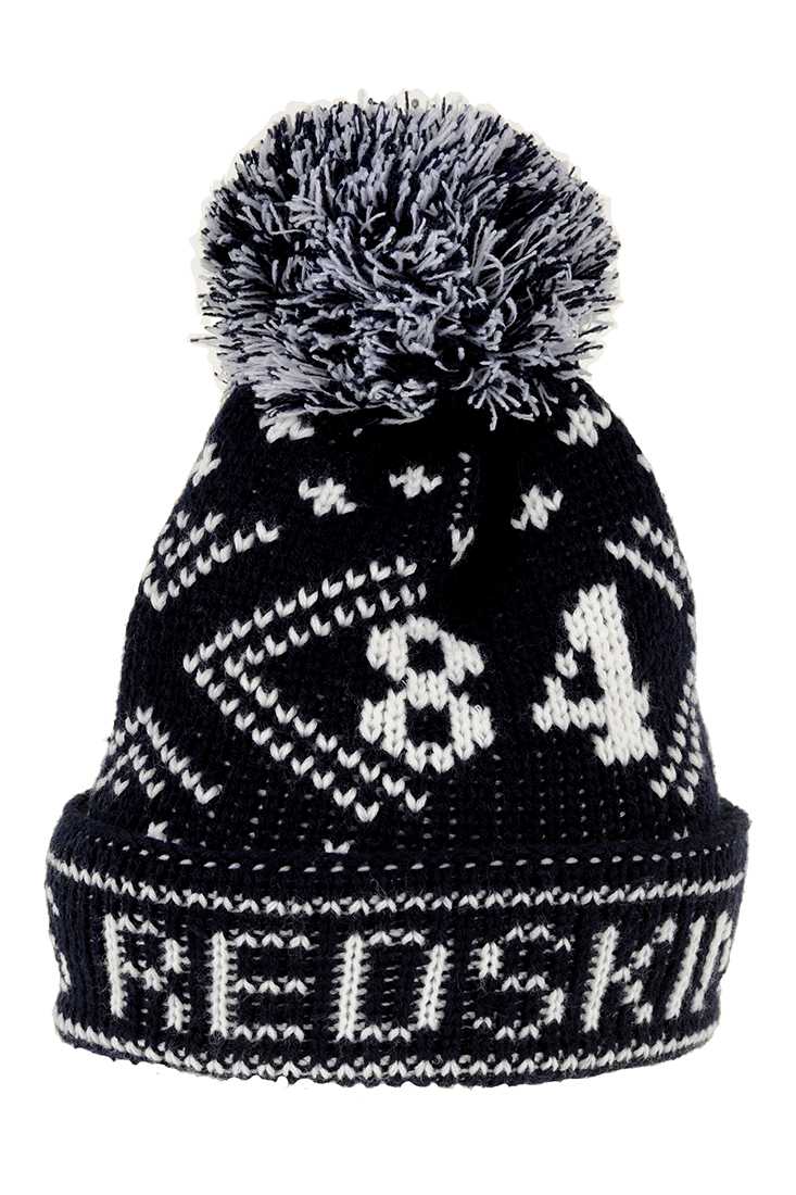 Bonnet de ski marine, Jacquard écru et pompon sur le dessus.