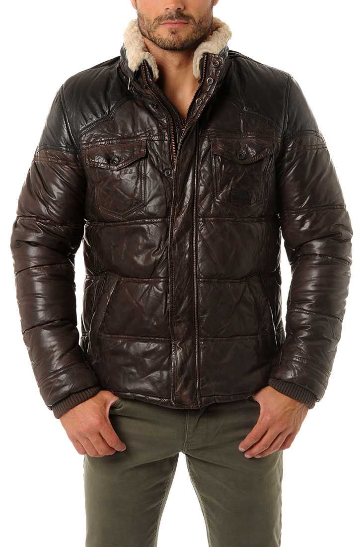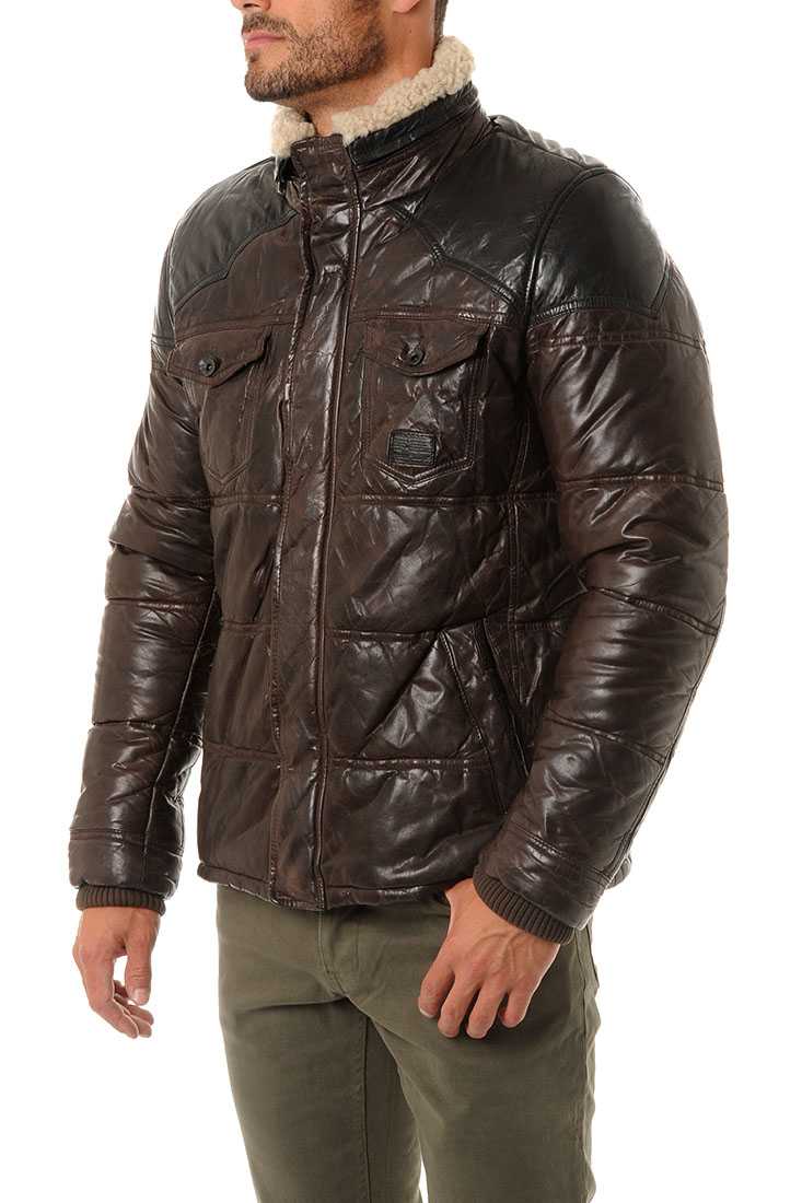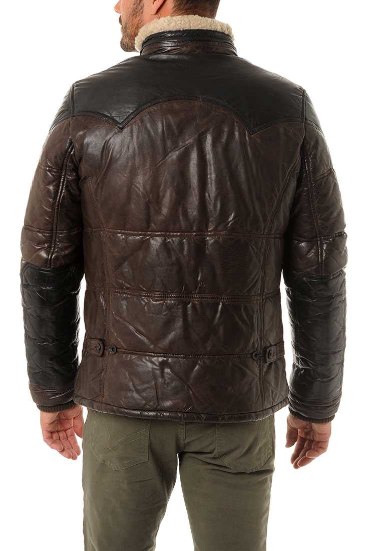 Doudoune en cuir de vachette & Denim - Fermeture zippée et pressions - Col montant + Col fourrure amovible zippé - 2 poches poitrine plaquées avec rabats et 2 poches bas passepoilées à pressions - Bas de manches en bord côte - Patch en cuir « Redskins » poche poitrine - 2 poches intérieures plaquées + 1 poche zippée - Doublure corps 100 % Coton et doublure manches 100 % Polyester.