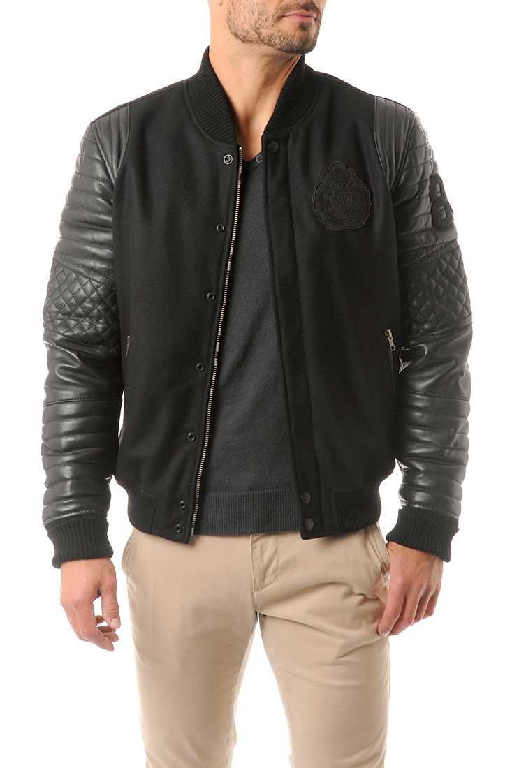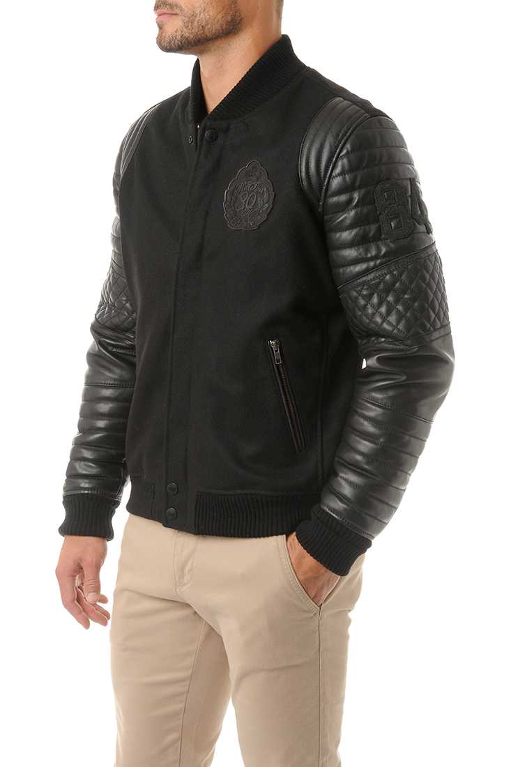 Blouson en drap de laine & cuir d'agneau, type Teddy, Fermeture zippée, 1 badge poitrines + 1 badge haut de manche + 2 poches bas, Rib au col, bas de manches et ceinture, 2 poches intérieures zippées, Doublure 100 % Polyester.