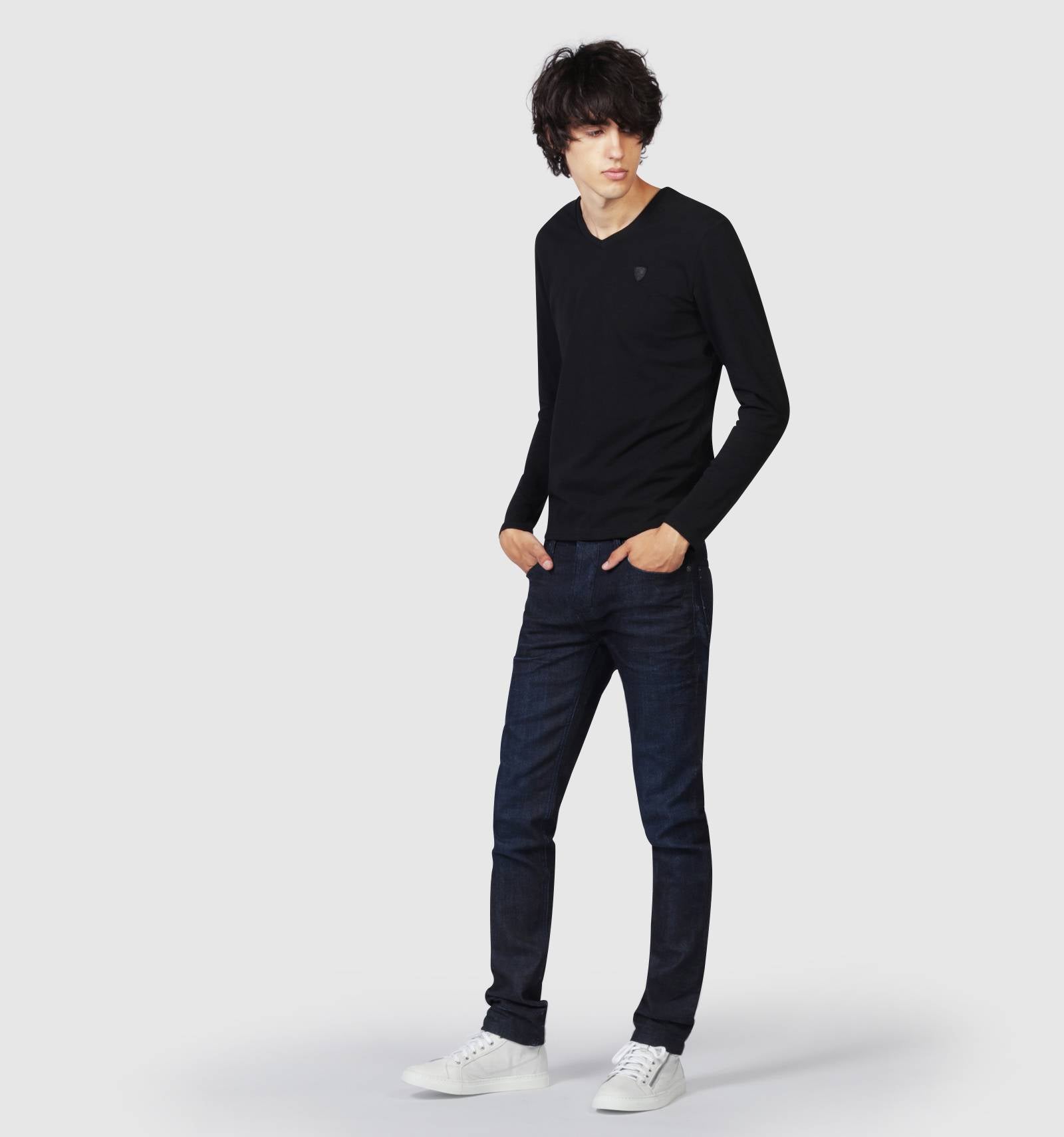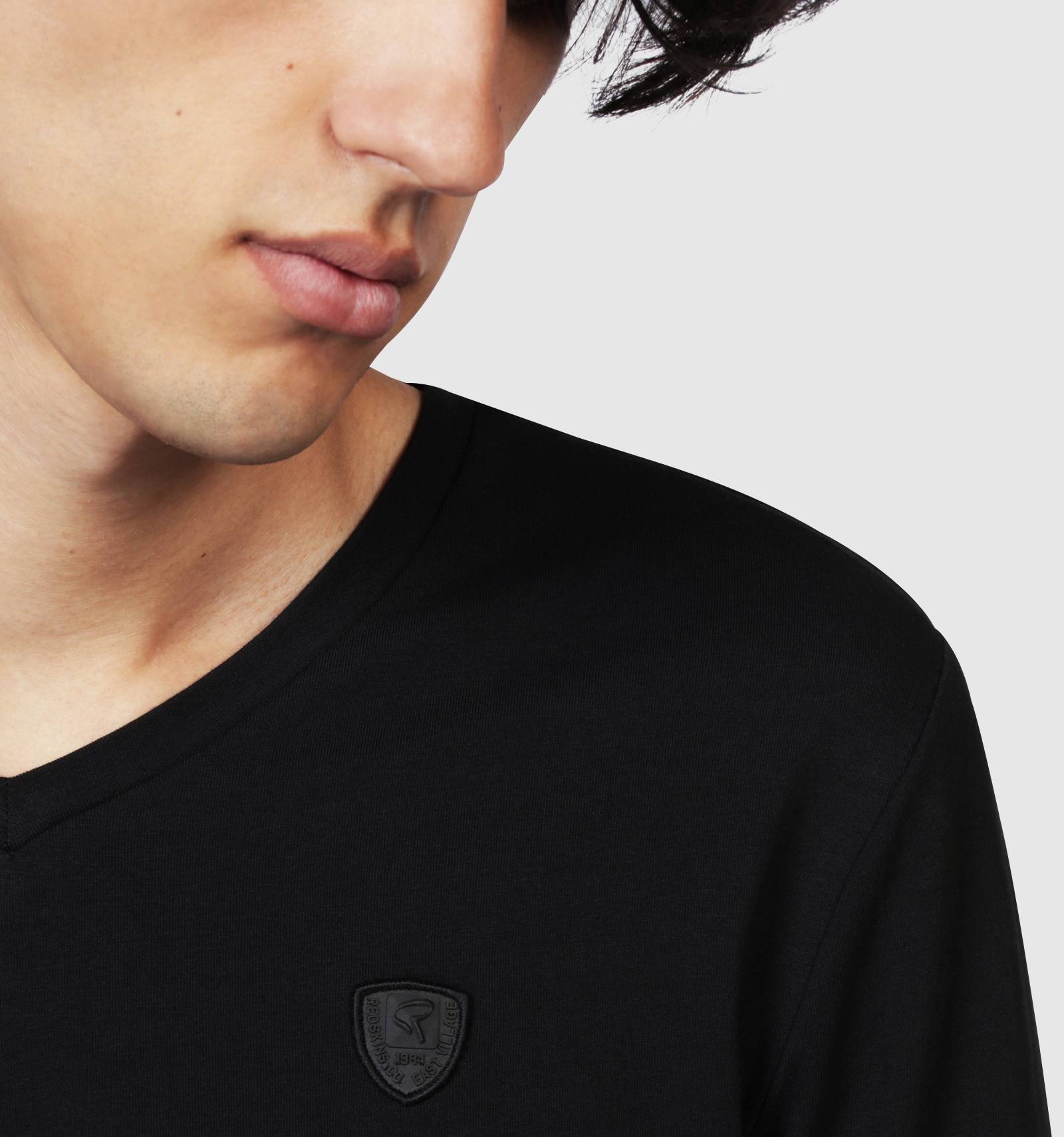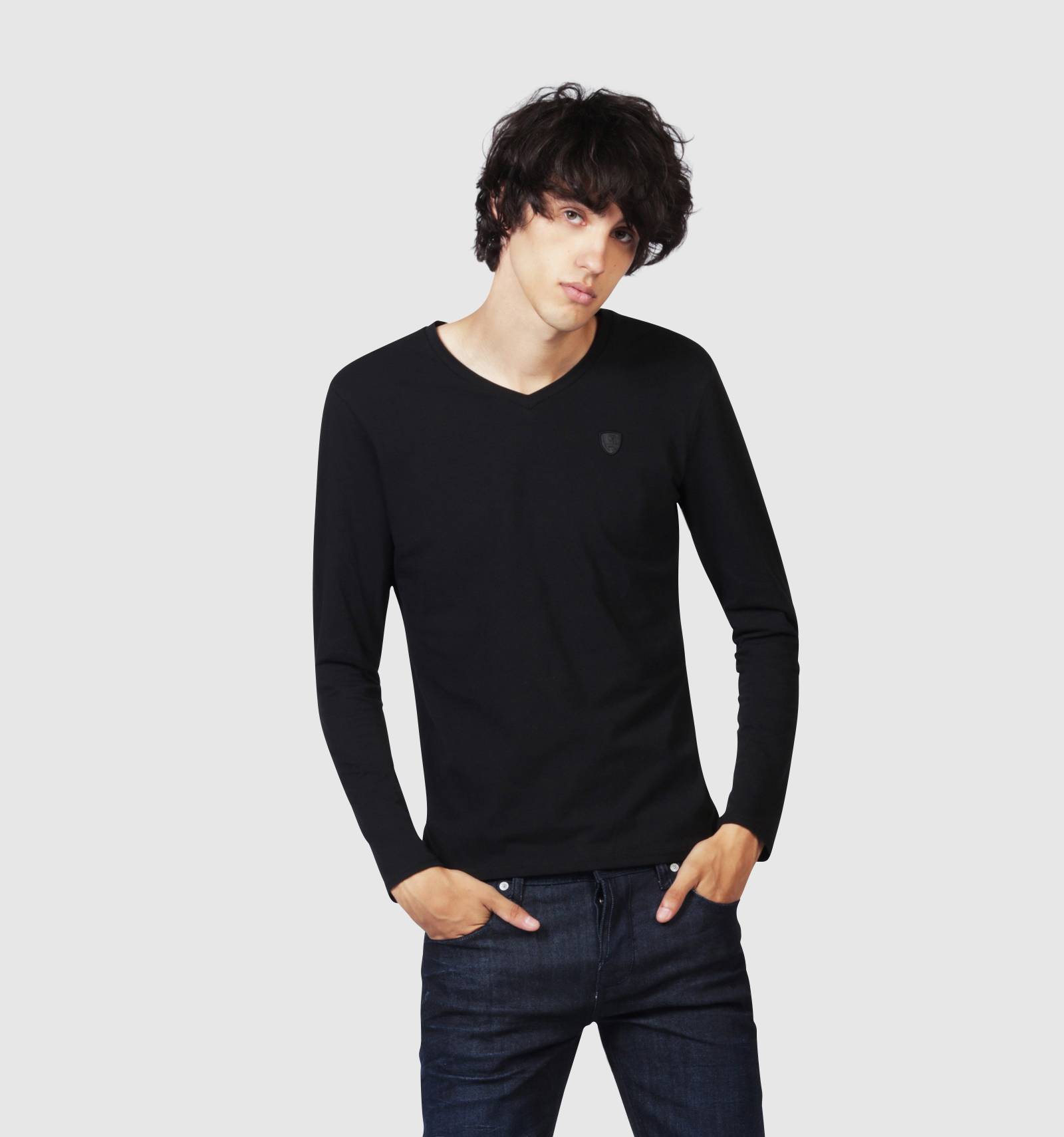 Le t-shirt manches longues AIKIDO CALDER est un essentiel du vestiaire masculin. Confectionné en coton noir, sa coupe ajustée, son col V ourlé et l'écusson en gomme placé à la poitrine en font une pice à la fois confortable et élégante.