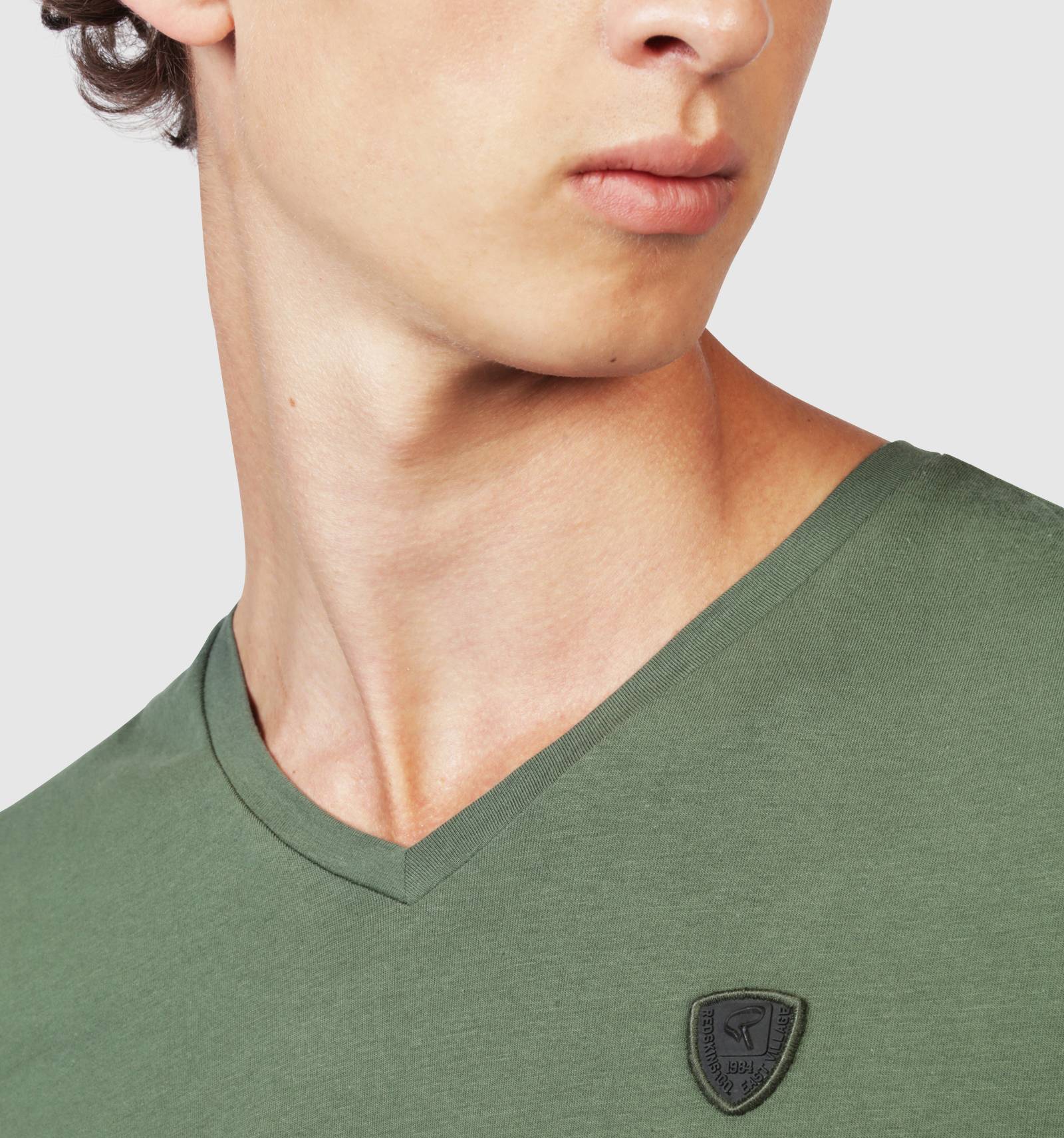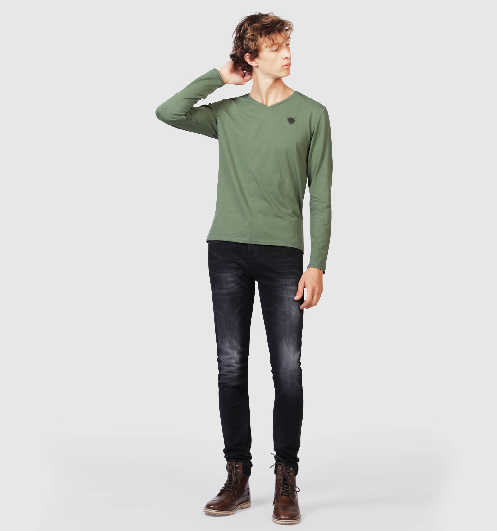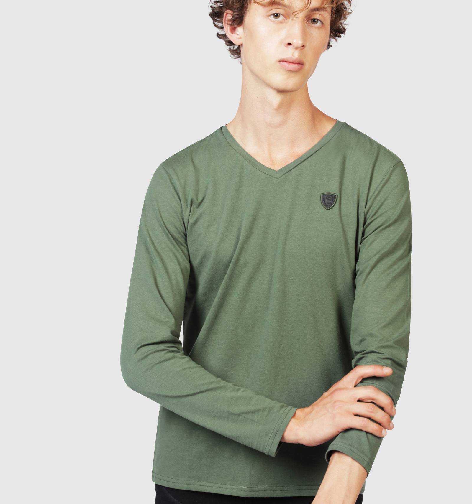 Le t-shirt manches longues AIKIDO CALDER est un essentiel du vestiaire masculin. Confectionné en coton kaki sa coupe ajustée, son col V ourlé et l'écusson en gomme placé à la poitrine en font une pice à la fois confortable et élégante.