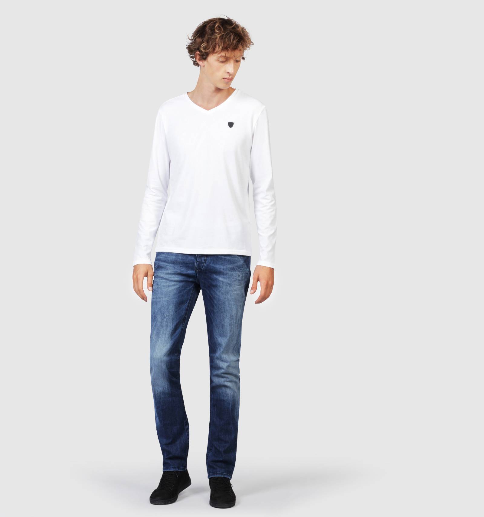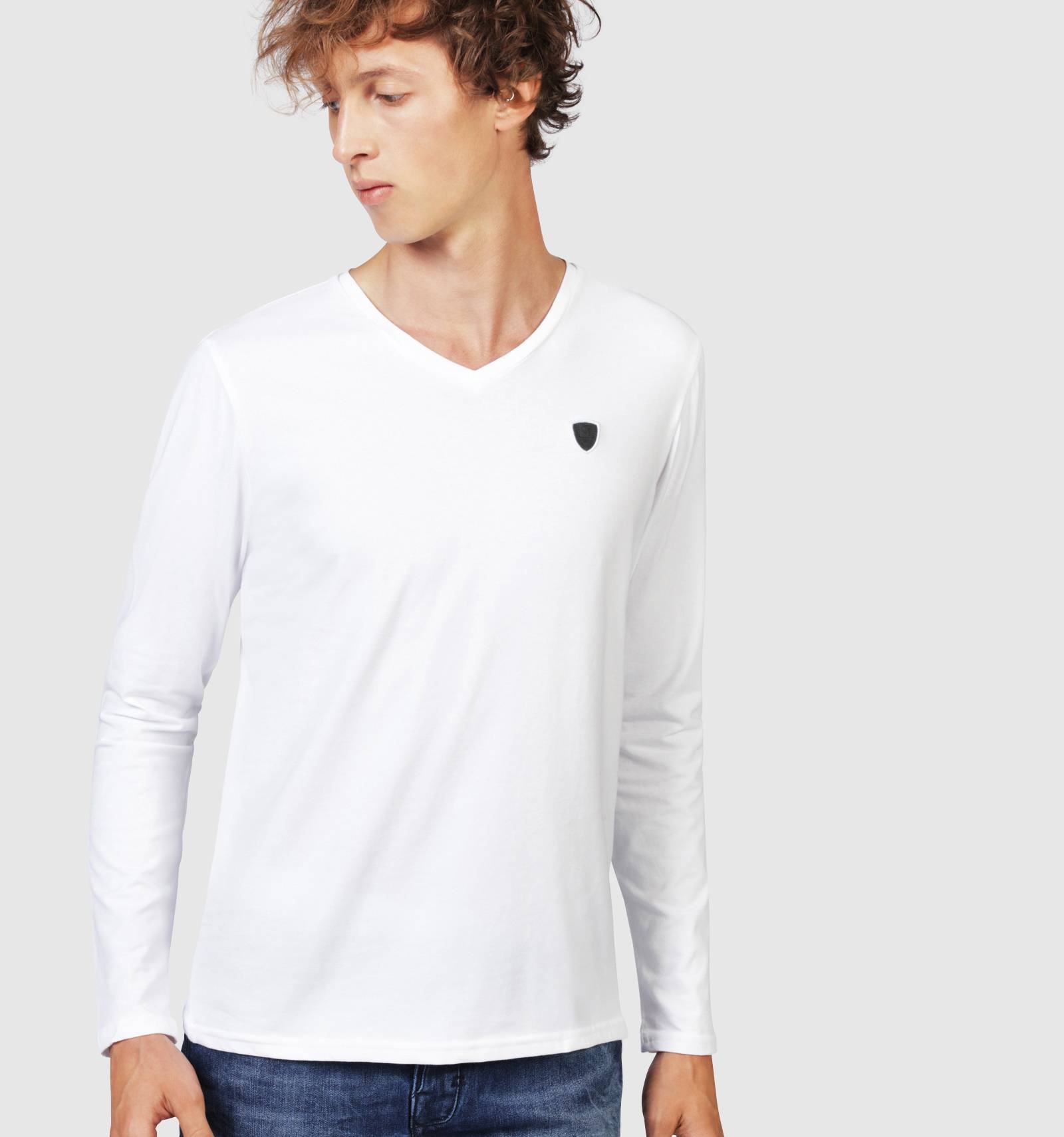 Le t-shirt manches longues AIKIDO CALDER est un essentiel du vestiaire masculin. Confectionné en coton blanc, sa coupe ajustée, son col V ourlé et l'écusson en gomme placé à la poitrine en font une pice à la fois confortable et élégante.