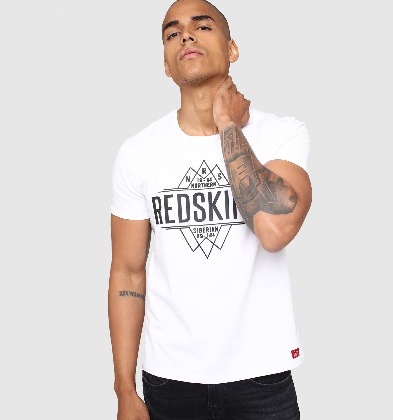 En coton blanc, le t-shirt BIMS CALDER à manches courtes et col rond se distingue par une inscriptions REDSKINS ton sur ton ainsi qu'un écusson rouge à la taille.