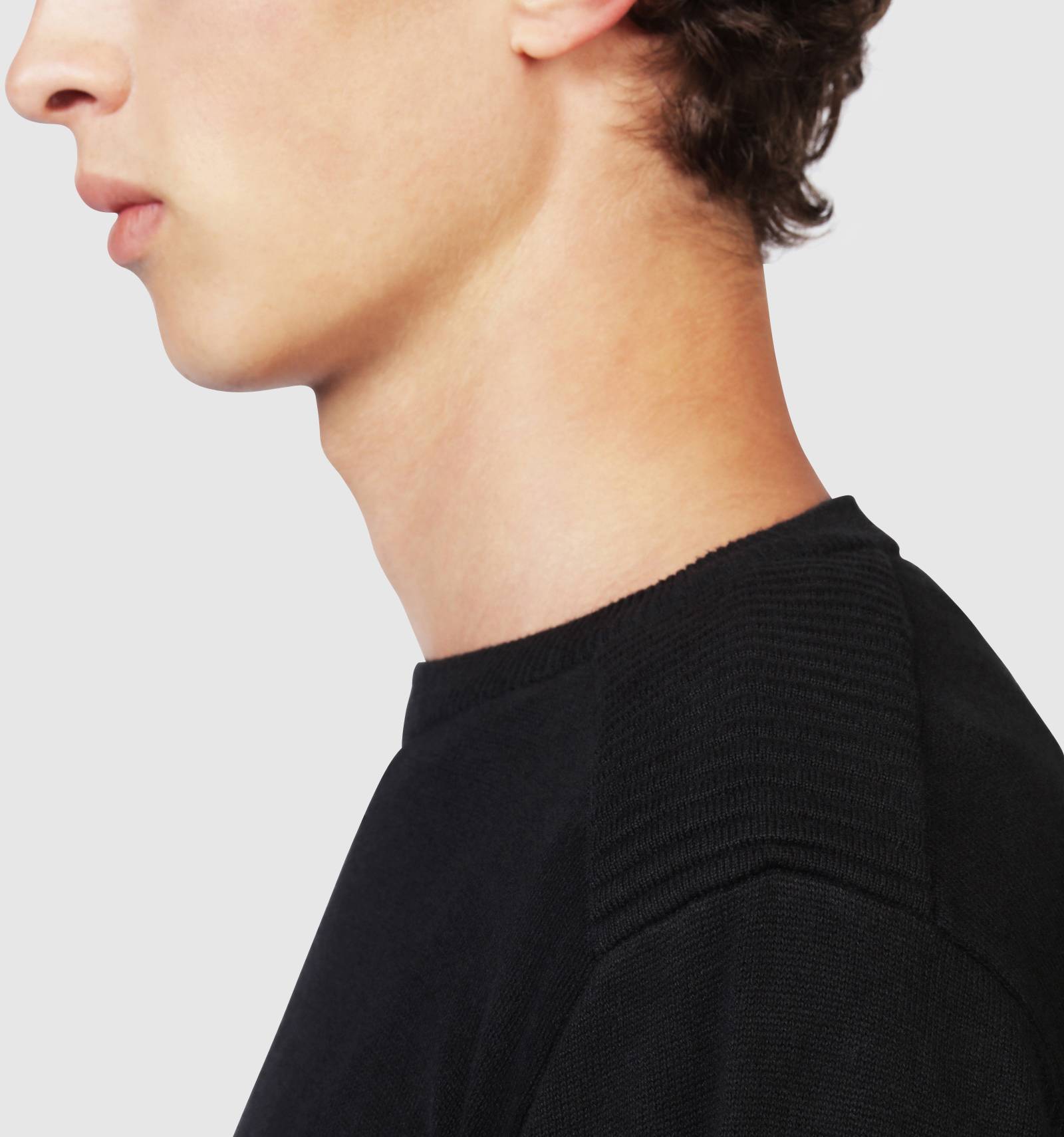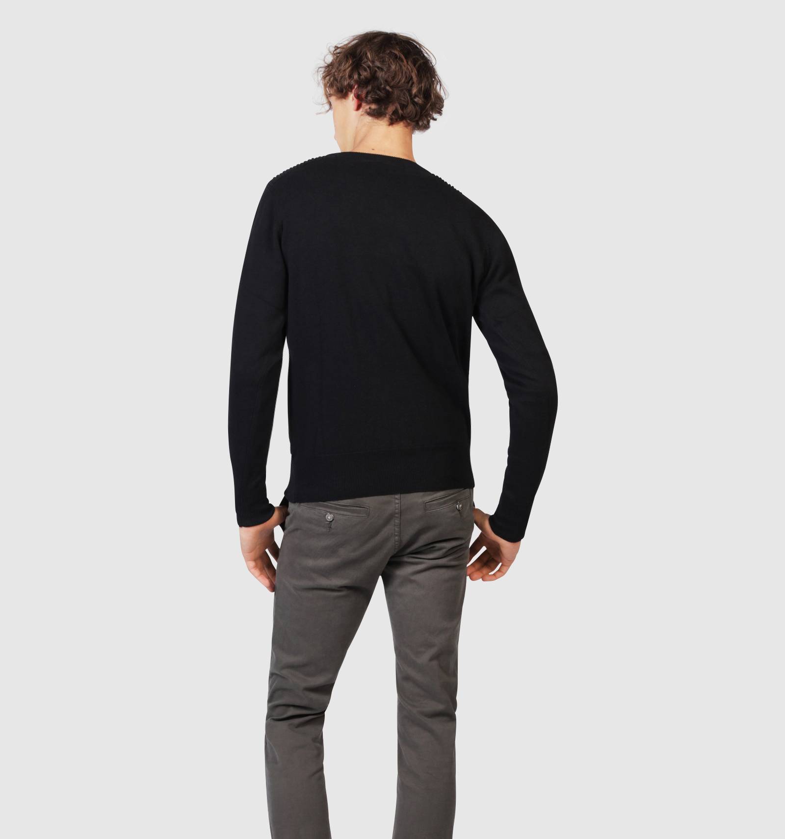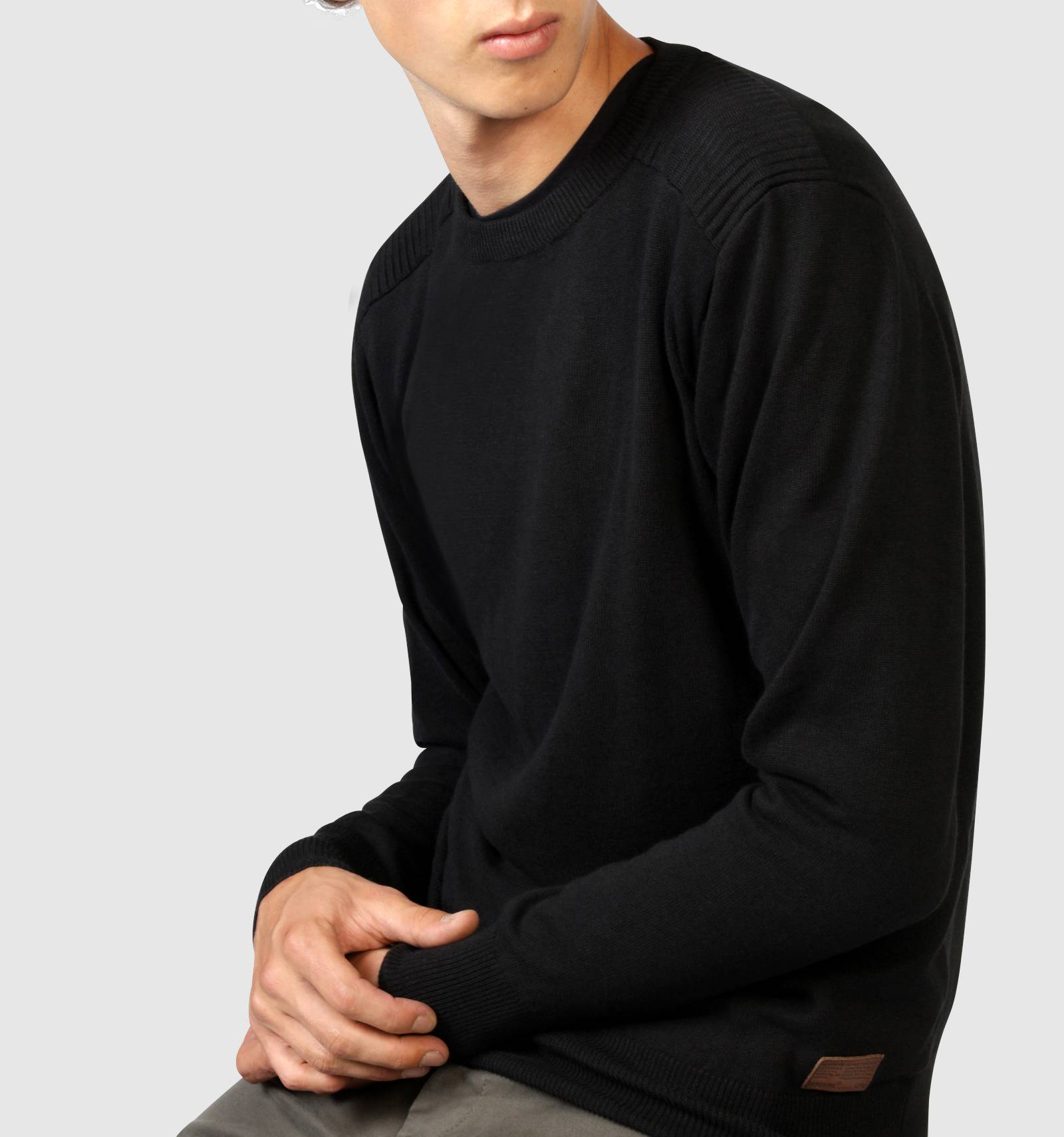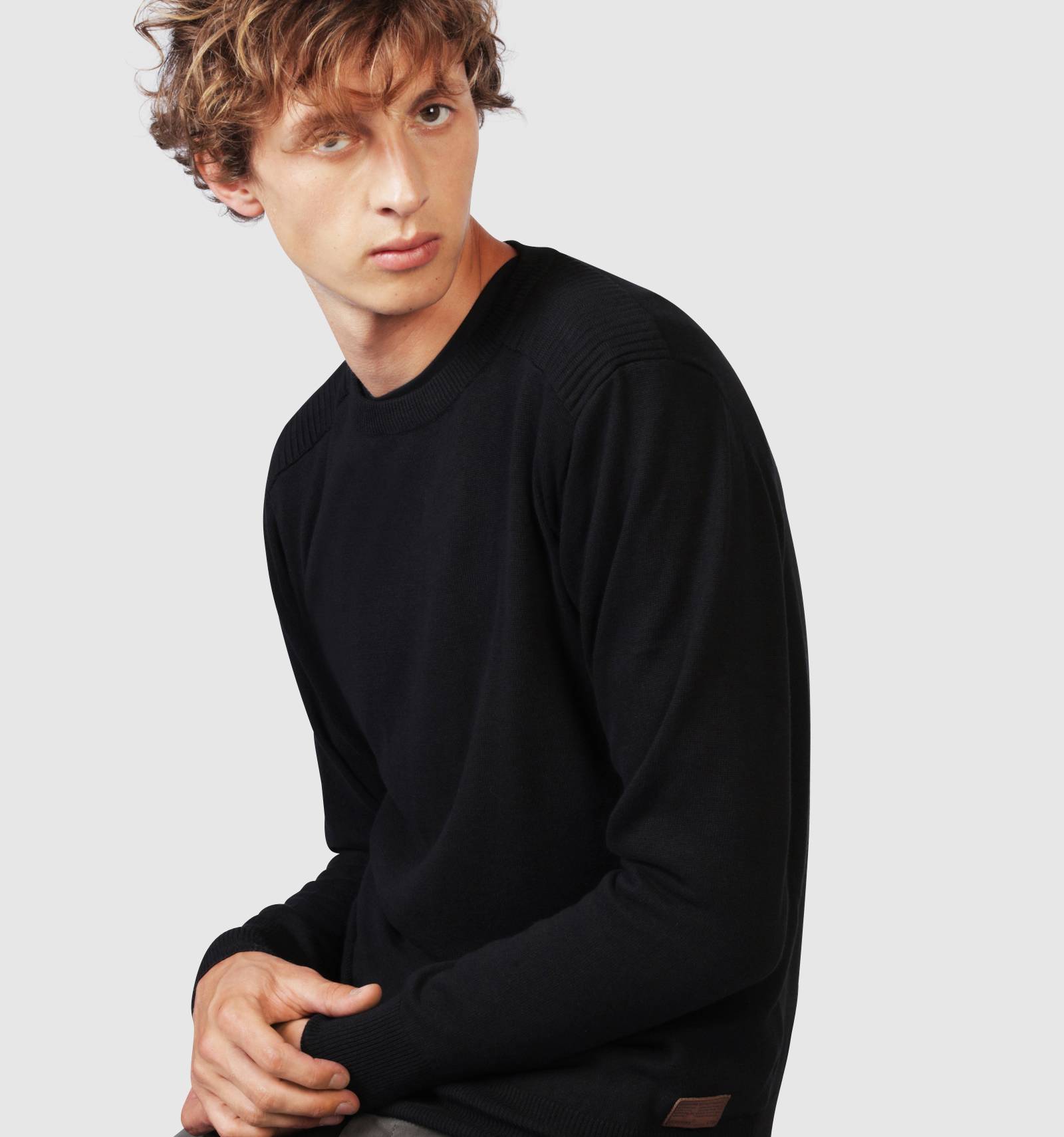 Le pull à manches longues BITTS BEHAVE est confectionné dans une maille noire seconde peau. Ses poignets, son col rond ourlé et sa ceinture sont recouverts de bord-c™te qui cintre sa coupe. Des empicements striés aux épaules et un écusson en cuir à la taille apportent une touche d'originalité à ce modle intemporel.