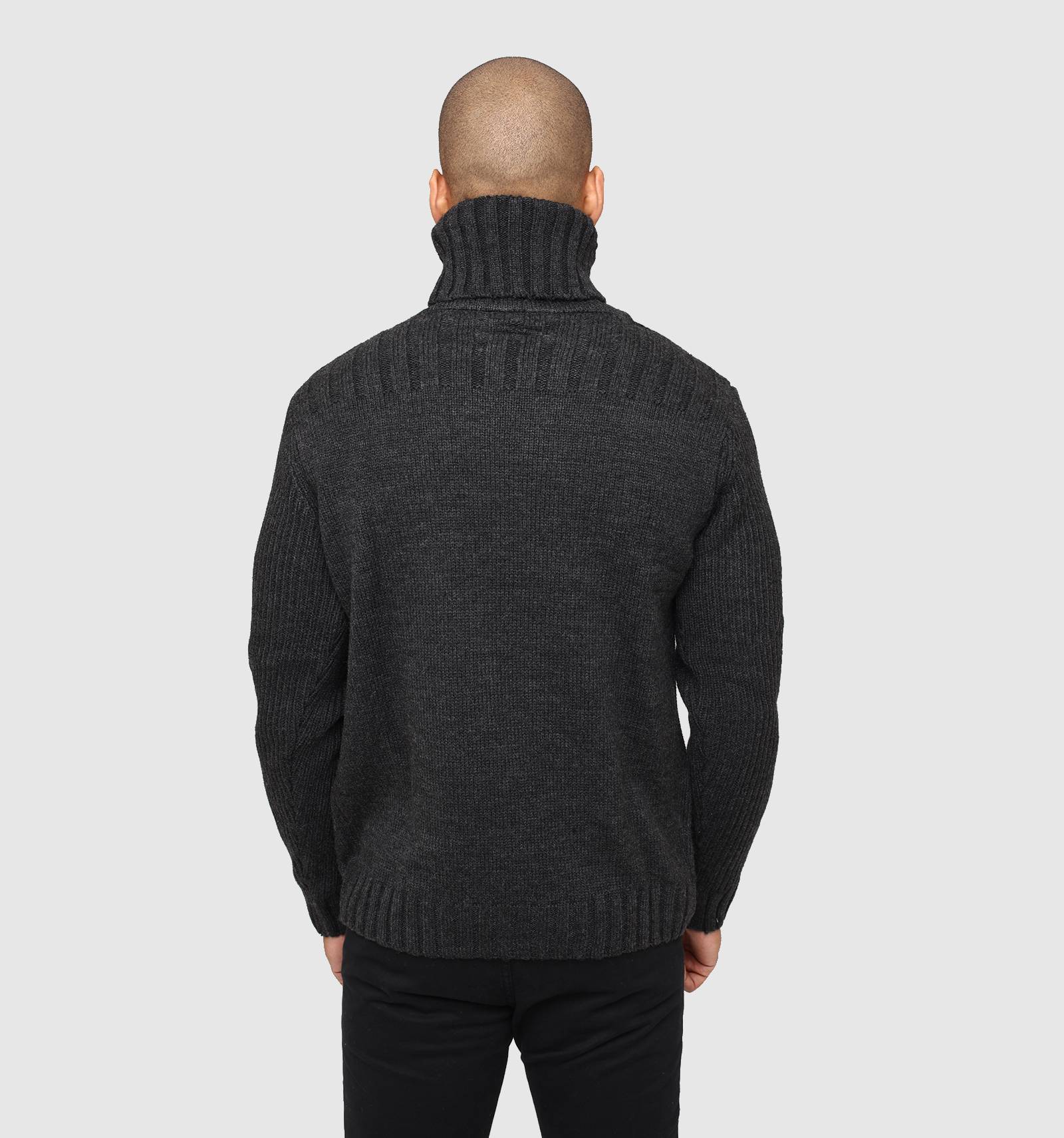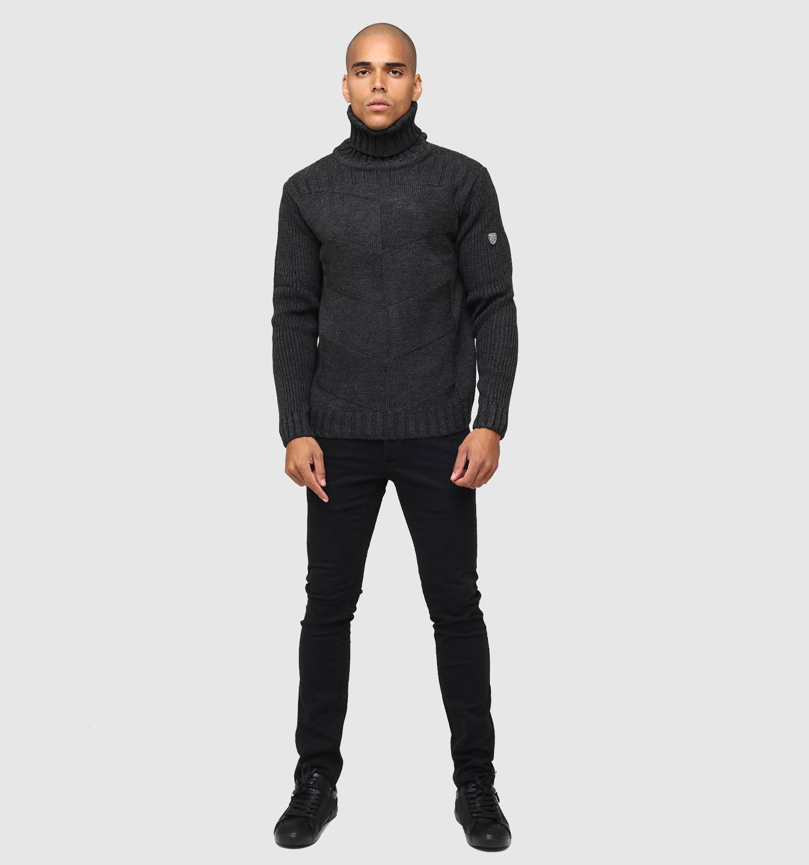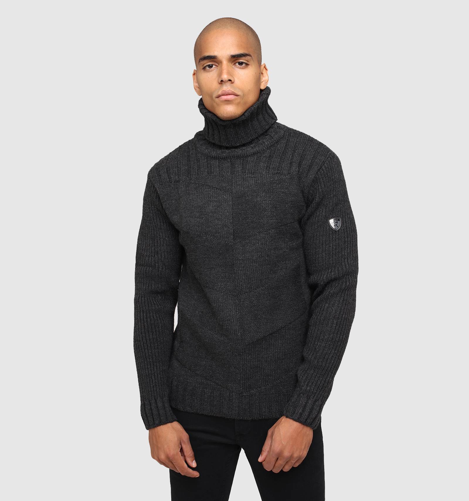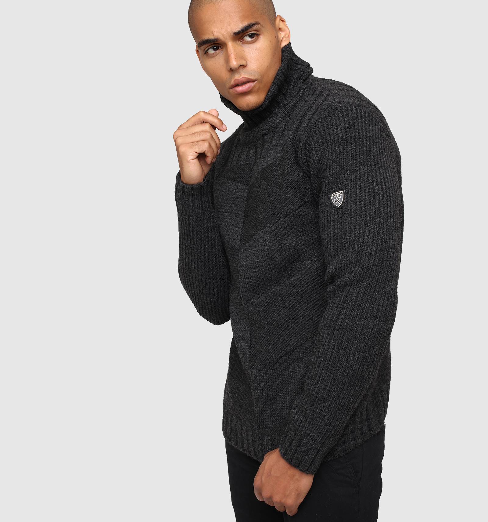 Le pull GUST ACCRIP joue sur les reliefs et adopte un style bien à lui. En laine anthracite, les manches choisissent les rayures, le torse préfère les rectangles, le col est roulé et les poignets et la taille optent pour un traditionnel bord-côte.