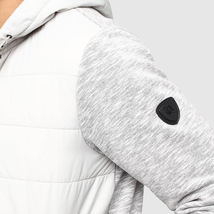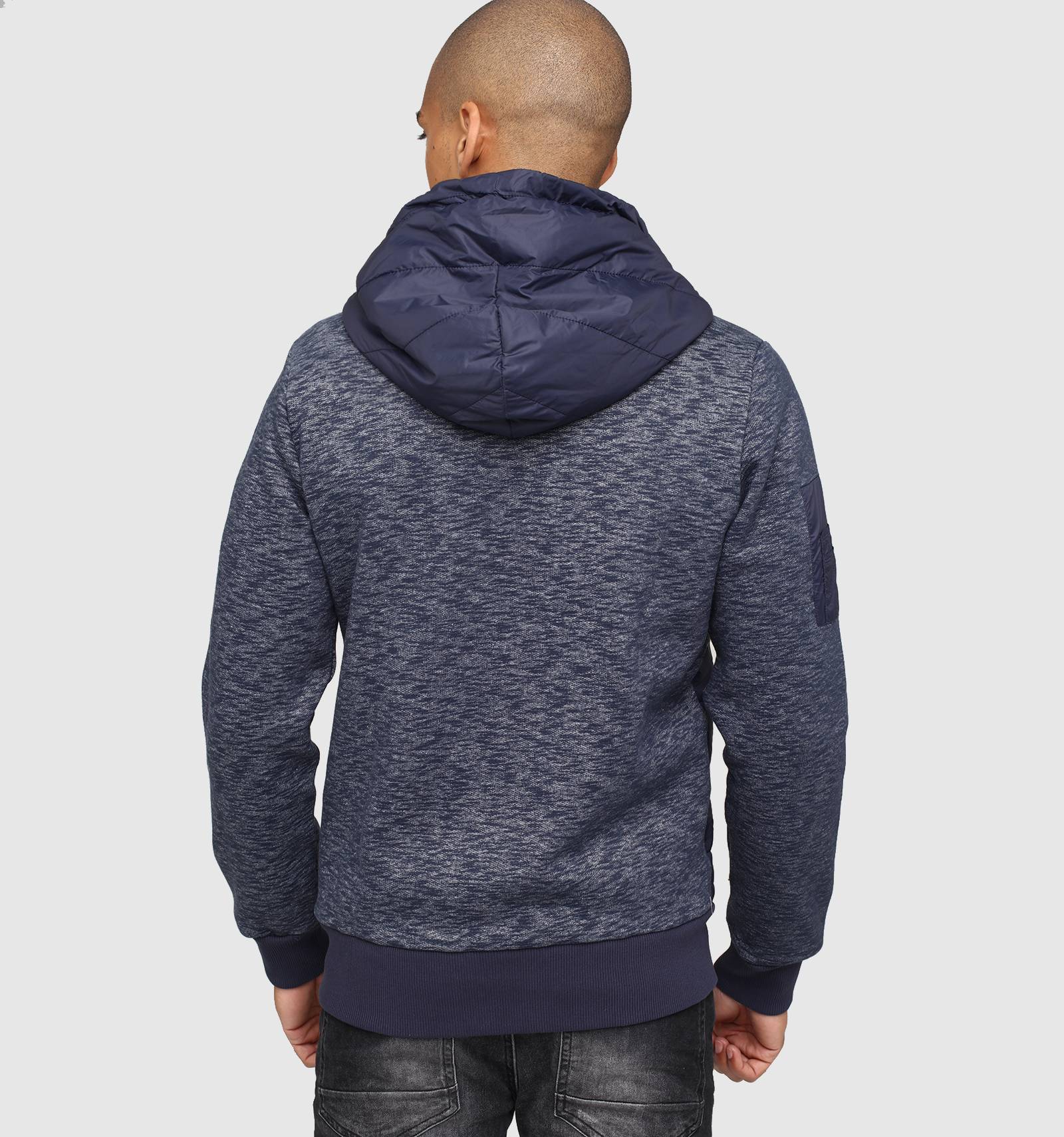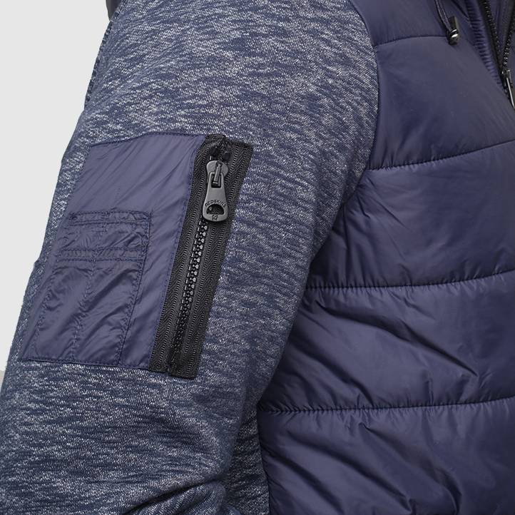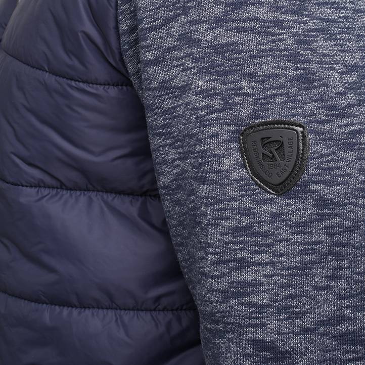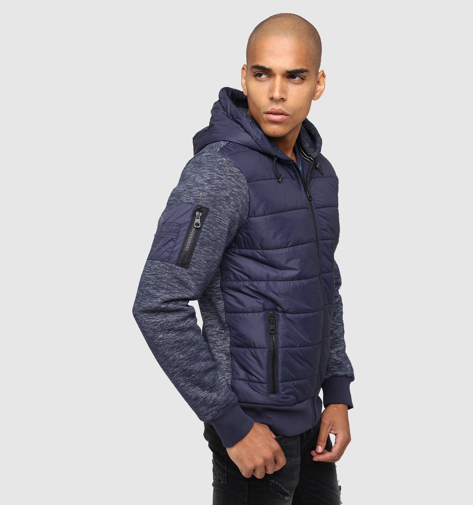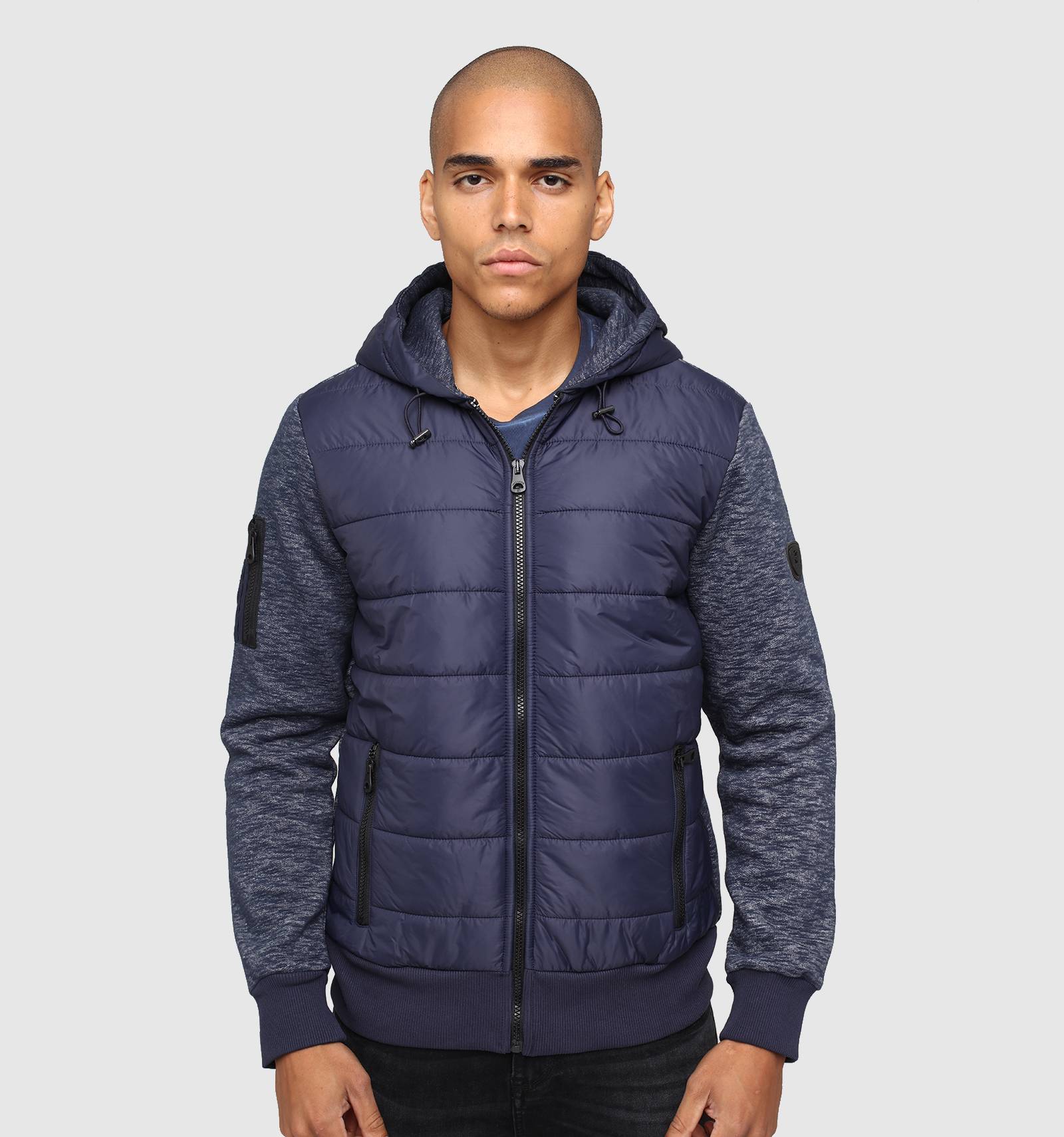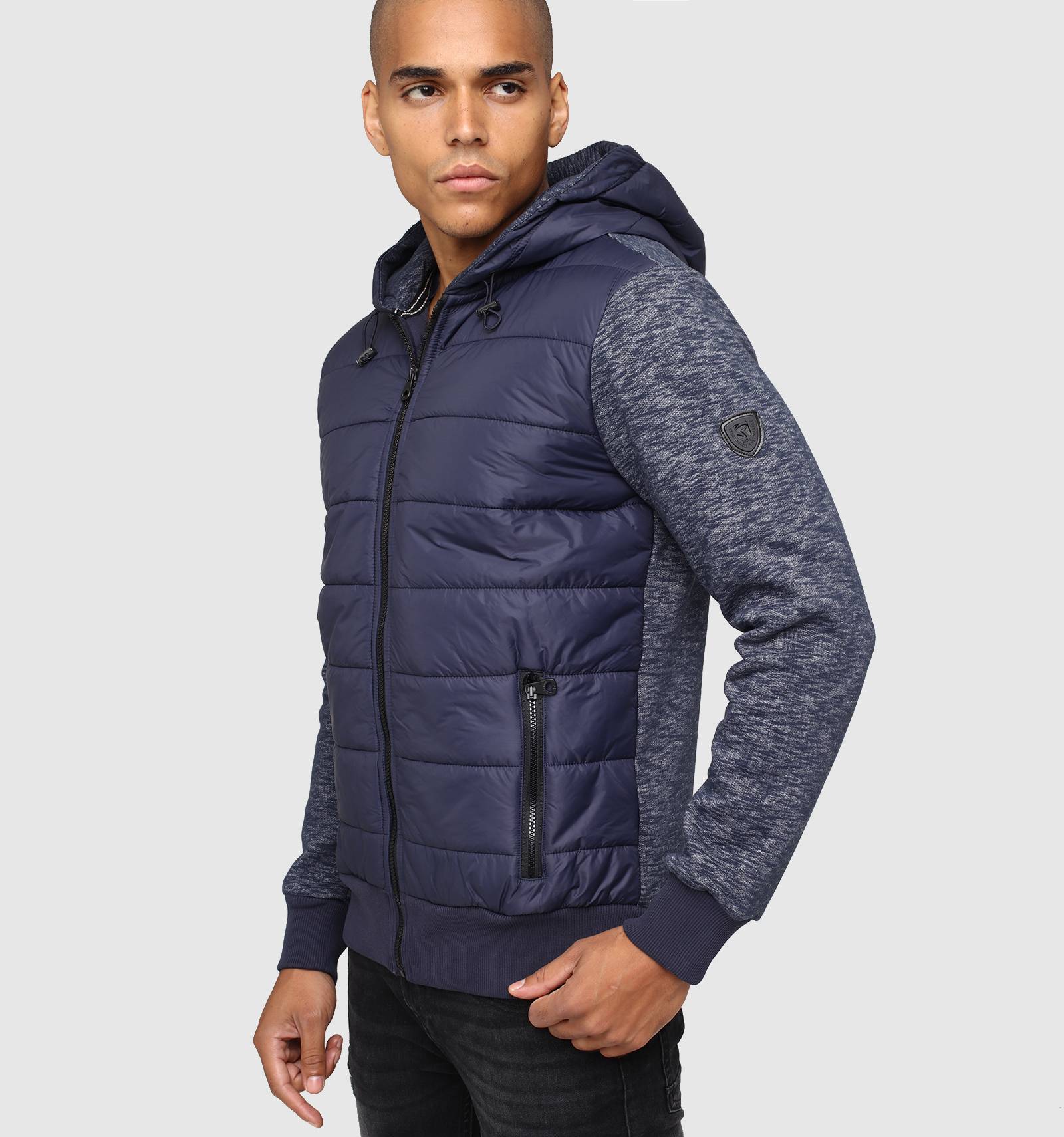 La veste à capuche bi-matière KAPA ICE est la pièce de mi-saison: associant le nylon et le molleton marine chiné, un effet matelassé orne le devant, du bord-côte à la taille et aux poignets apporte une allure cintrée et des poches à zip terminent ce vêtement au style inimitable.