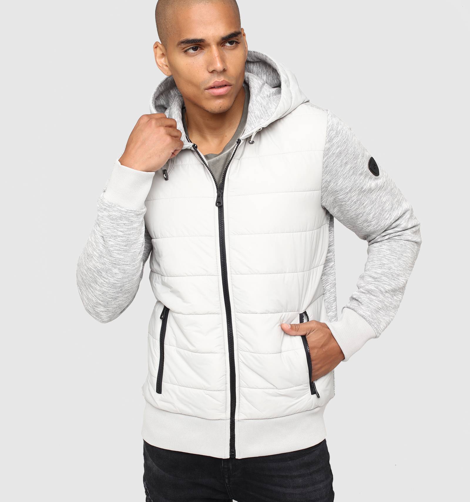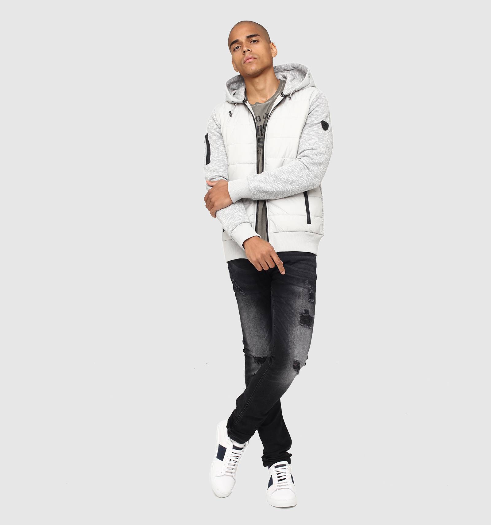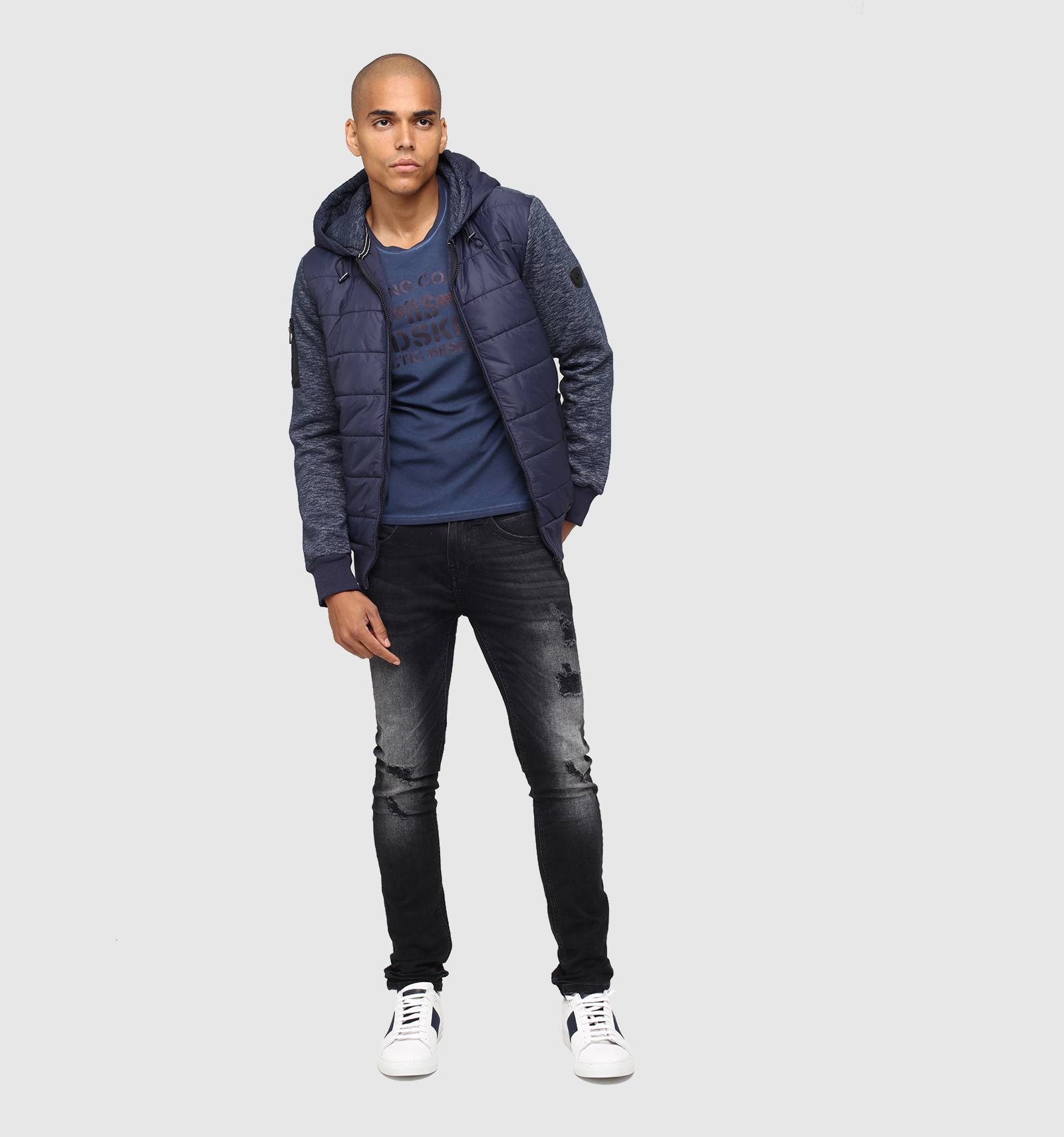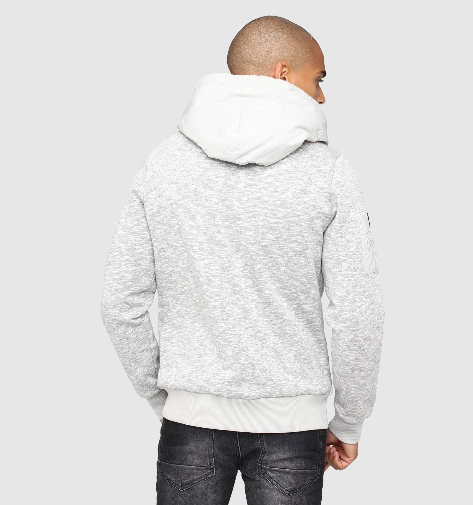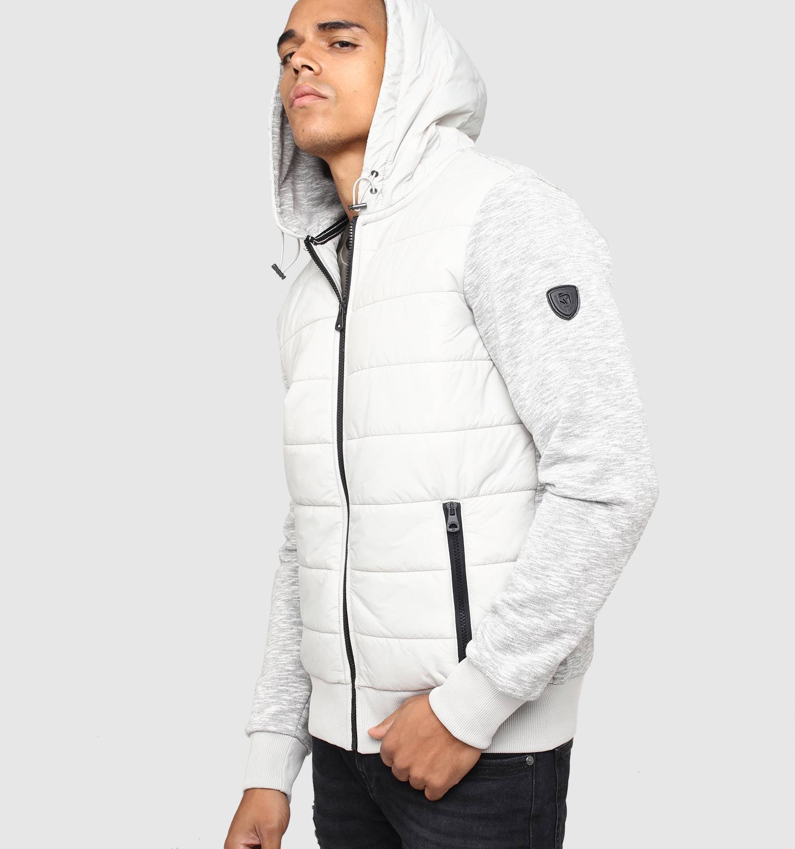La veste à capuche bi-matière KAPA ICE est la pièce de mi-saison: associant le nylon et le molleton marine chiné, un effet matelassé orne le devant, du bord-côte à la taille et aux poignets apporte une allure cintrée et des poches à zip terminent ce vêtement au style inimitable.