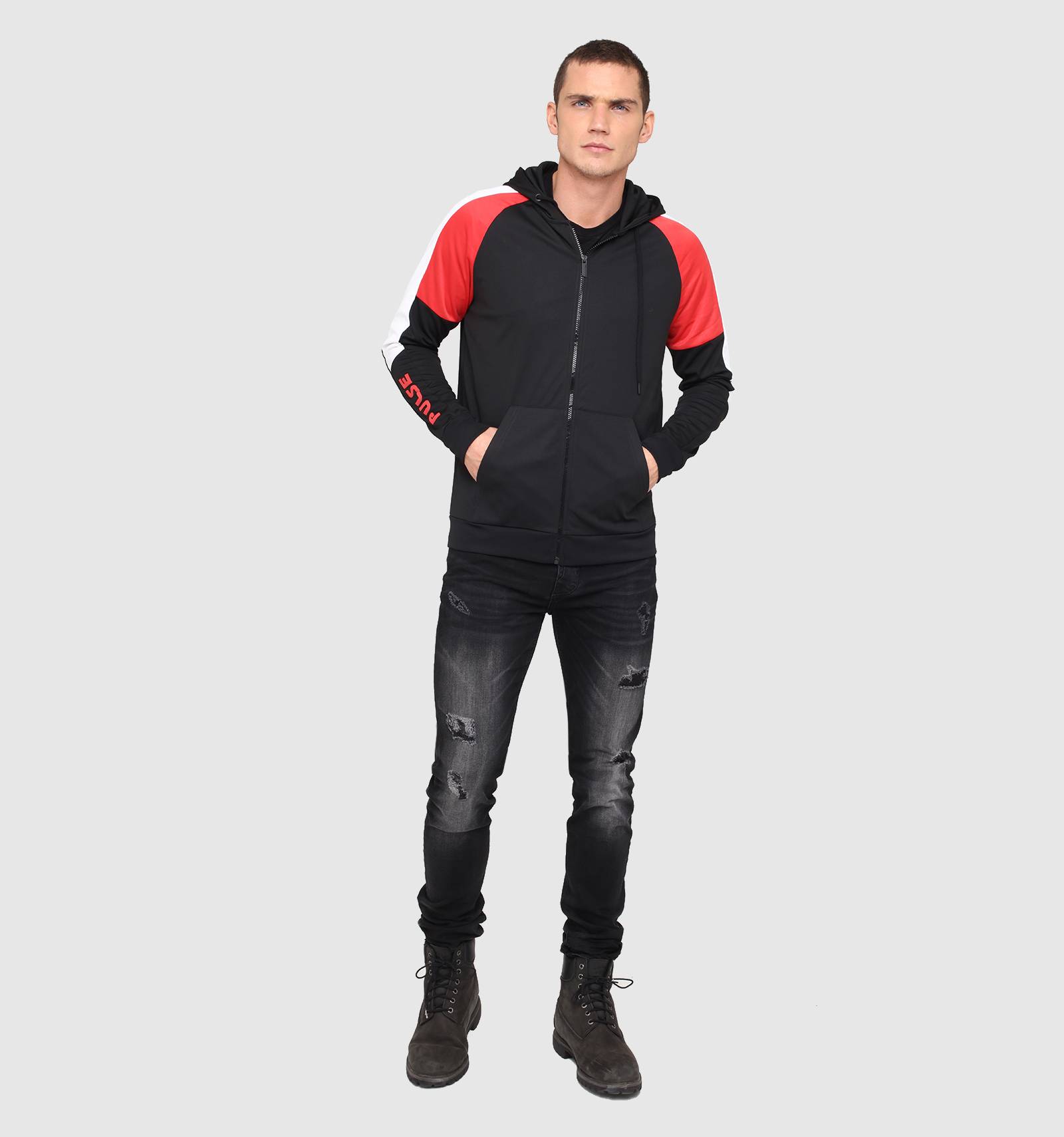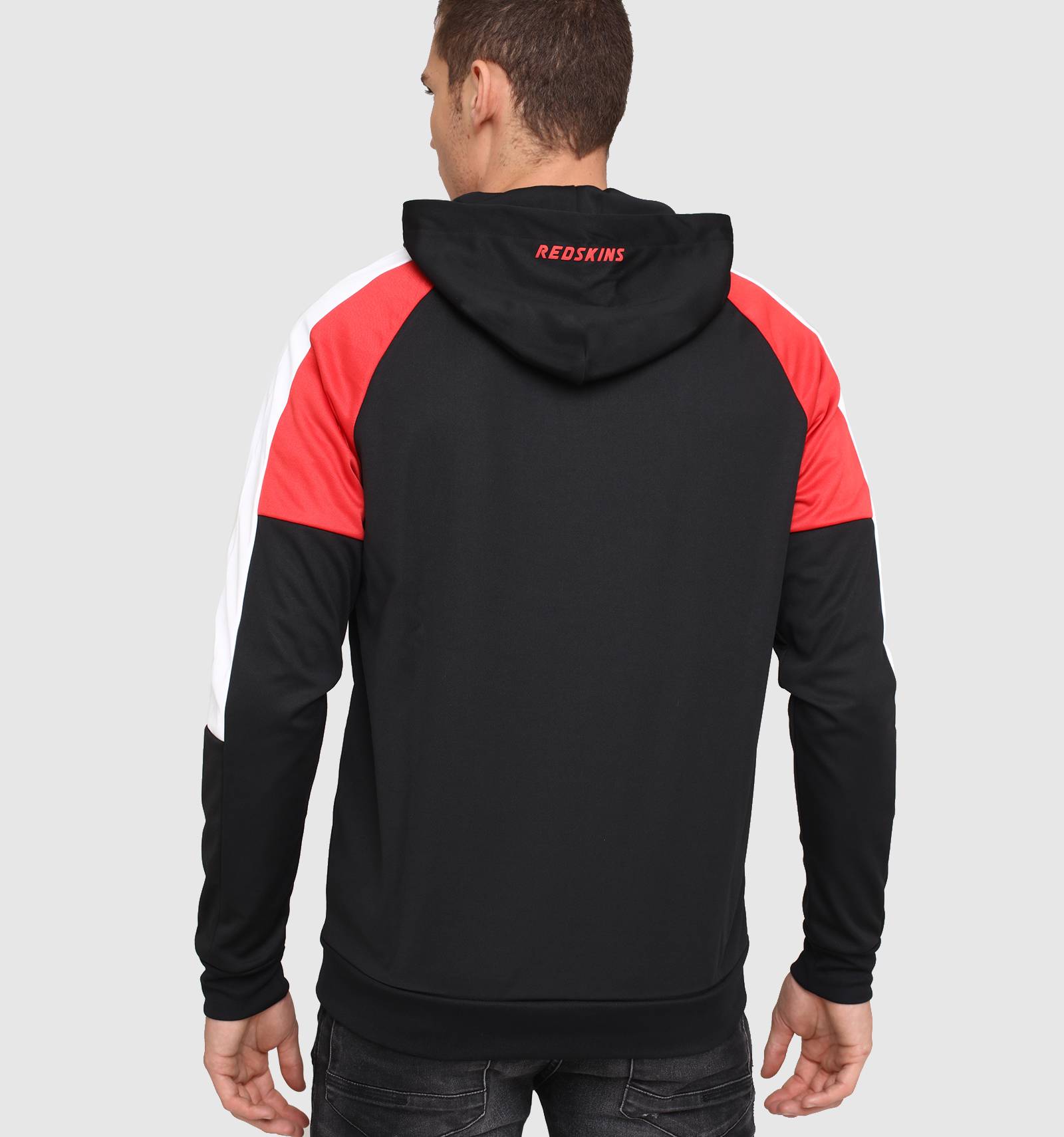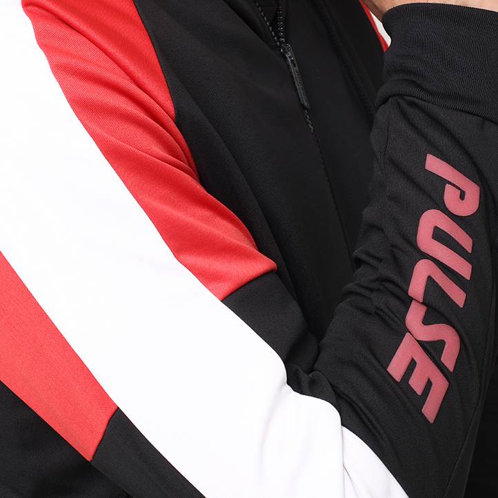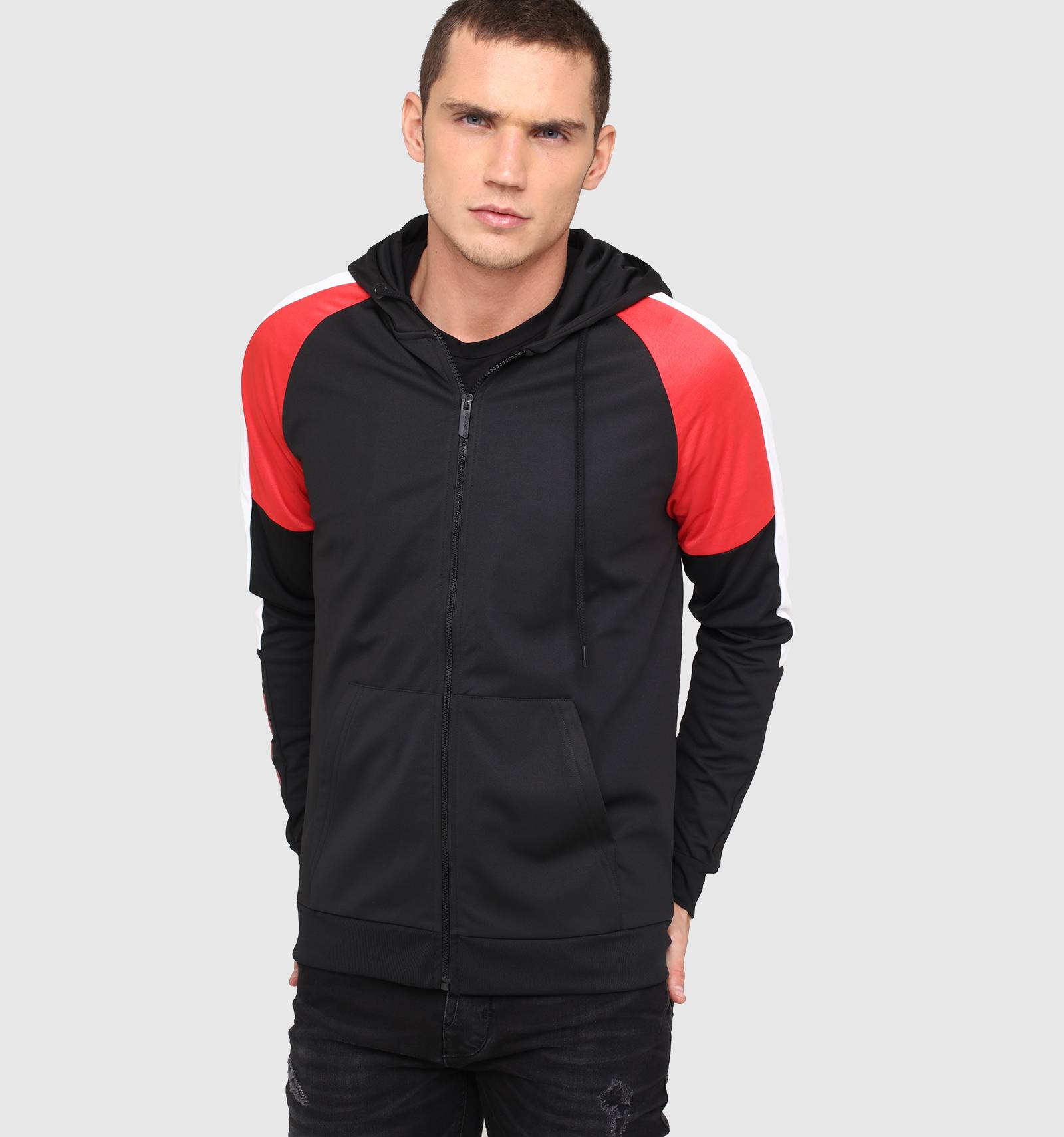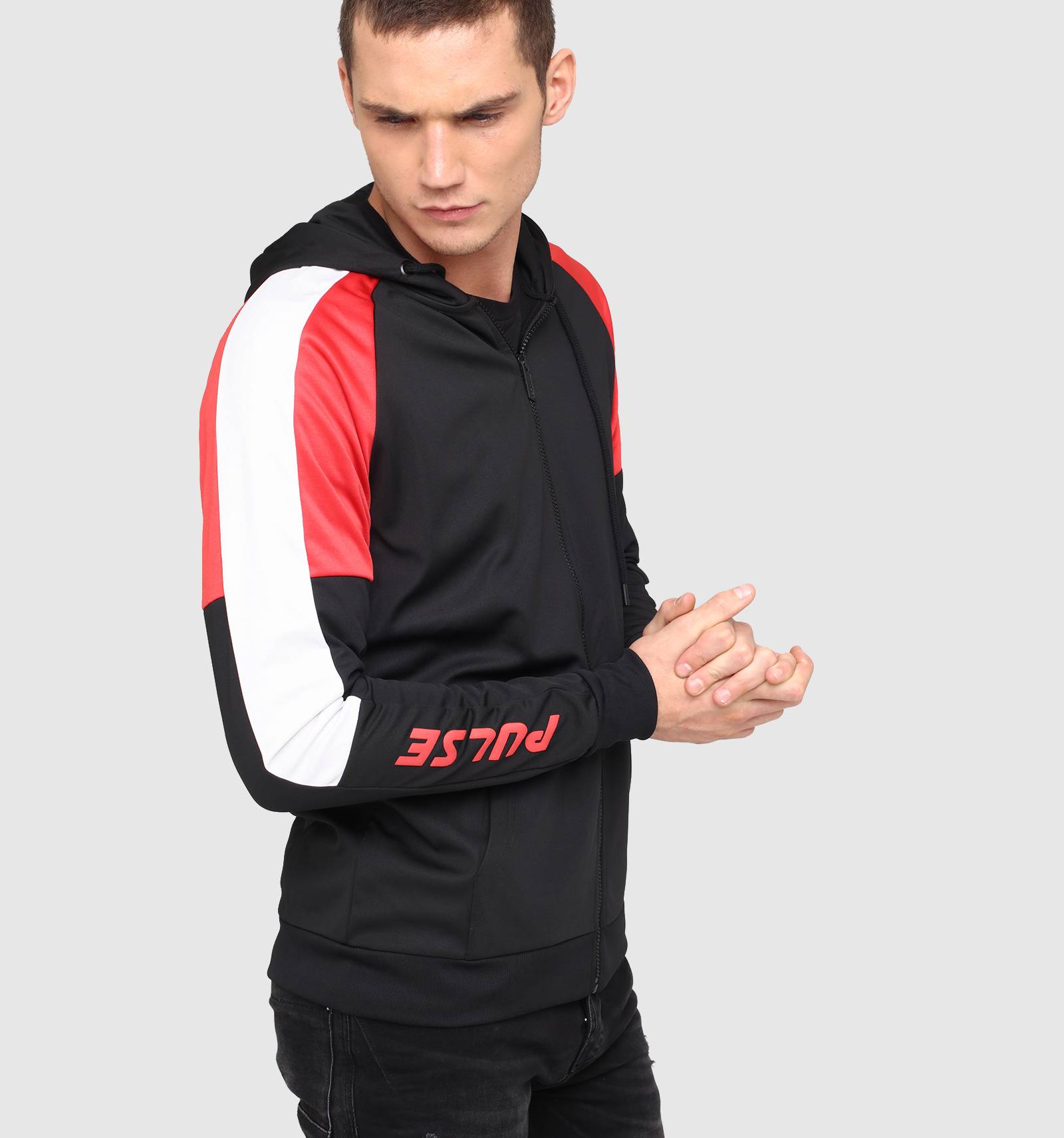 Le gilet à zip PARKER WEAVER en nylon noir, rouge et blanc est une revisite du vêtement de sport. Sa capuche avec cordon de serrage, sa fermeture éclair et ses poches ouvertes lui donnent une allure décontractée balancée par un jeu de couleurs et de formes.