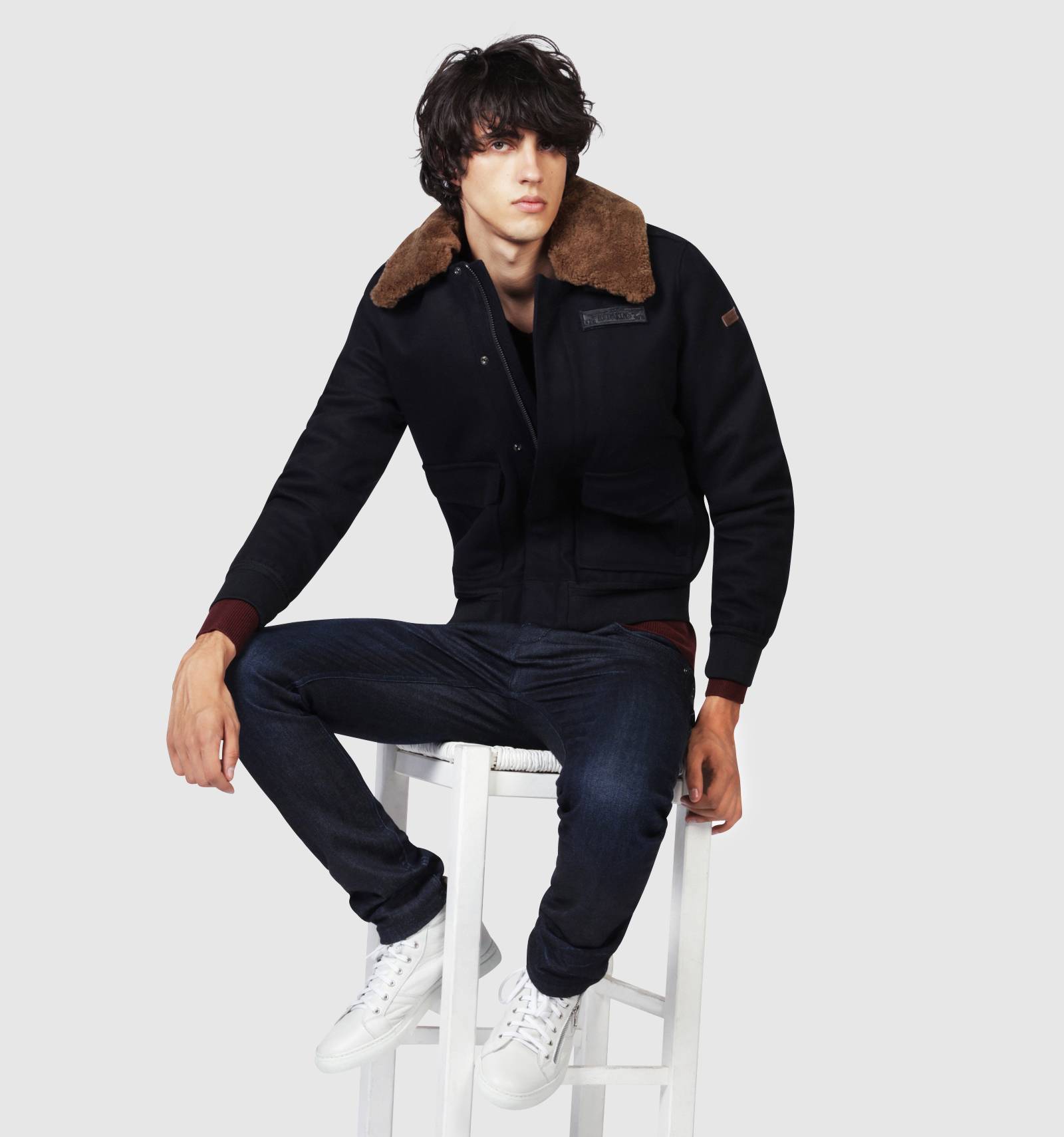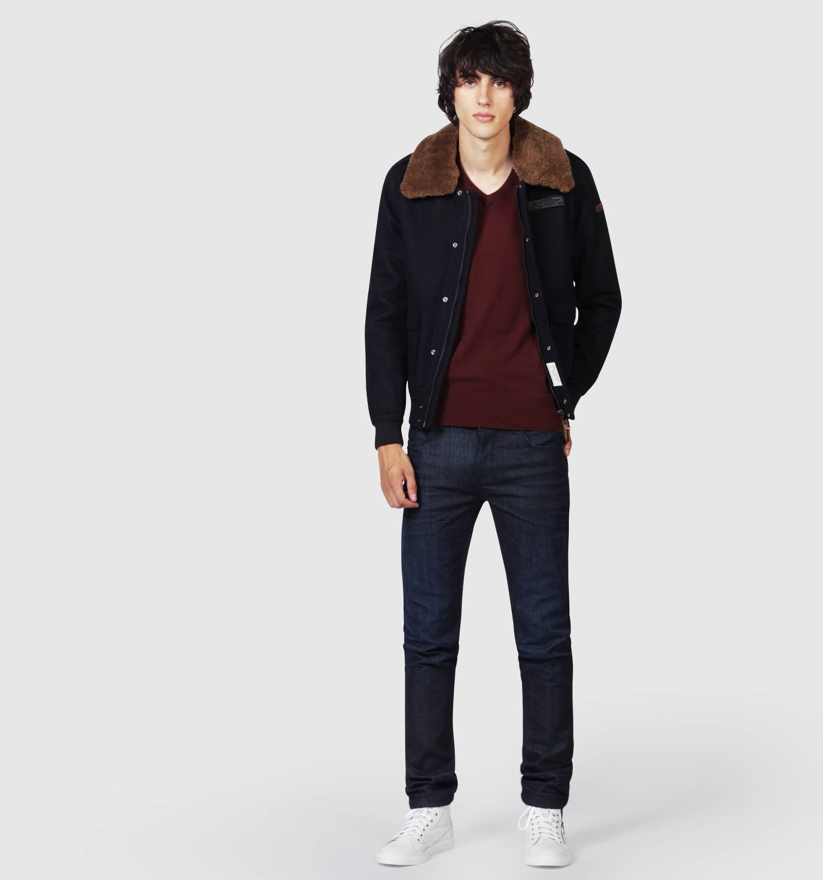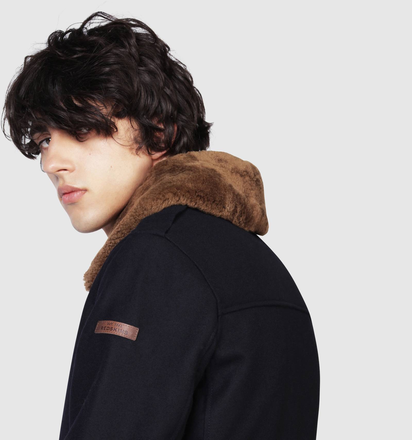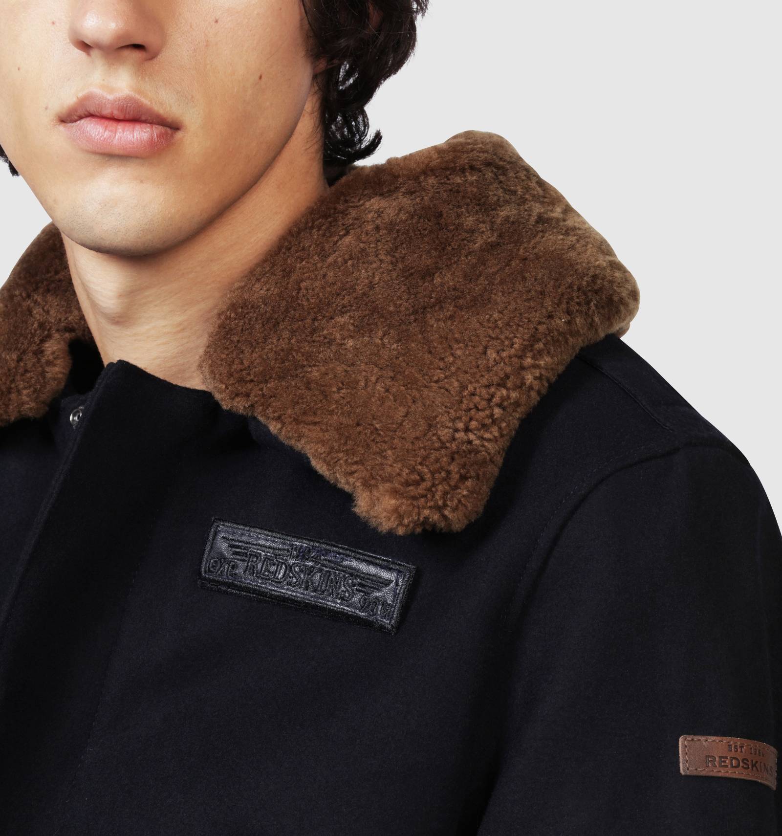 Sobre mais au caractre bien trempé, le SQUALUS SHETLAND en laine marine s'inspire du teddy et du blouson aviateur. Sa coupe se cintre par des poignets et une taille en bord-c™te, son allure interpelle par un col en fourrure marron et la signature de la maison REDSKSINS se retrouve ici et là au travers des écussons brodés.