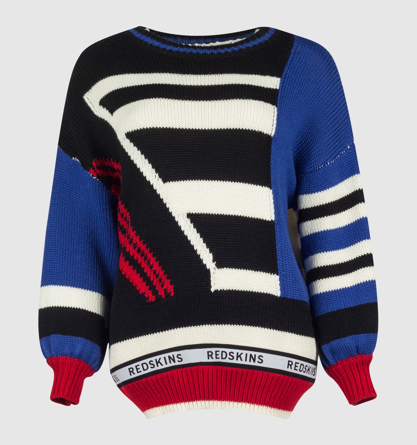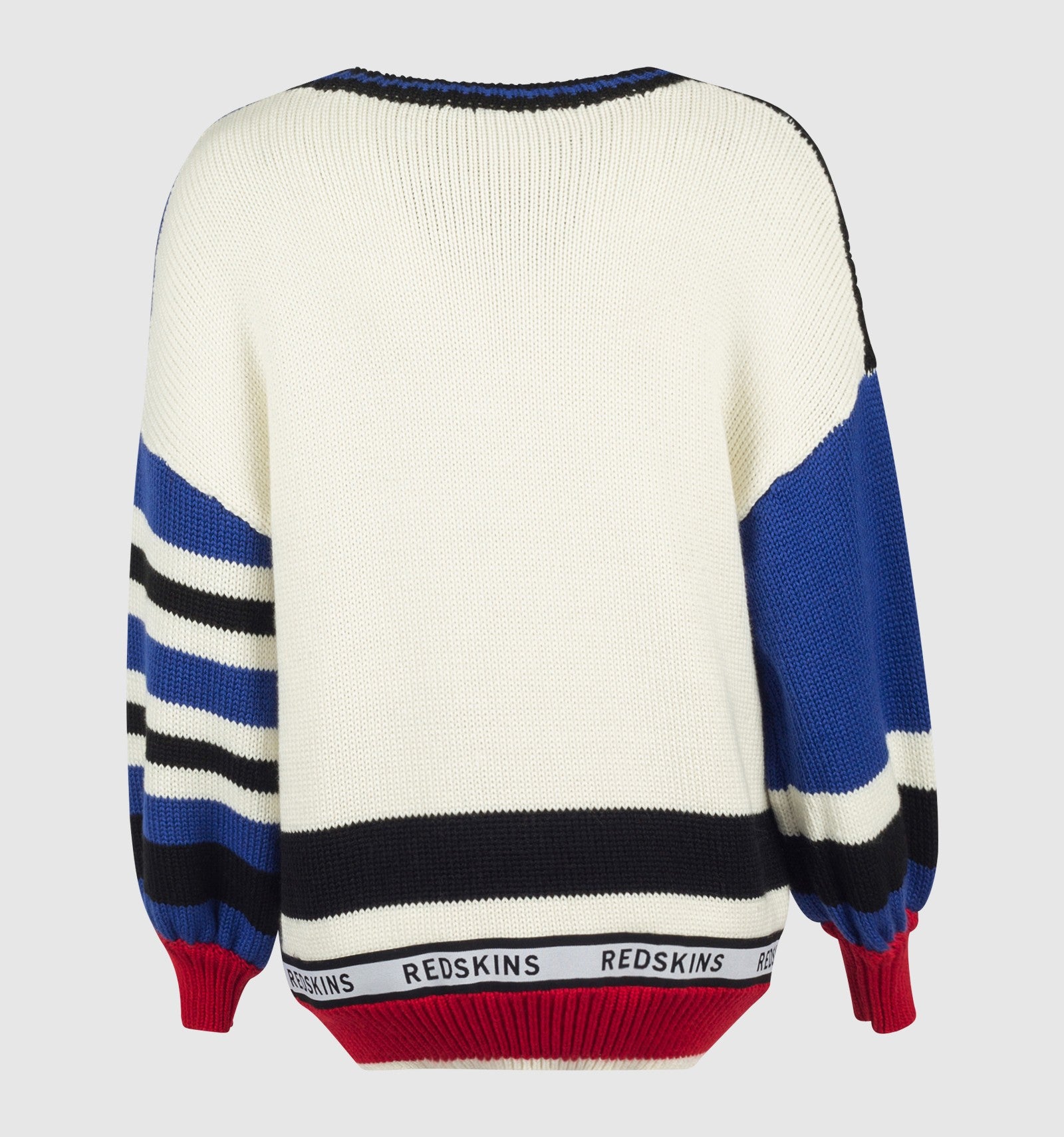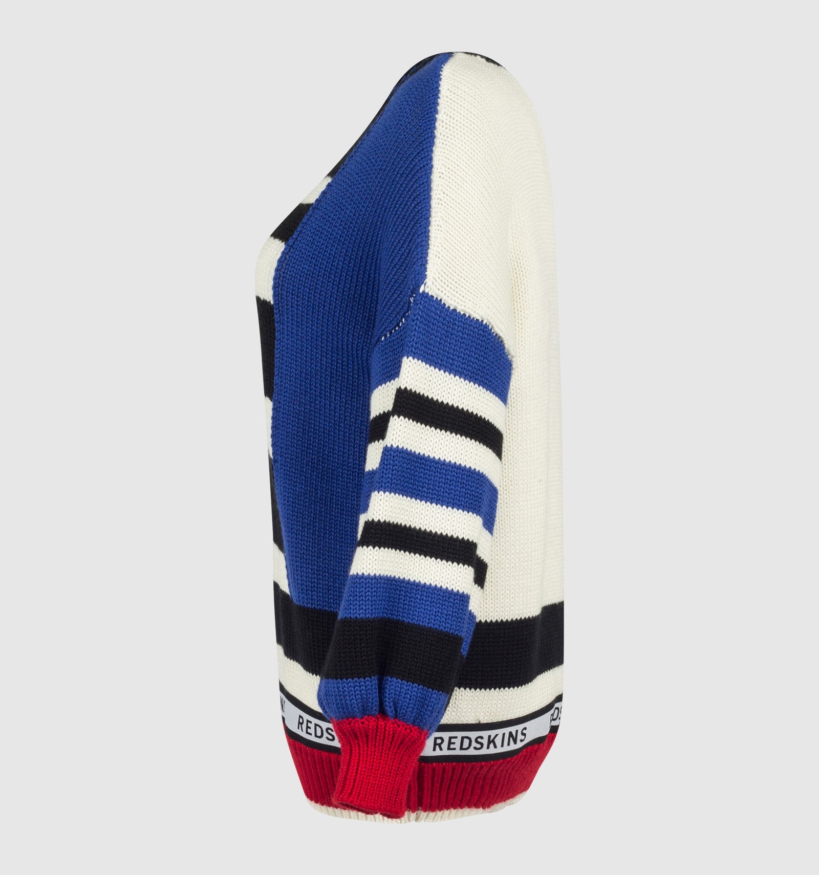 En exclusivité web, le pull loose à manches longues blanc cassé, noir, rouge et bleu WOOD EGO est idéal pour l'hiver.