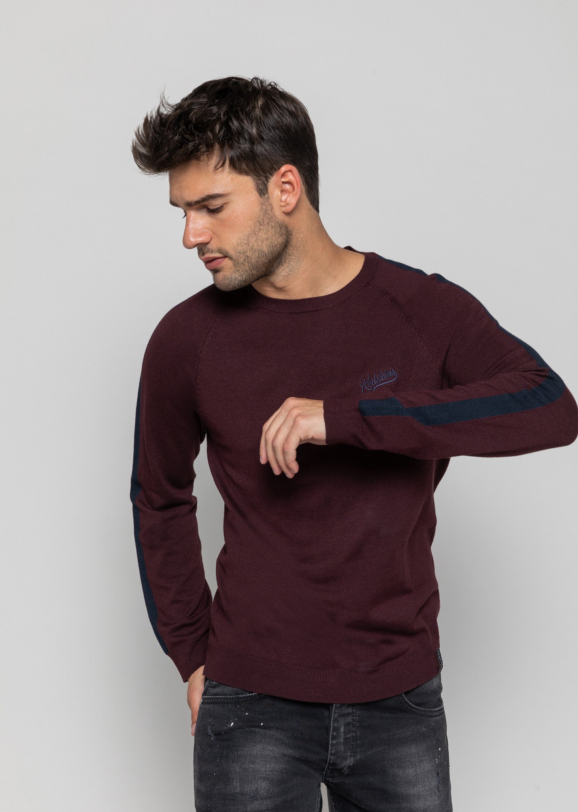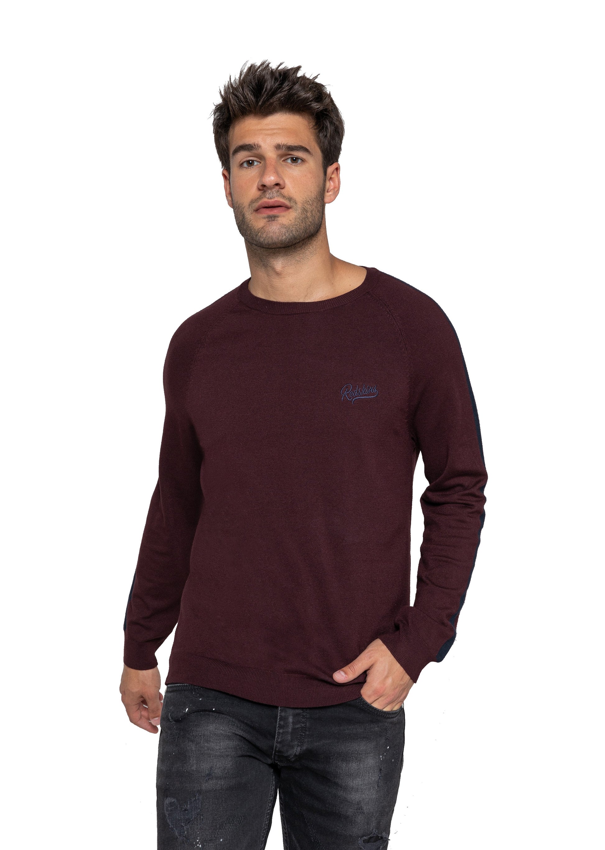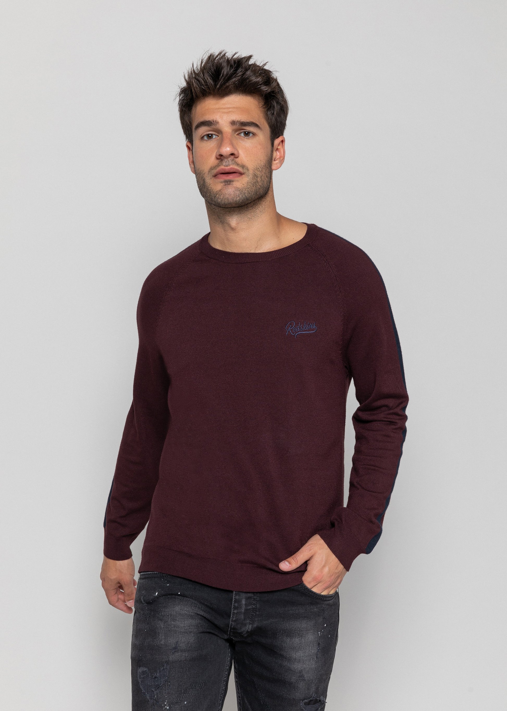 Le pull en maille CATCHY ELVIS est un classique aux détails modernes : un col rond bord côte, une bande contrastante le long de la manche mais aussi une broderie Redskins sur la poitrine. Composition : 80% VISCOSE - 20% nylon