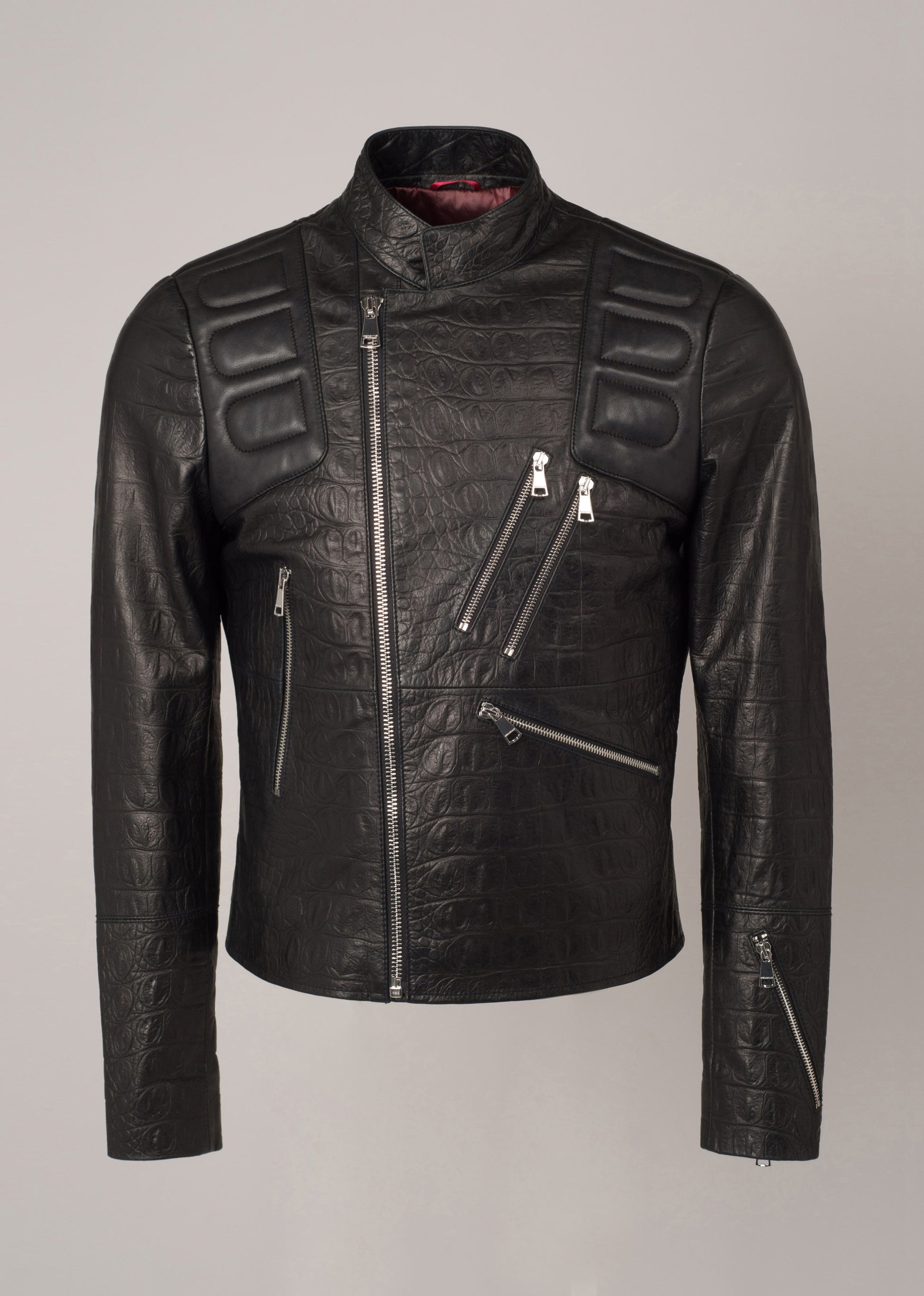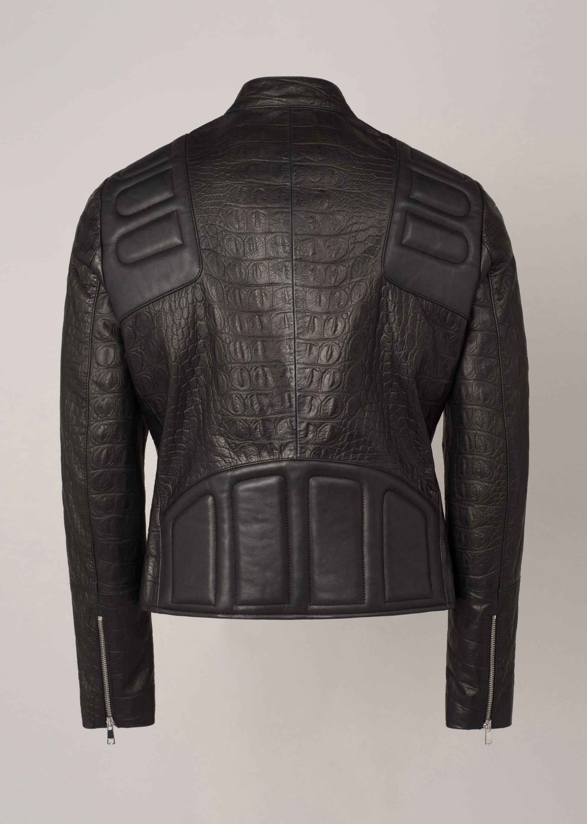 Blouson en cuir d'agneau KAYMAN CROCO, 4 zip côté face, zips sur les manches, fermeture éclair, col MAO à pression, travaillée façon croco, effet matelassée sur les épaules ainsi que le bas du dos.Composition : Cuir d'agneau