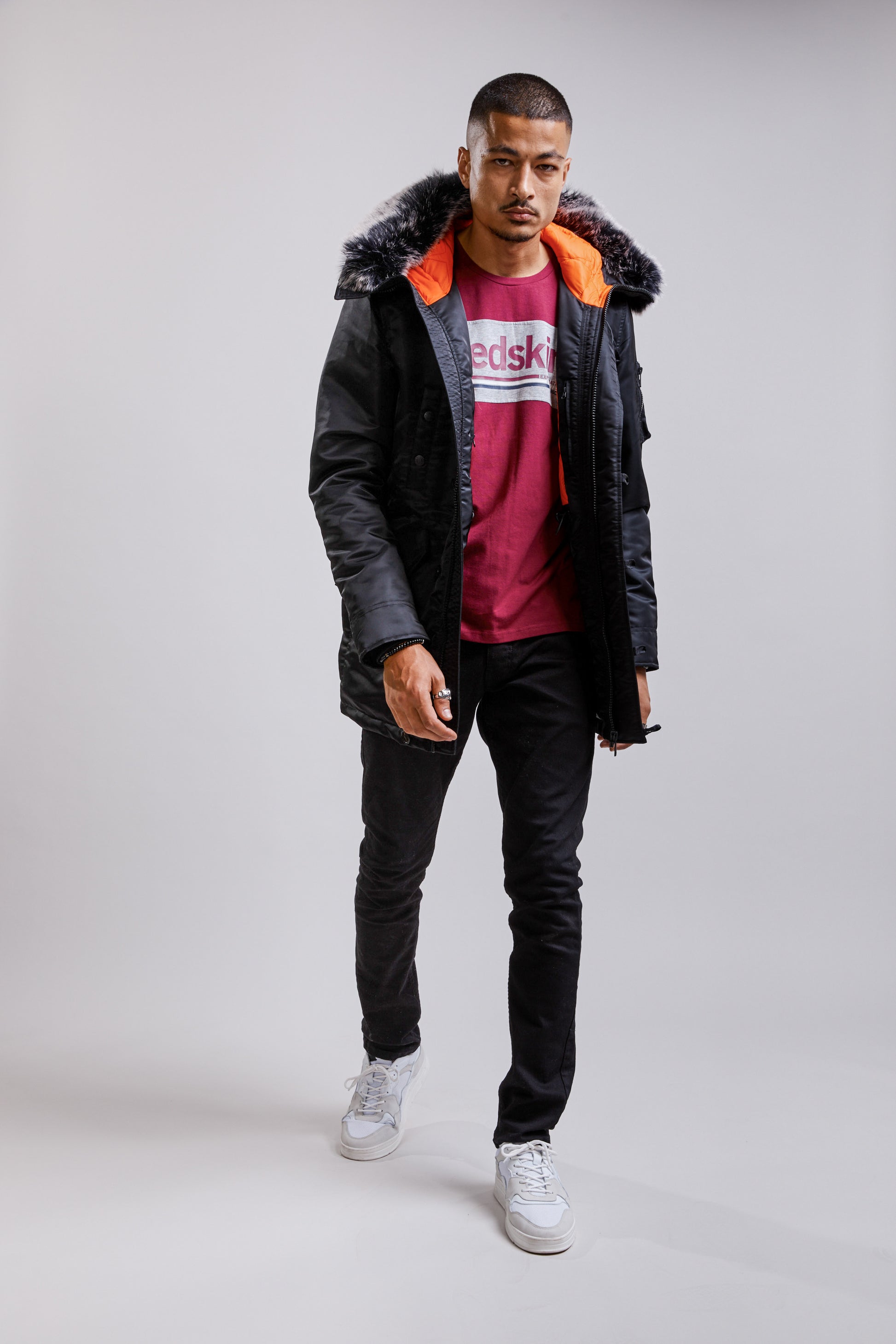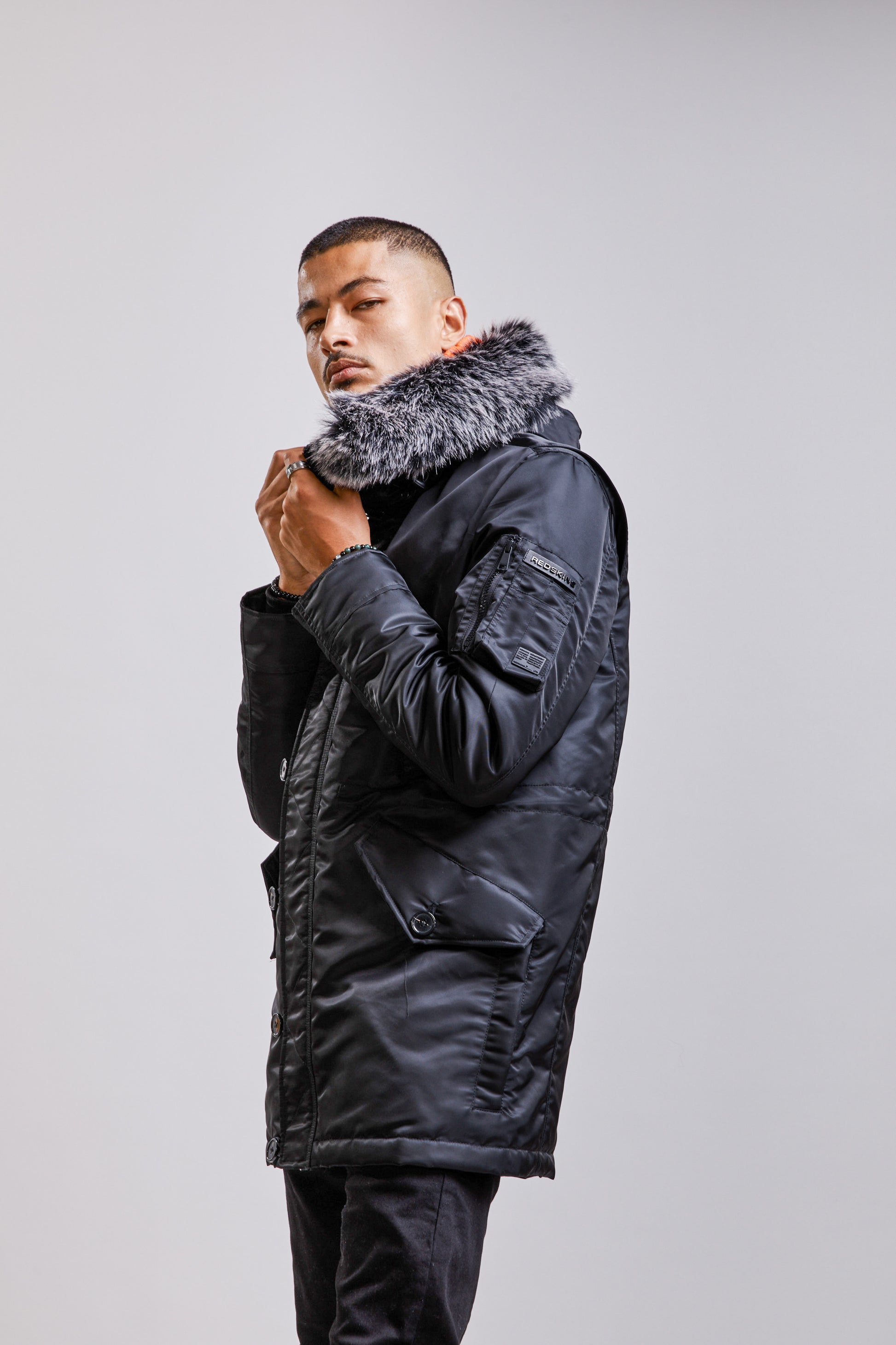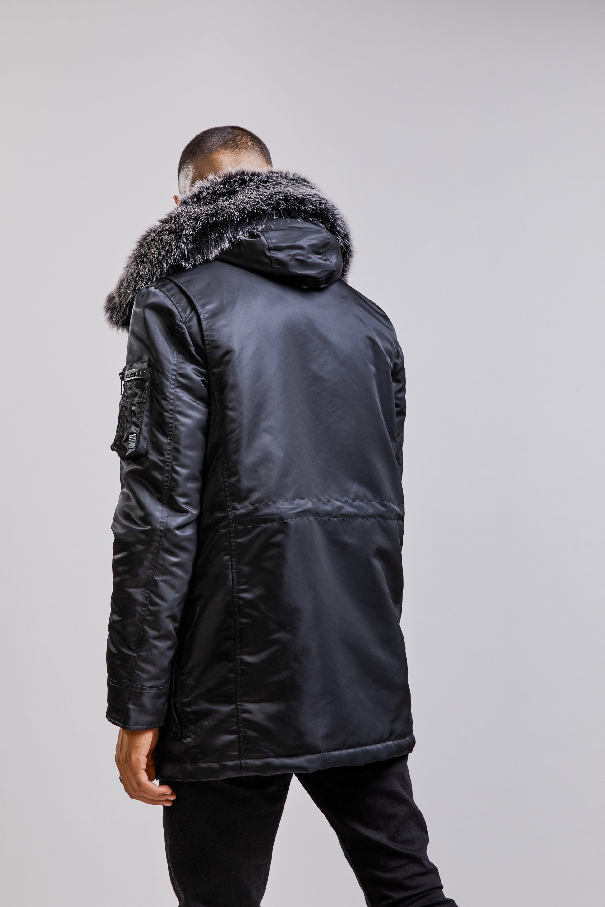 Ici la parka mi- longue BOEING STARFIGHTER indispensable pour l’hiver, ce blouson de coupe droite, s'ajustera à l'aide d'une fermeture sous-patte zippée avec pressions, il est munie d'une capuche bordée de 2 fourrures synthétiques amovibles (Une ton sur ton noire et une blanche contrastante), d'un col montant, de manches longues dont une ornée d'une surpiqûre zippée.