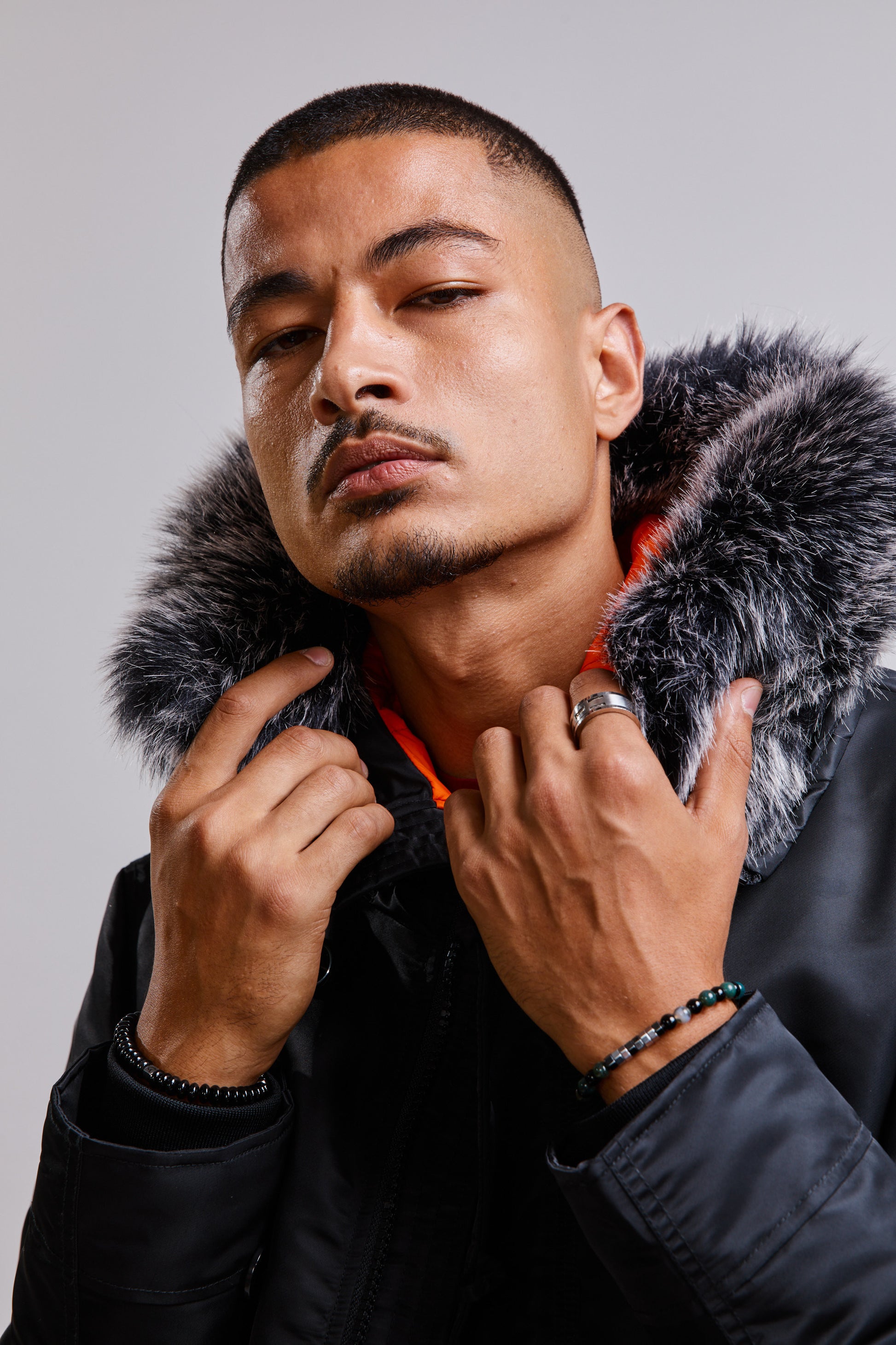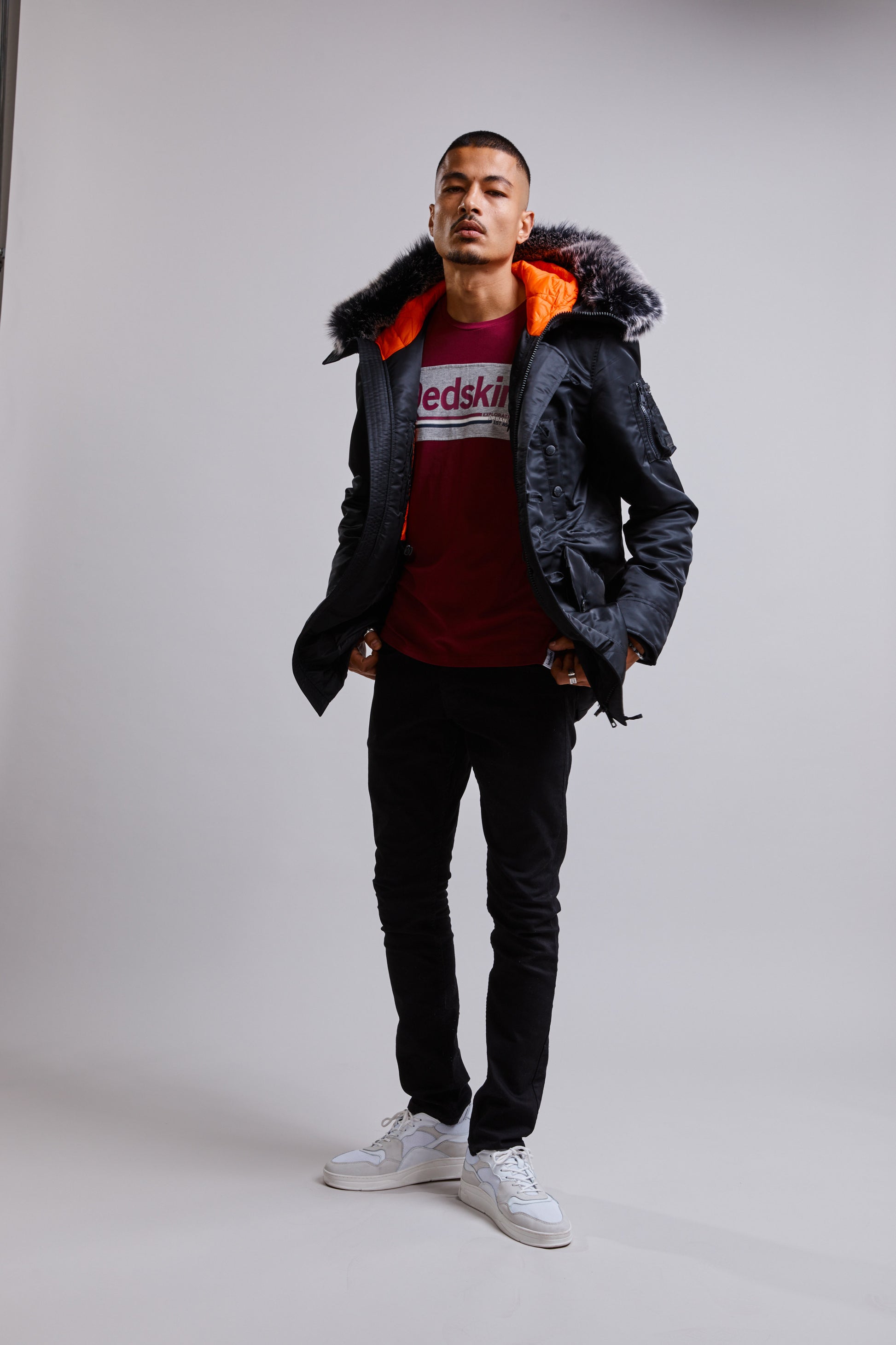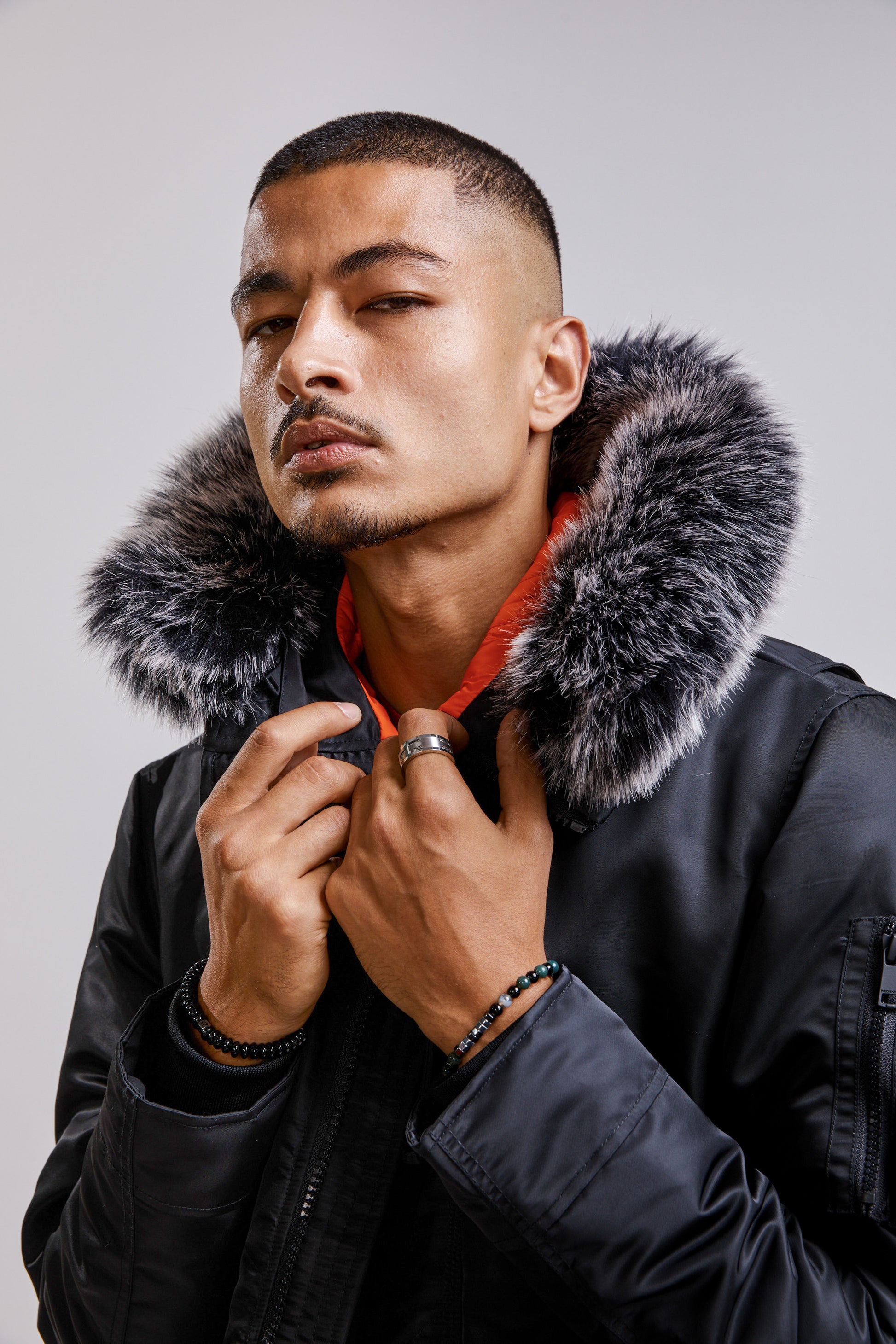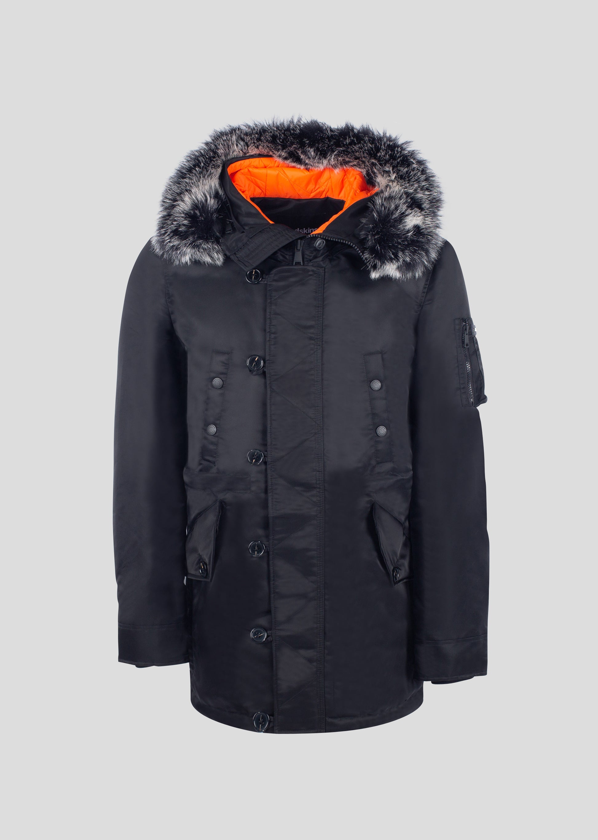 Ici la parka mi- longue BOEING STARFIGHTER indispensable pour l’hiver, ce blouson de coupe droite, s'ajustera à l'aide d'une fermeture sous-patte zippée avec pressions, il est munie d'une capuche bordée de 2 fourrures synthétiques amovibles (Une ton sur ton noire et une blanche contrastante), d'un col montant, de manches longues dont une ornée d'une surpiqûre zippée.