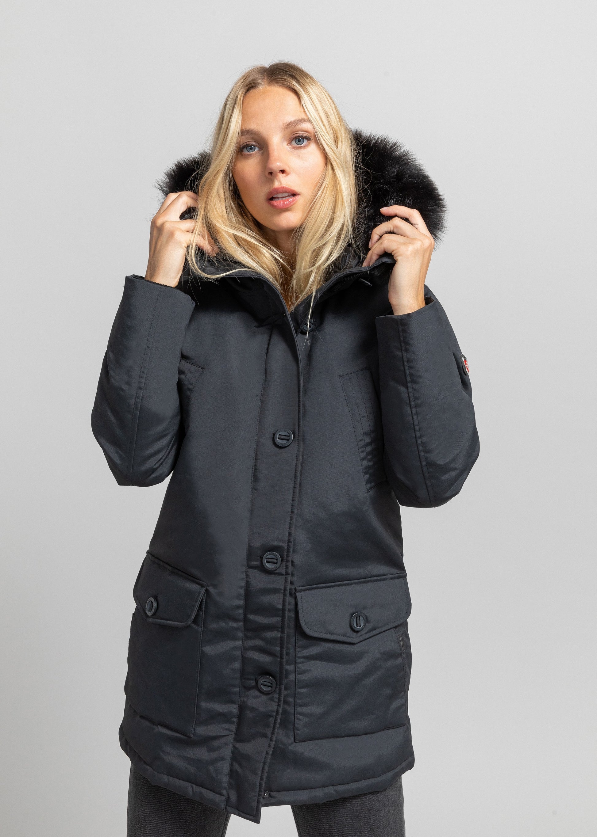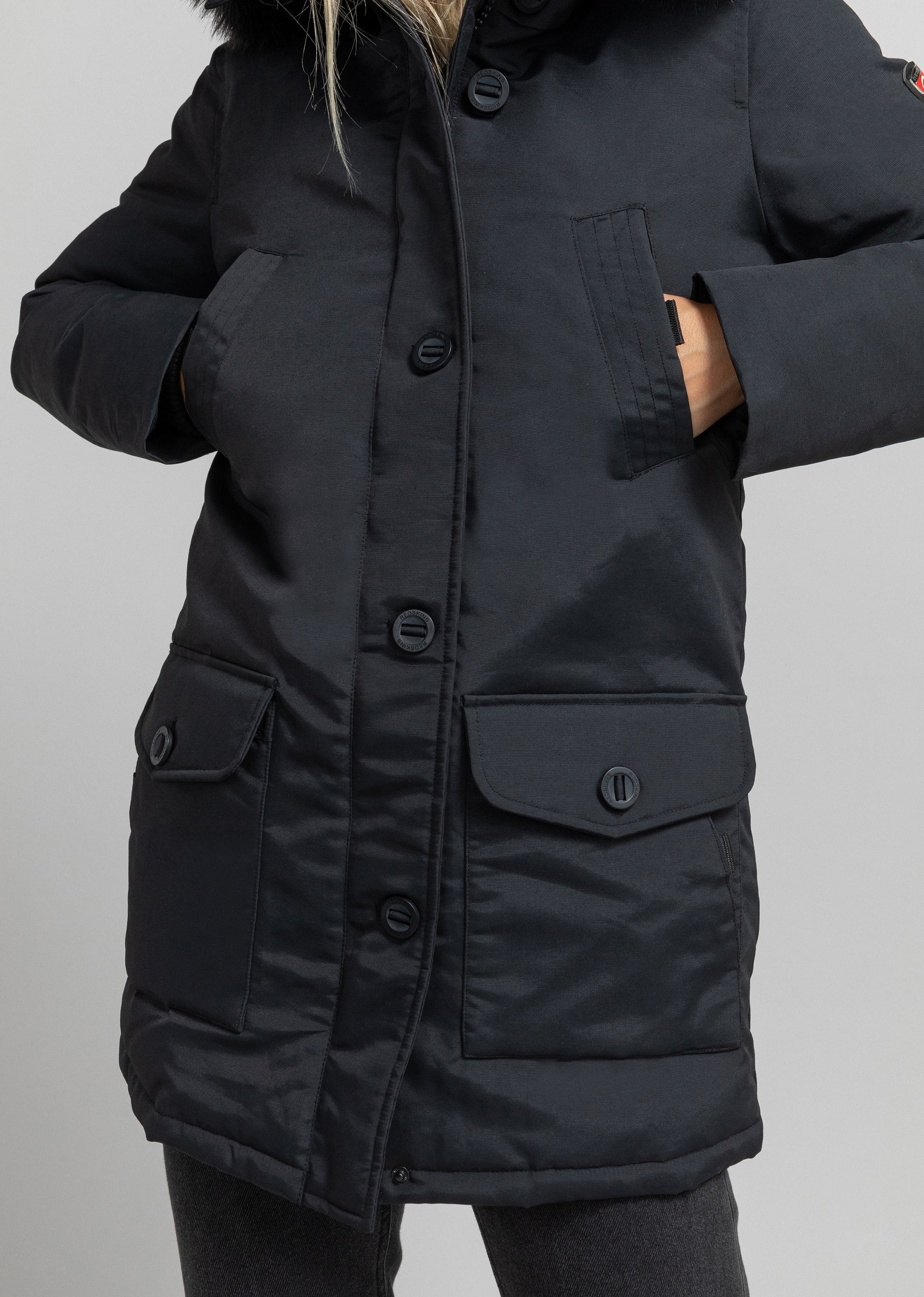 La doudoune en nylon STANCY PARAMOUNT séduit par des touches féminines: une capuche ornée d'un pourtour en fourrure contrastante, du bord-côte aux poignets, des poches à rabats boutonnés ainsi qu'un ourlet en bas, ultime raffinement de cette pièce hivernale. Elle dispose également d'une fermeture par zip accompagnée d'un patte de boutonnage. Composition : 100% Nylon