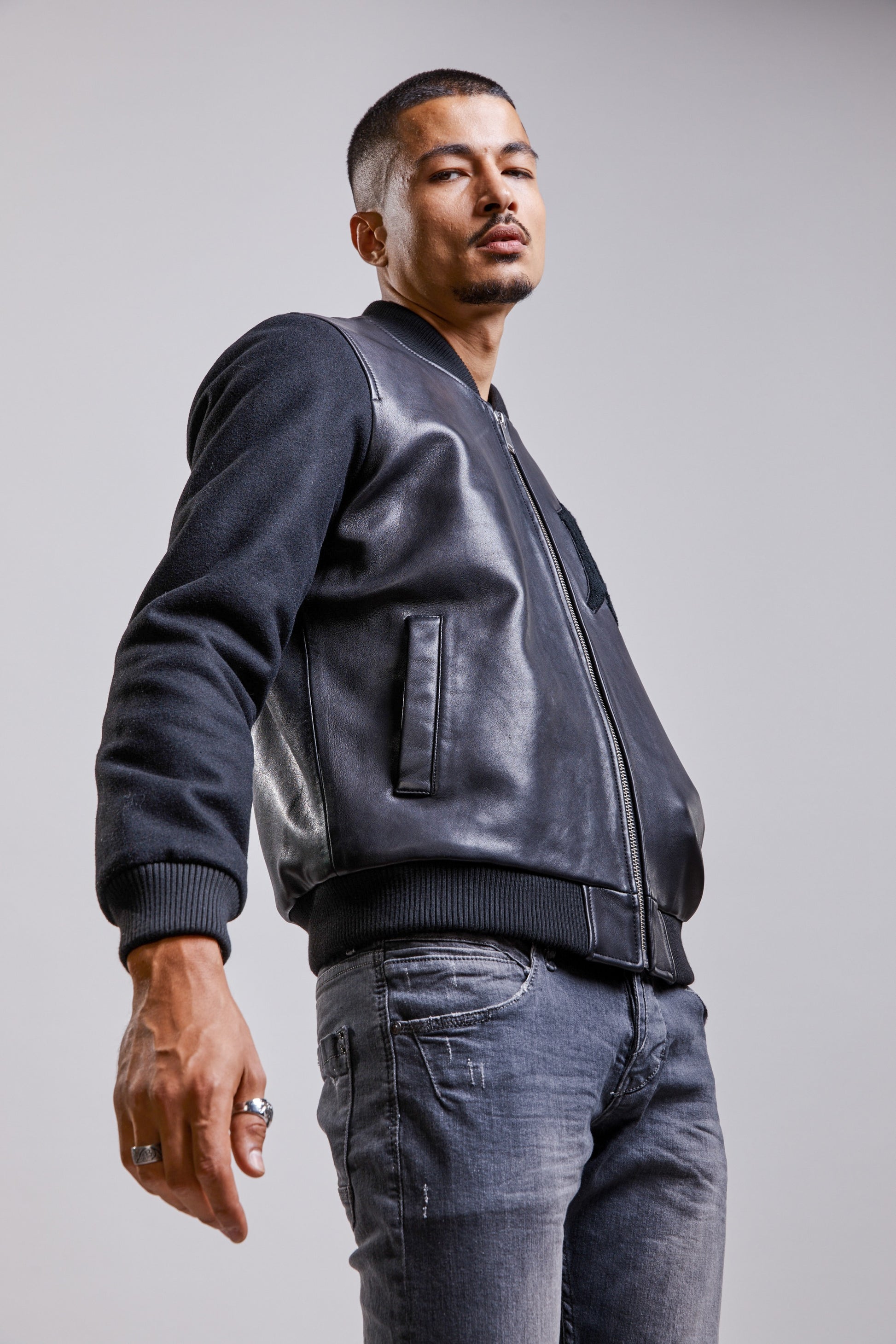 Le bomber SWAG BENTLEY a été confectionné en cuir d'agneau piqué d'empiècements en laine, ton sur ton. Sa coupe impeccable est sublimée de détails épurés : col, poignets et taille en maille côtelée associés à des manches longues ainsi qu'à des poches coupées à un passepoil sur les côtés.