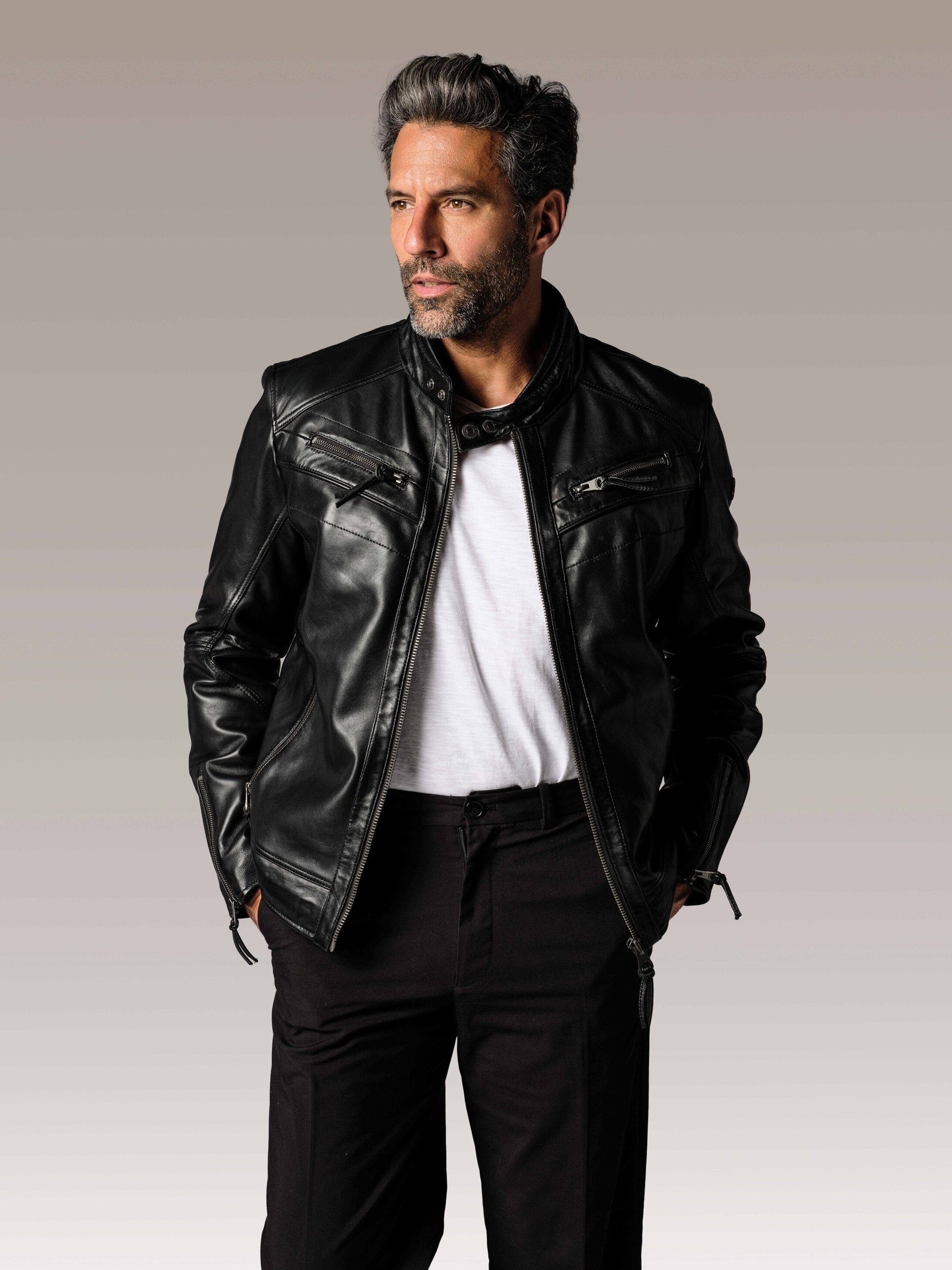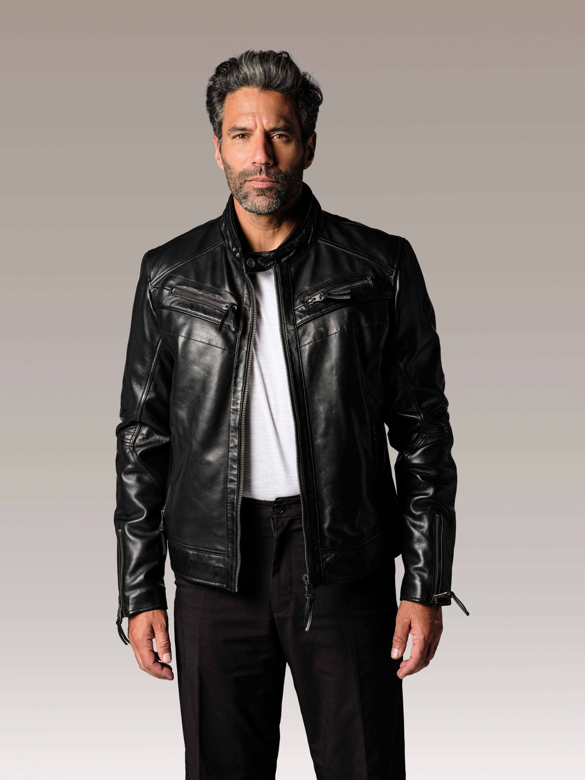 Le blouson en cuir DRAKE HOLSTER, au style motard, est orné d'un col à pression, de surpiqures, de 2 poches zippées à la poitrine et de 2 poches en biais, zippées sur les côtés. Les manches arborent de longs zips. Le dos dispose également de surpiqures pour un style affirmé. Composition : Cuir d'agneau Cuir d'agneau